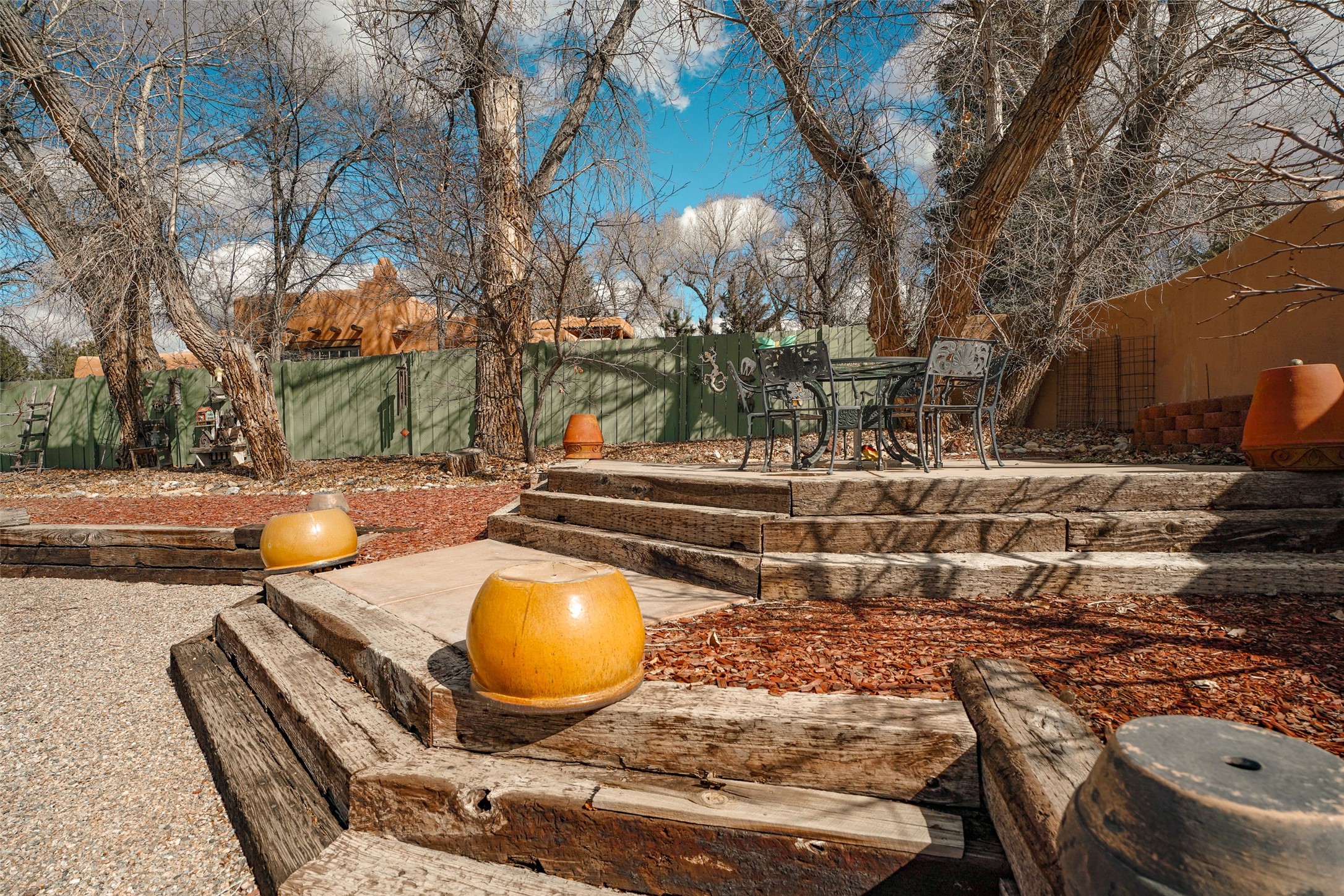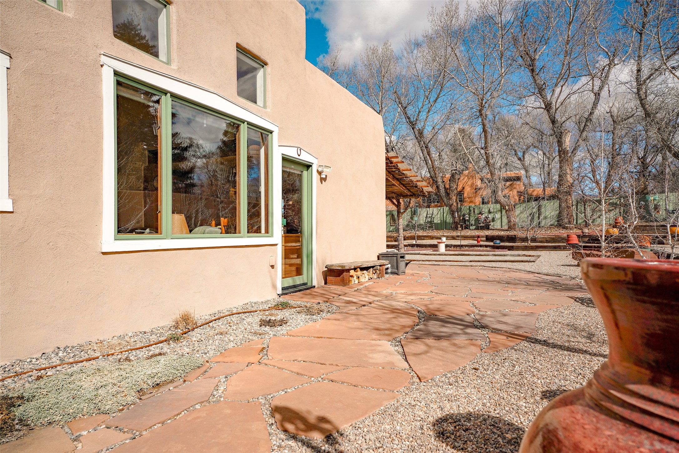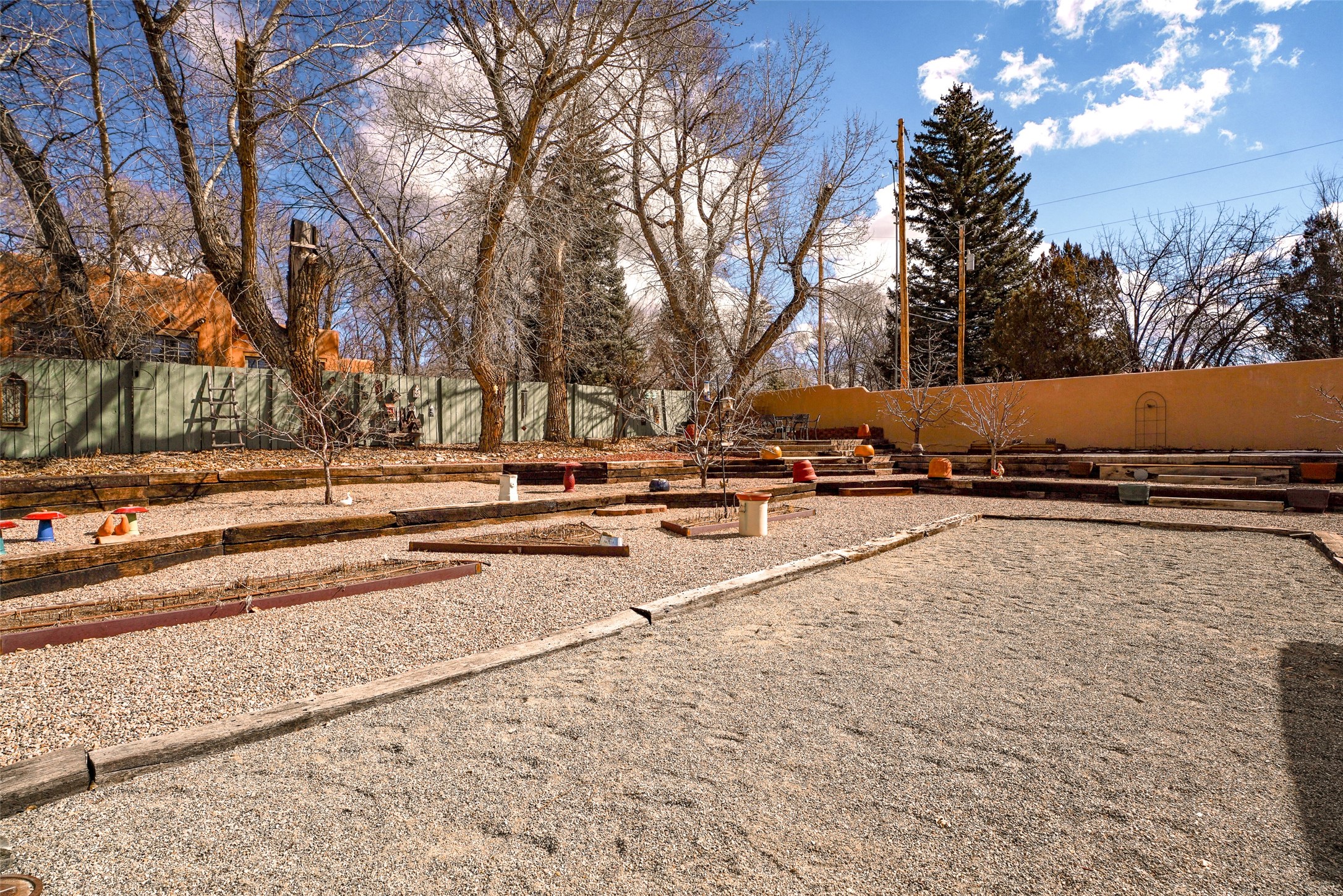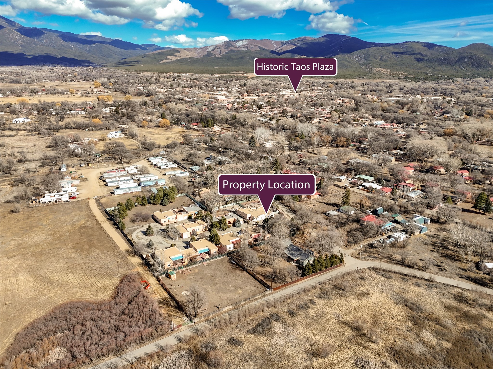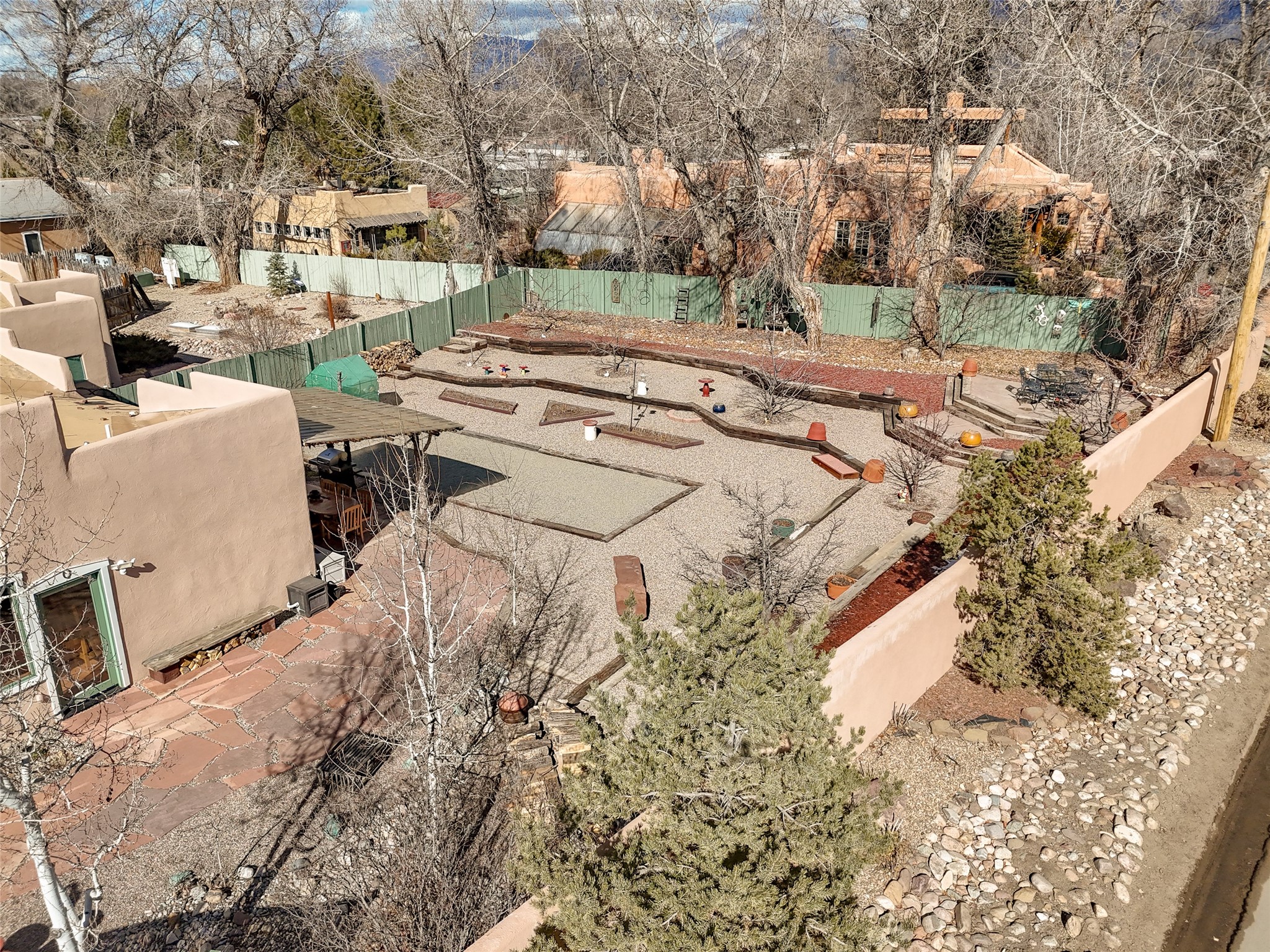One of a kind 3BD/2BA extensively upgraded condo offering approx. 1,475 SF of light-filled living that feels more like a private patio home. This thoughtfully designed residence features soaring ceilings, abundant windows with views from every room, and a warm Southwestern aesthetic anchored by a beautiful kiva-style fireplace. The open living, dining, and kitchen areas create an inviting flow ideal for everyday living or entertaining, while a dedicated office space and utility/laundry room add functionality. Step outside to a large, professionally xeriscaped backyard, once unfinished and now transformed into a serene outdoor retreat. Enjoy a covered portal, mature fruit trees, raised garden beds, and a bocce court--perfect for relaxing or hosting guests. The outdoor space is both private and low maintenance, enhanced by natural landscaping and screened utility areas. Additional highlights include an oversized insulated garage,approximately 400 SF of non-freezing attic storage, and a spacious primary suite with a walk-in closet. Located within a well-maintained 10-unit subdivision featuring a shared common orchard over 1-acre, this home offers a rare combination of privacy, community, and outdoor enjoyment. Recent community-wide stucco repairs and repainting completed in 2025 add peace of mind. Conveniently located just minutes from town amenities and approximately 40 minutes to Taos Ski Val, this is a truly special Taos offering with extensive upgrades throughout.