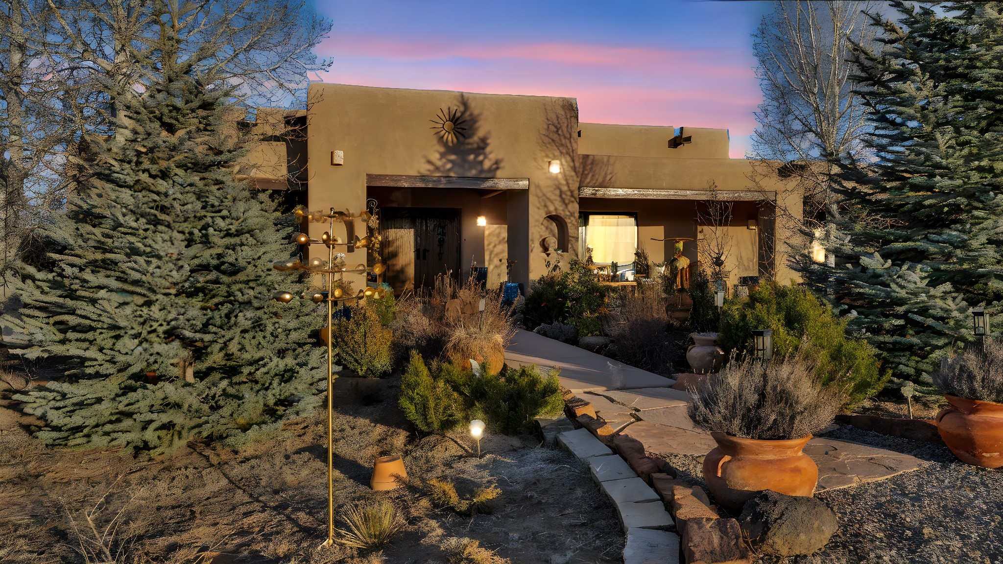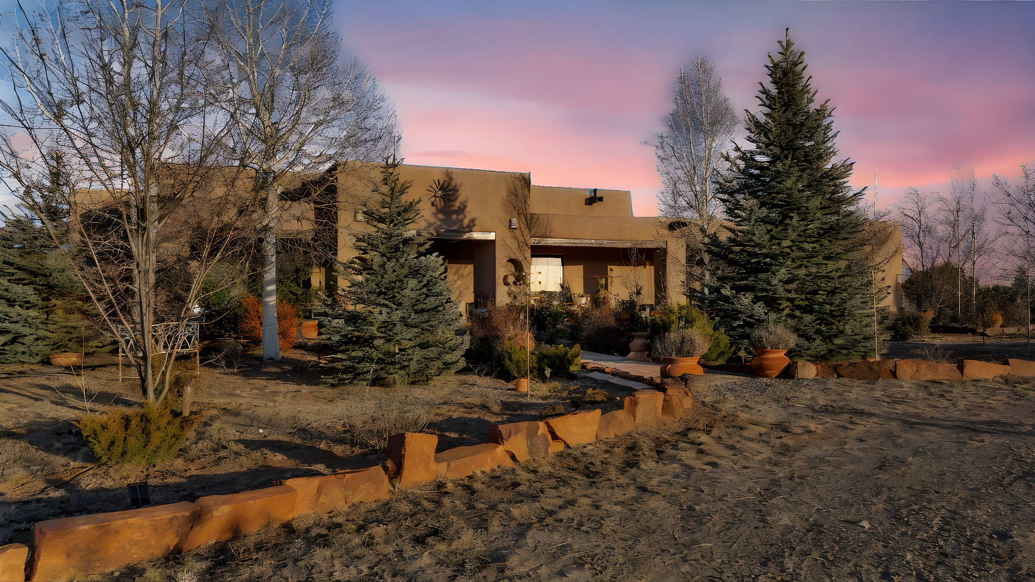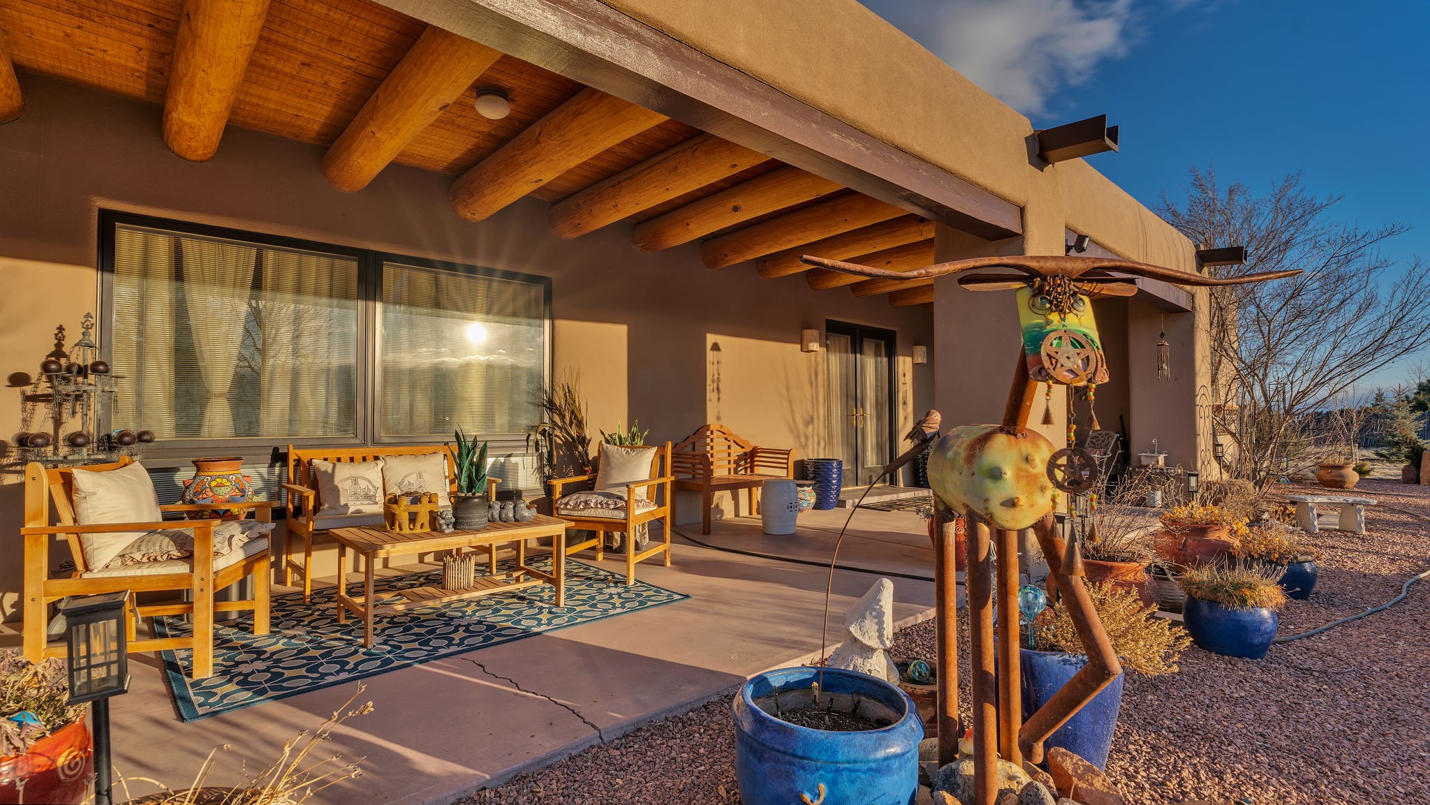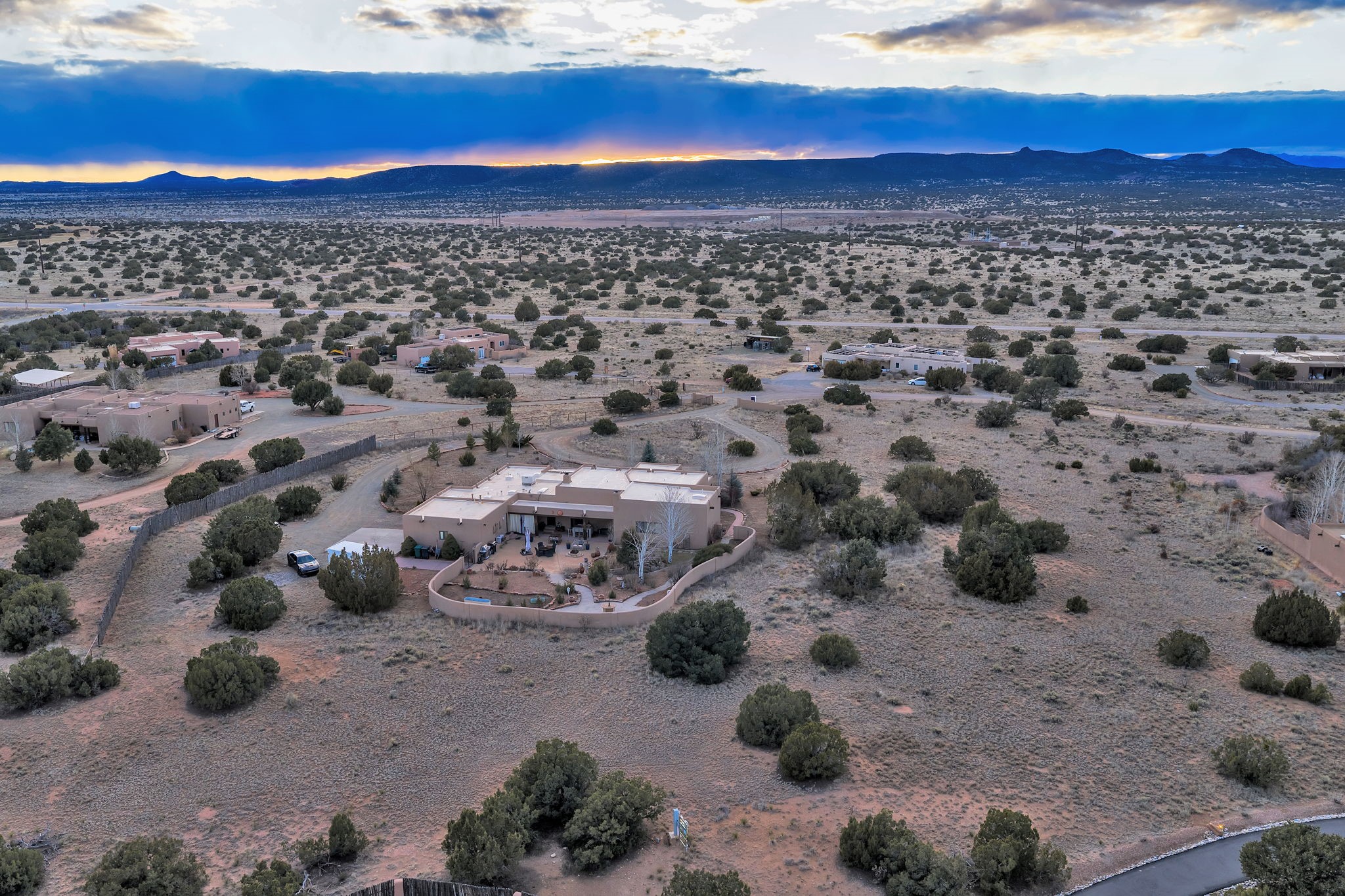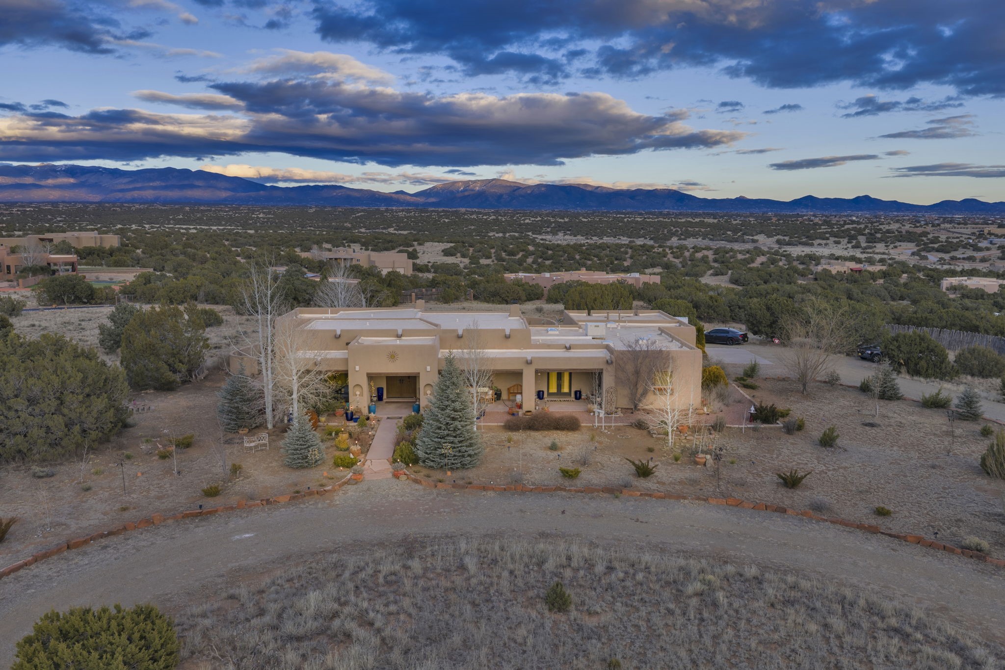 Experience the magic of Santa Fe in this stunning 3,000+ sq. ft. custom-built home featuring 4 bedrooms and 2.5 baths on 2.5 private acres -- with space and potential to add a casita or guest house (subject to county and architectural approval).Designed with timeless Southwestern character, this home showcases diamond plaster walls, exposed viga cedar wood ceilings, beautiful skylights, rich African hardwood flooring, and two wood-burning kiva fireplaces. The open-concept floor plan flows effortlessly into a beautifully upgraded kitchen with granite countertops, custom cabinetry, and newer appliances -- perfect for entertaining.Enjoy radiant floor heating throughout the home and insulated garage. Beautiful Pella windows that frame incredible mountain, sunset, and city views, filling the home with natural light.Outdoor living shines with covered front and back portals, a walled and landscaped backyard, and a serene custom pond with waterfall -- creating a private retreat ideal for relaxing or hosting guests. The spacious primary suite opens directly to a portal and features a large walk-in closet and spa-like feel.Additional highlights include a 2023 TPO roof with transferable warranty and proximity to Marty Sanchez Golf Course.Privacy, charm, breathtaking views, and true Santa Fe style -- this is the luxury retreat buyers have been waiting for.