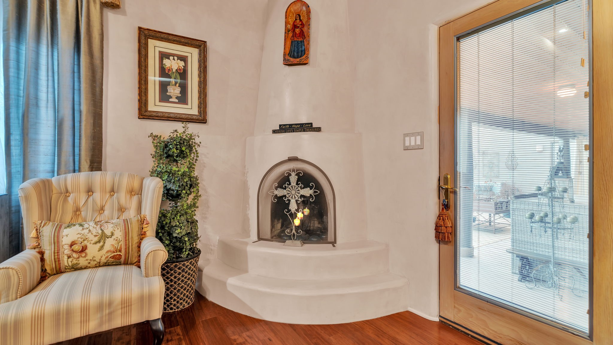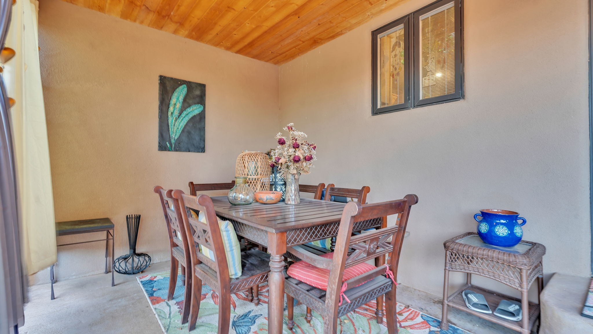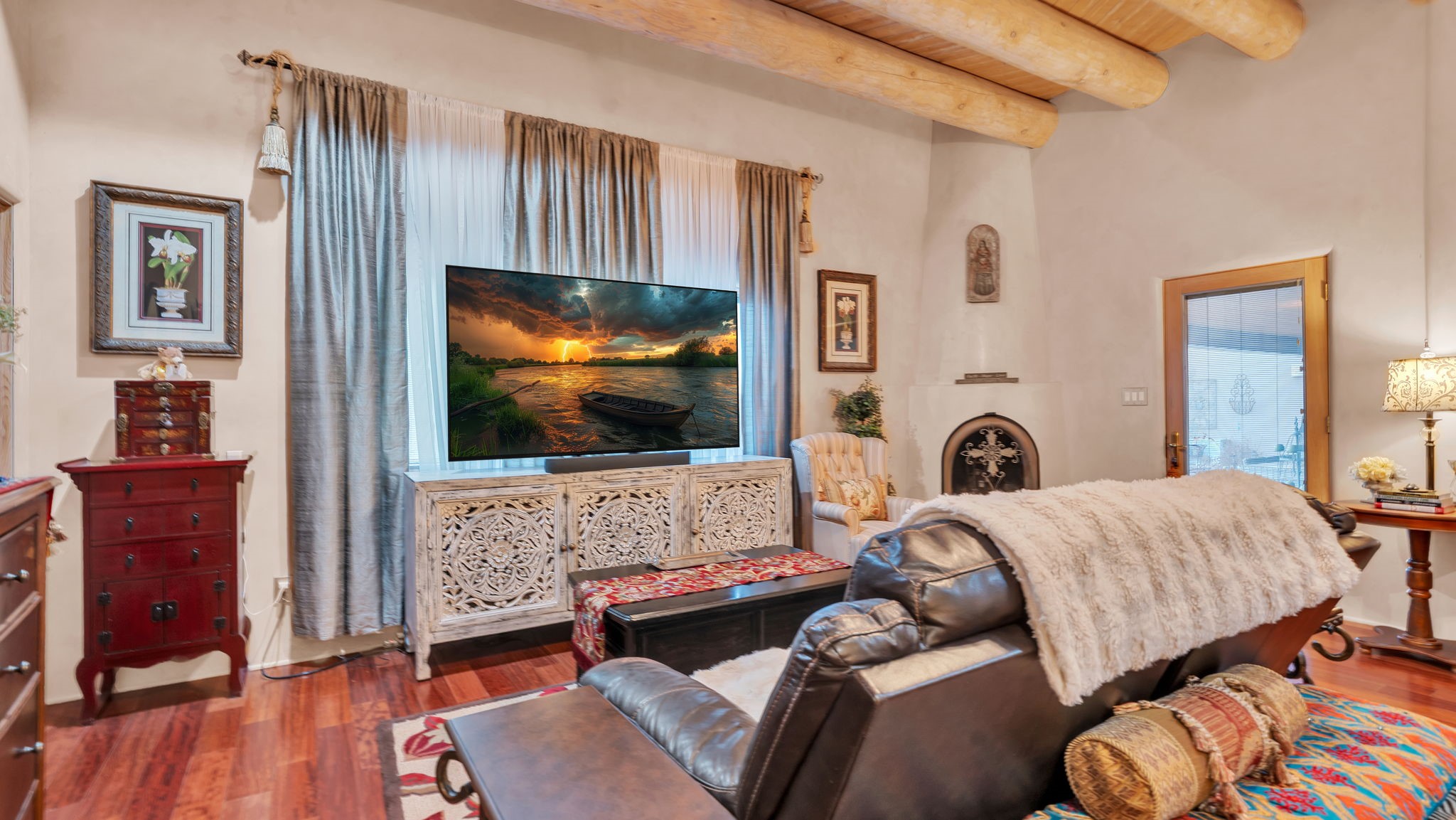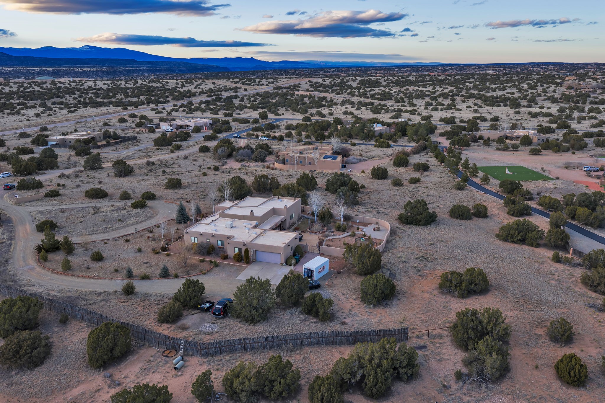 Experience the magic of Santa Fe in this stunning 3,000+ sq. ft. custom-built home featuring 4 bedrooms and 2.5 baths on 2.5 private acres -- with space and potential to add a casita or guest house (subject to county and architectural approval).Designed with timeless Southwestern character, this home showcases diamond plaster walls, exposed viga cedar wood ceilings, beautiful skylights, rich African hardwood flooring, and two wood-burning kiva fireplaces. The open-concept floor plan flows effortlessly into a beautifully upgraded kitchen with granite countertops, custom cabinetry, and newer appliances -- perfect for entertaining.Enjoy radiant floor heating throughout the home and insulated garage. Beautiful Pella windows that frame incredible mountain, sunset, and city views, filling the home with natural light.Outdoor living shines with covered front and back portals, a walled and landscaped backyard, and a serene custom pond with waterfall -- creating a private retreat ideal for relaxing or hosting guests. The spacious primary suite opens directly to a portal and features a large walk-in closet and spa-like feel.Additional highlights include a 2023 TPO roof with transferable warranty and proximity to Marty Sanchez Golf Course.Privacy, charm, breathtaking views, and true Santa Fe style -- this is the luxury retreat buyers have been waiting for.
