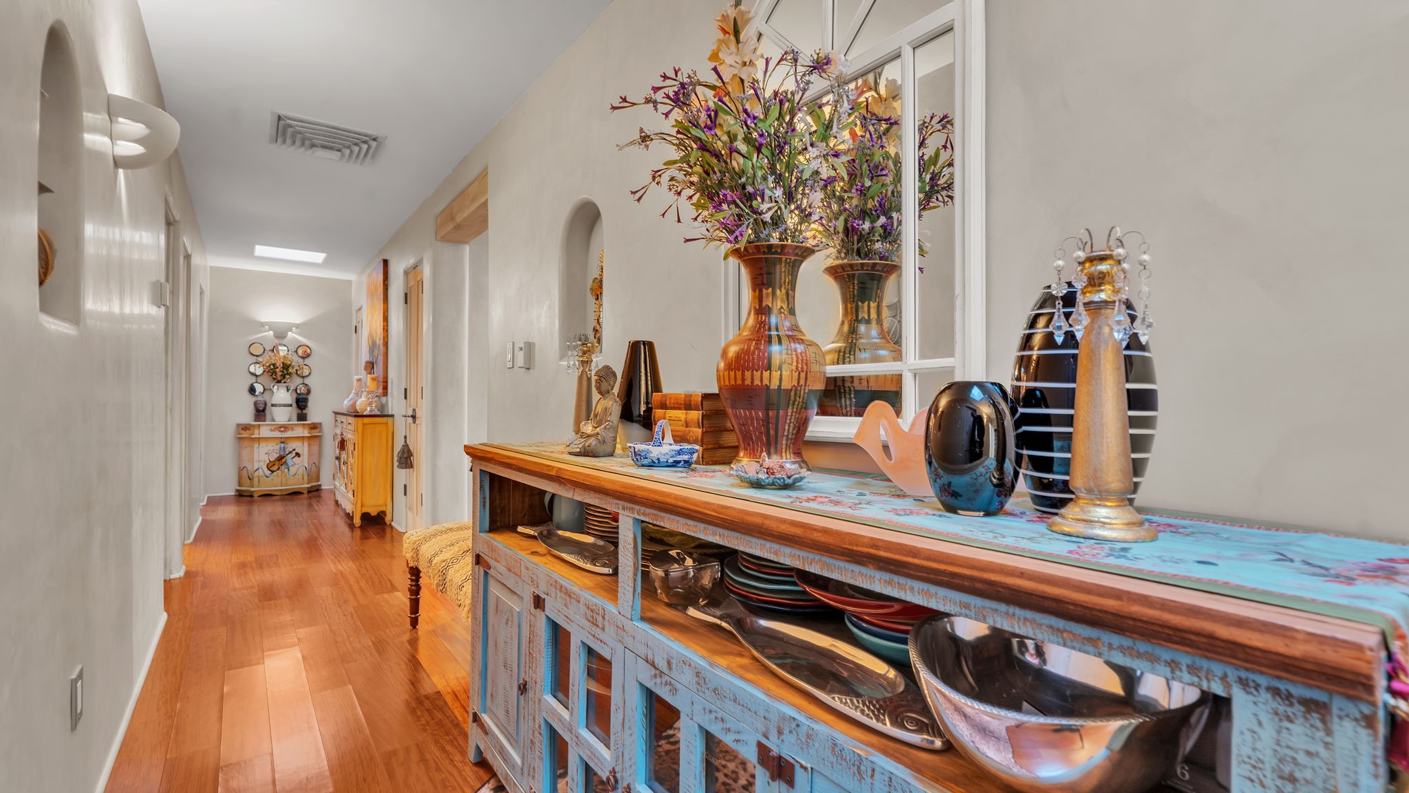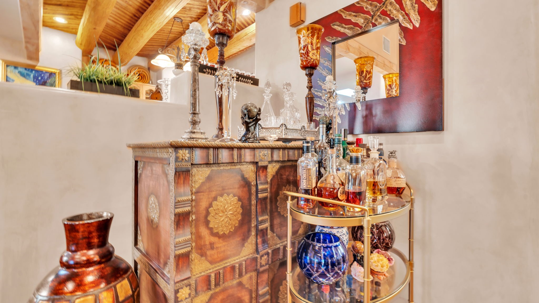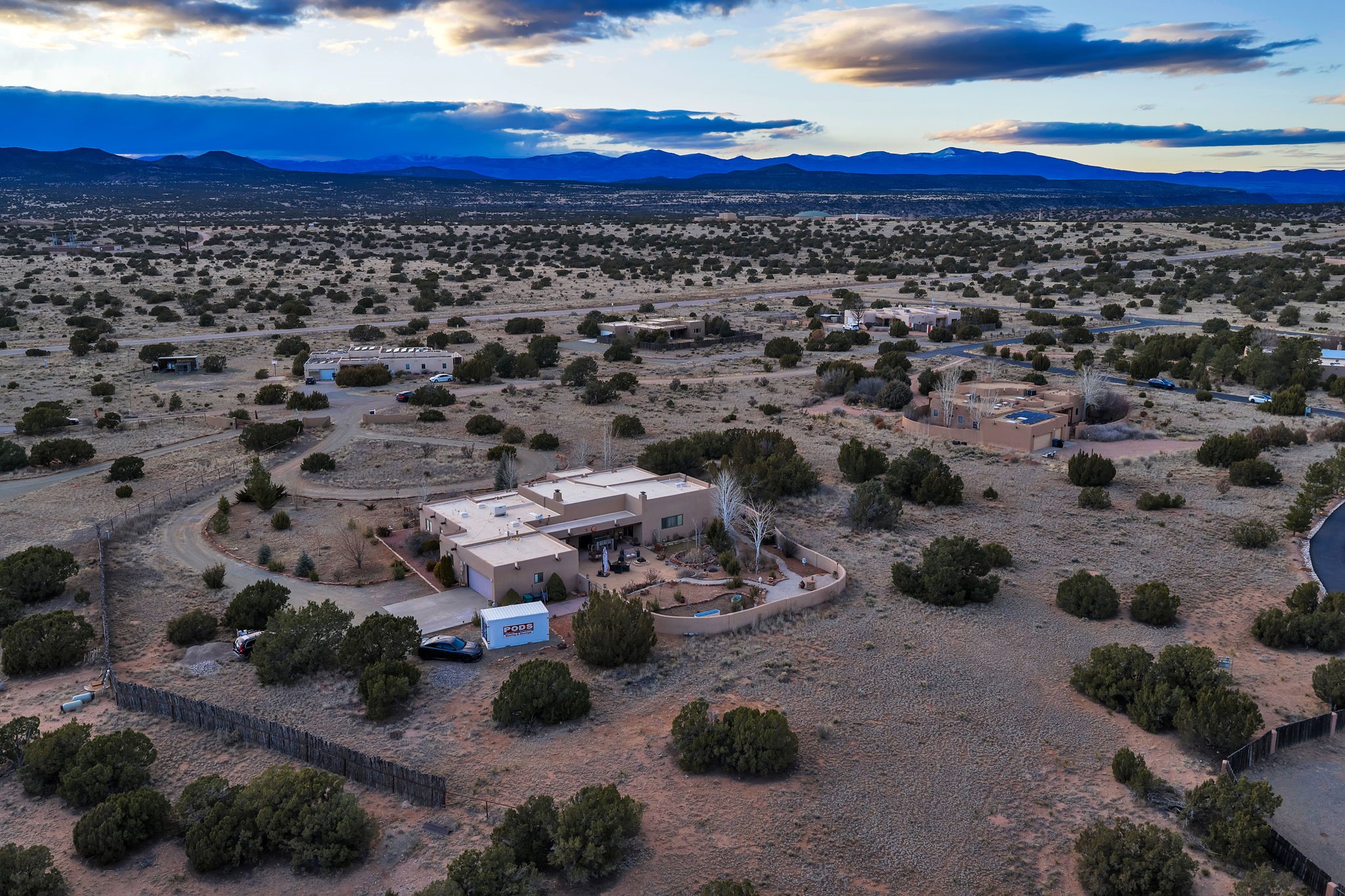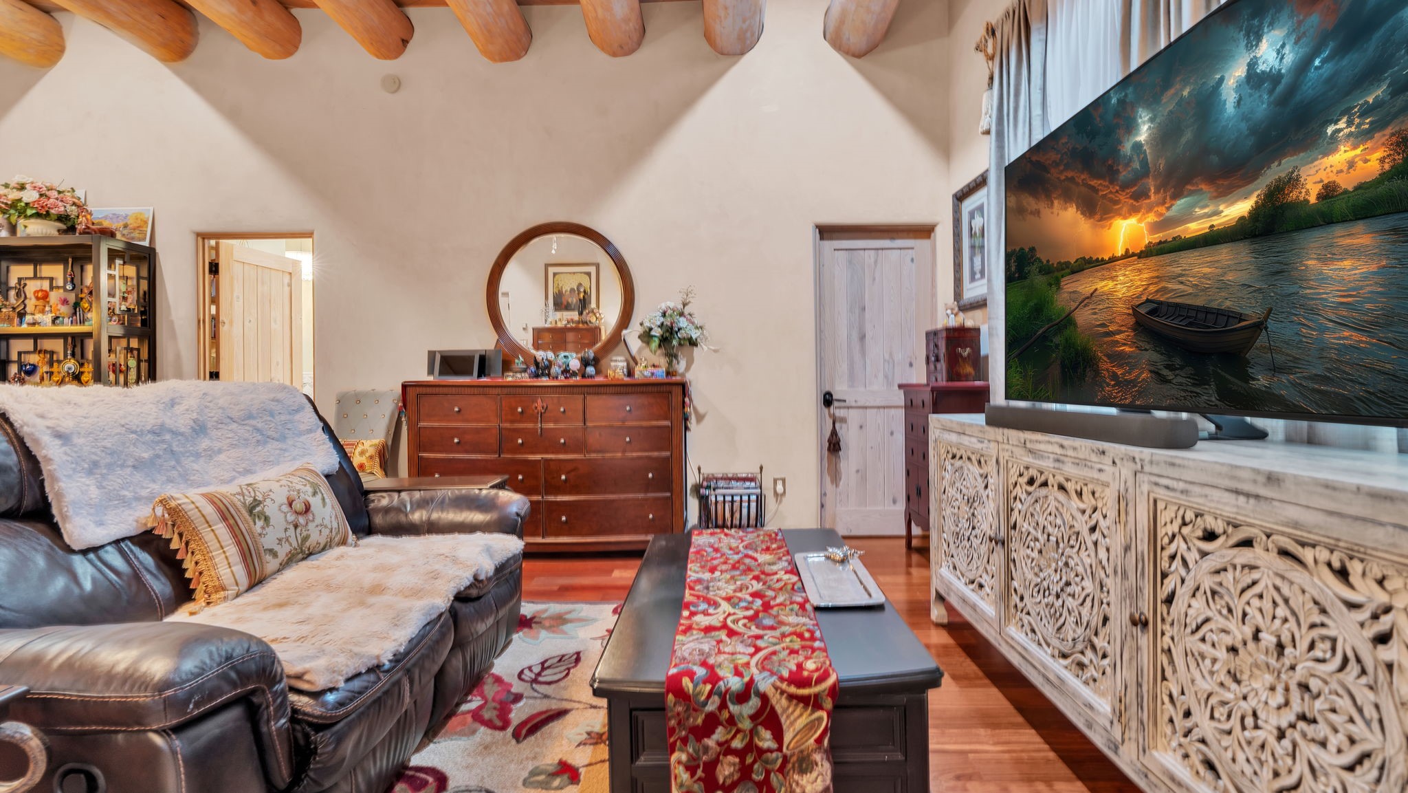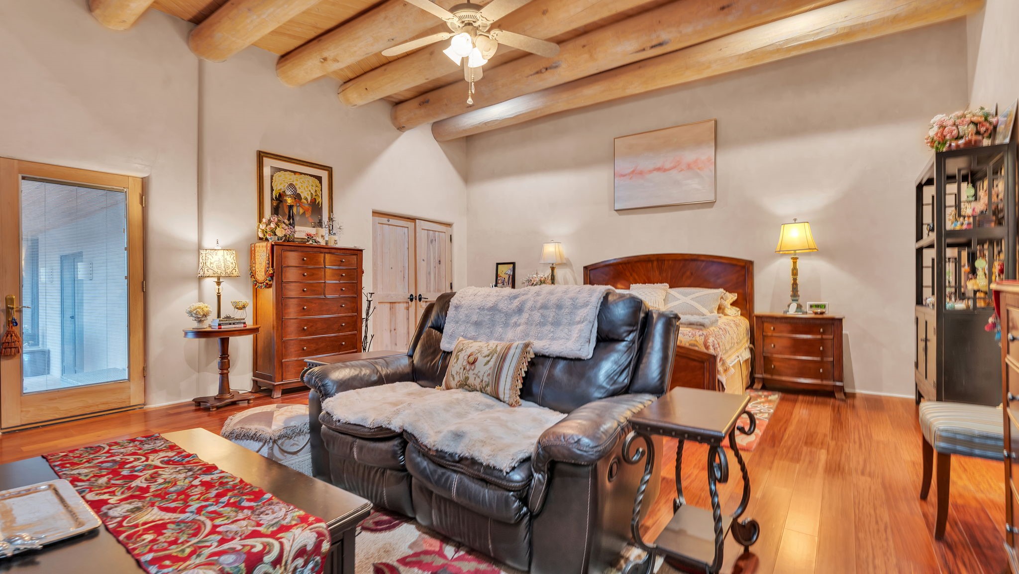 Experience the magic of Santa Fe in this stunning 3,000+ sq. ft. custom-built home featuring 4 bedrooms and 2.5 baths on 2.5 private acres -- with space and potential to add a casita or guest house (subject to county and architectural approval).Designed with timeless Southwestern character, this home showcases diamond plaster walls, exposed viga cedar wood ceilings, beautiful skylights, rich African hardwood flooring, and two wood-burning kiva fireplaces. The open-concept floor plan flows effortlessly into a beautifully upgraded kitchen with granite countertops, custom cabinetry, and newer appliances -- perfect for entertaining.Enjoy radiant floor heating throughout the home and insulated garage. Beautiful Pella windows that frame incredible mountain, sunset, and city views, filling the home with natural light.Outdoor living shines with covered front and back portals, a walled and landscaped backyard, and a serene custom pond with waterfall -- creating a private retreat ideal for relaxing or hosting guests. The spacious primary suite opens directly to a portal and features a large walk-in closet and spa-like feel.Additional highlights include a 2023 TPO roof with transferable warranty and proximity to Marty Sanchez Golf Course.Privacy, charm, breathtaking views, and true Santa Fe style -- this is the luxury retreat buyers have been waiting for.
