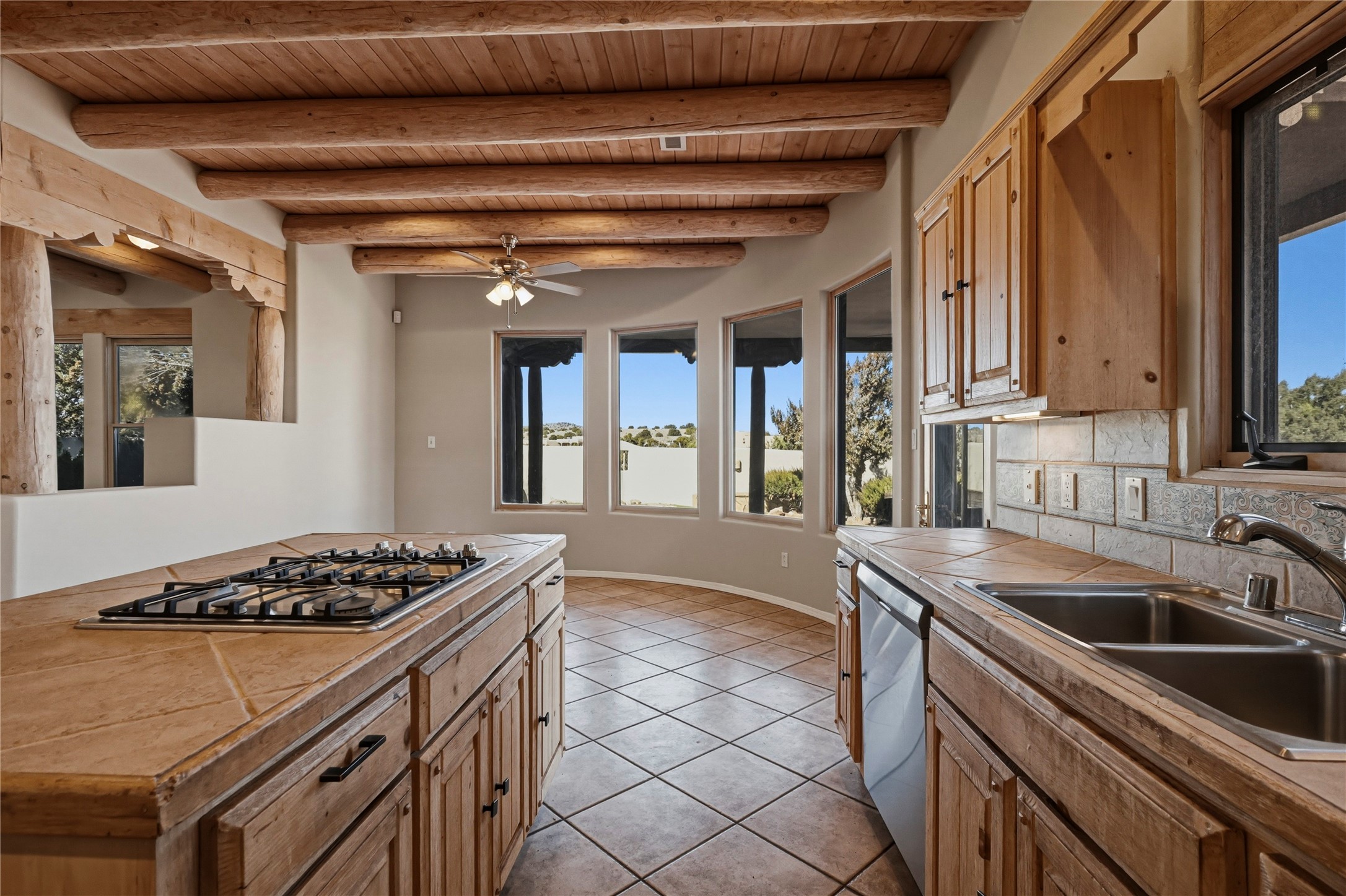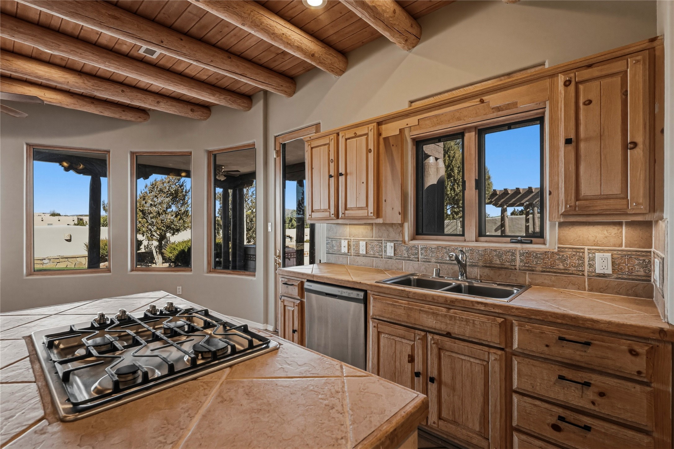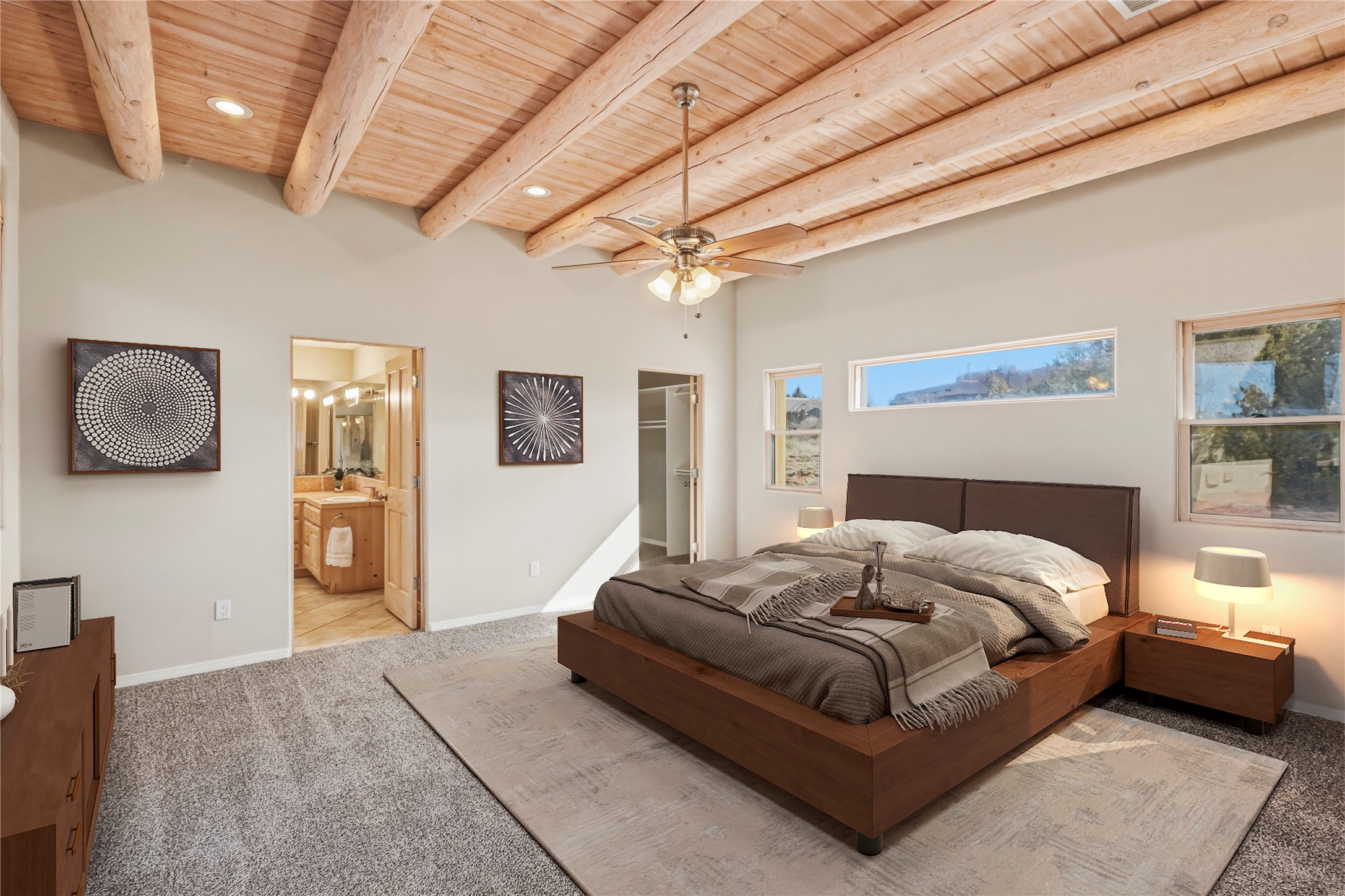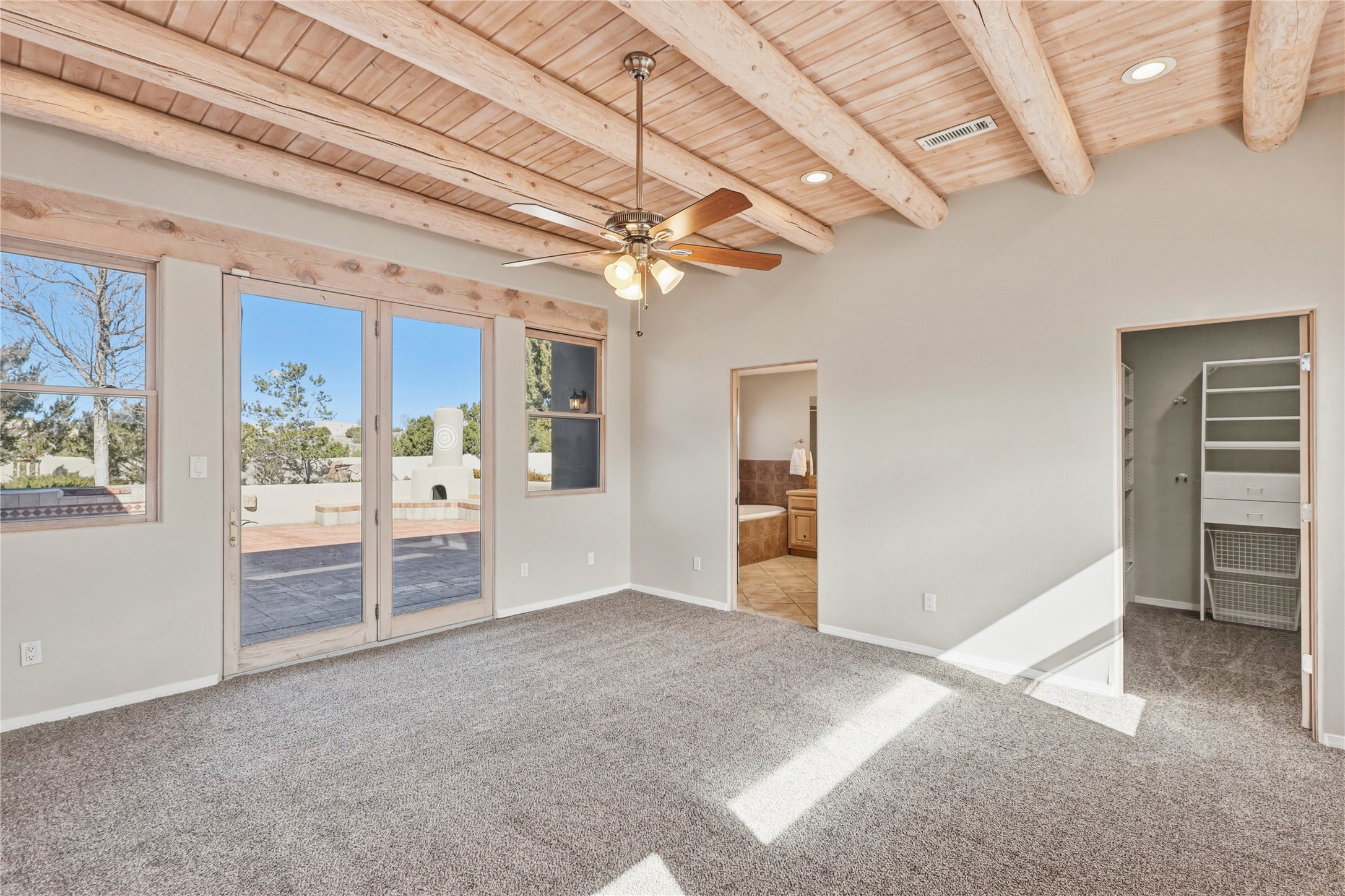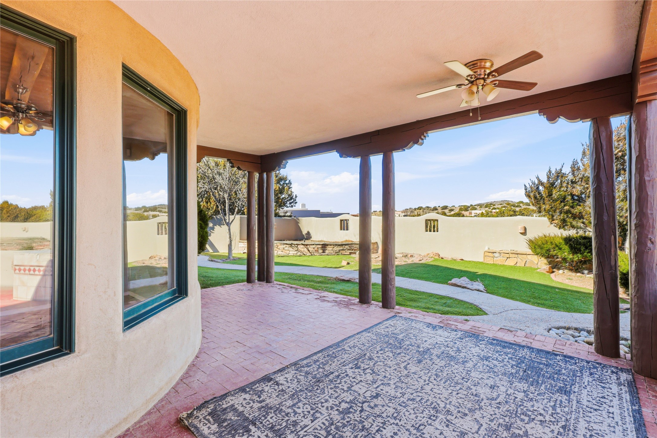 Spacious Southwestern retreat situated on a generous 1.3-acre lot, offering privacy and charm behind a classic stucco wall. The beautifully landscaped grounds create a serene setting, perfect for relaxing or entertaining on the expansive patio while taking in breathtaking New Mexico sunsets.Inside, the home blends warmth and character with modern updates. The expansive great room features a stunning tongue-and-groove ceiling, dramatic vigas, and a traditional kiva-style fireplace--creating a true Southwest ambiance. Fresh neutral paint and recently replaced carpet add a crisp, move-in-ready feel throughout.The primary suite offers a peaceful escape with an ensuite bath and walk-in closet. Two additional bedrooms provide ample space and generous closets. A well-appointed chef's kitchen flows seamlessly into the adjoining dining area, making it ideal for both everyday living and hosting gatherings.This private, beautifully maintained property captures the essence of Southwest living with space, style, and unforgettable sunsets.
