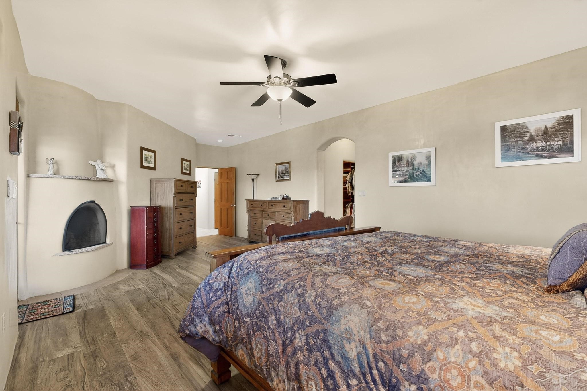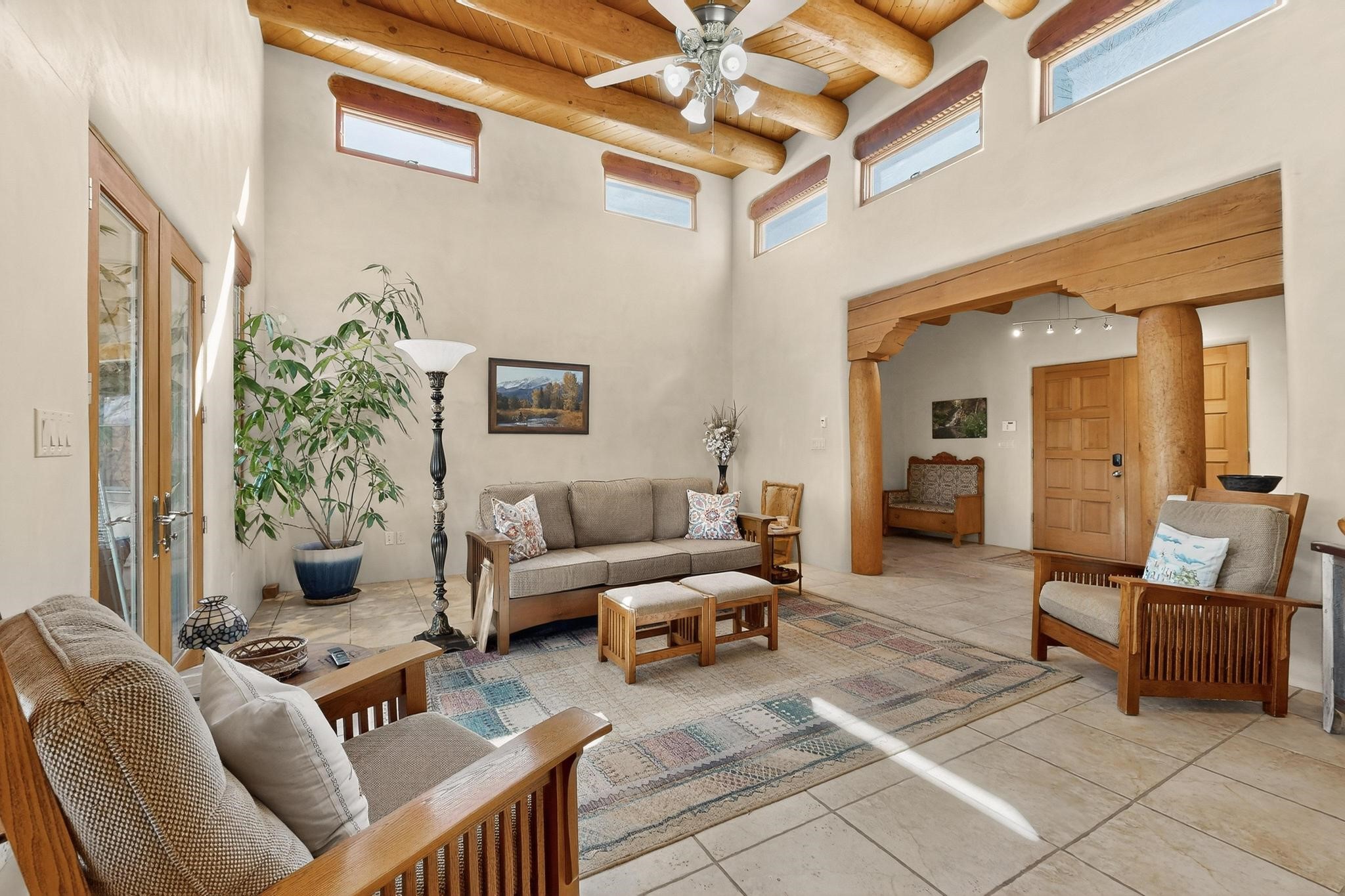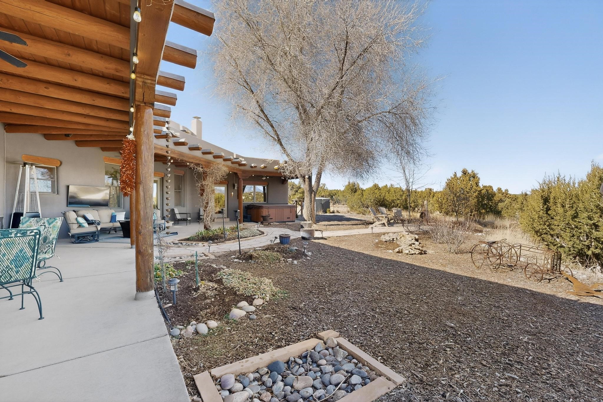 Welcome to 20 Vista Calabasas where Santa Fe style and luxury meet! This incredible home sitting on 5.5 acres of serene high desert landscape, offers 3491 square feet of elegance. Walk into the stunning front door to a grand great room with high ceilings and a direct view of mountain vistas. Continue down the hall enjoying exposed vigas, wood ceilings, diamond finished plaster walls, and tile and wood flooring throughout the home. You'll love preparing meals in the beautiful and large chefs kitchen, equipped with stunning granite countertops and an incredible Wolf range/oven that will make cooking a dream! This 4 bedroom home is cleverly designed with the primary suite on the other side of the home from the other bedrooms with a bonus/possible additional 5th bedroom. In the primary suite you will be charmed by a beautiful diamond finish plaster wood burning fireplace and a private patio door allowing for ample light and views of the Sangre de Cristo mountains. The primary bath has incredible finishes including a large free soaking tub, a large walk in steam shower, and beautiful and large granite countertops. The primary closet is cedar lined with ample space for all your belongings. This home is an entertainers delight! The large living room opens out onto a massive outdoor patio with wide open space stretching far into the distance with stunning views in all directions. This is the perfect place to hold all your upcoming summer gatherings on the cool Santa Fe evenings or wake up and enjoy the peaceful sound of the birds chirping while watching the sun rise in the distance. This home will not disappoint! Schedule your private showing today!