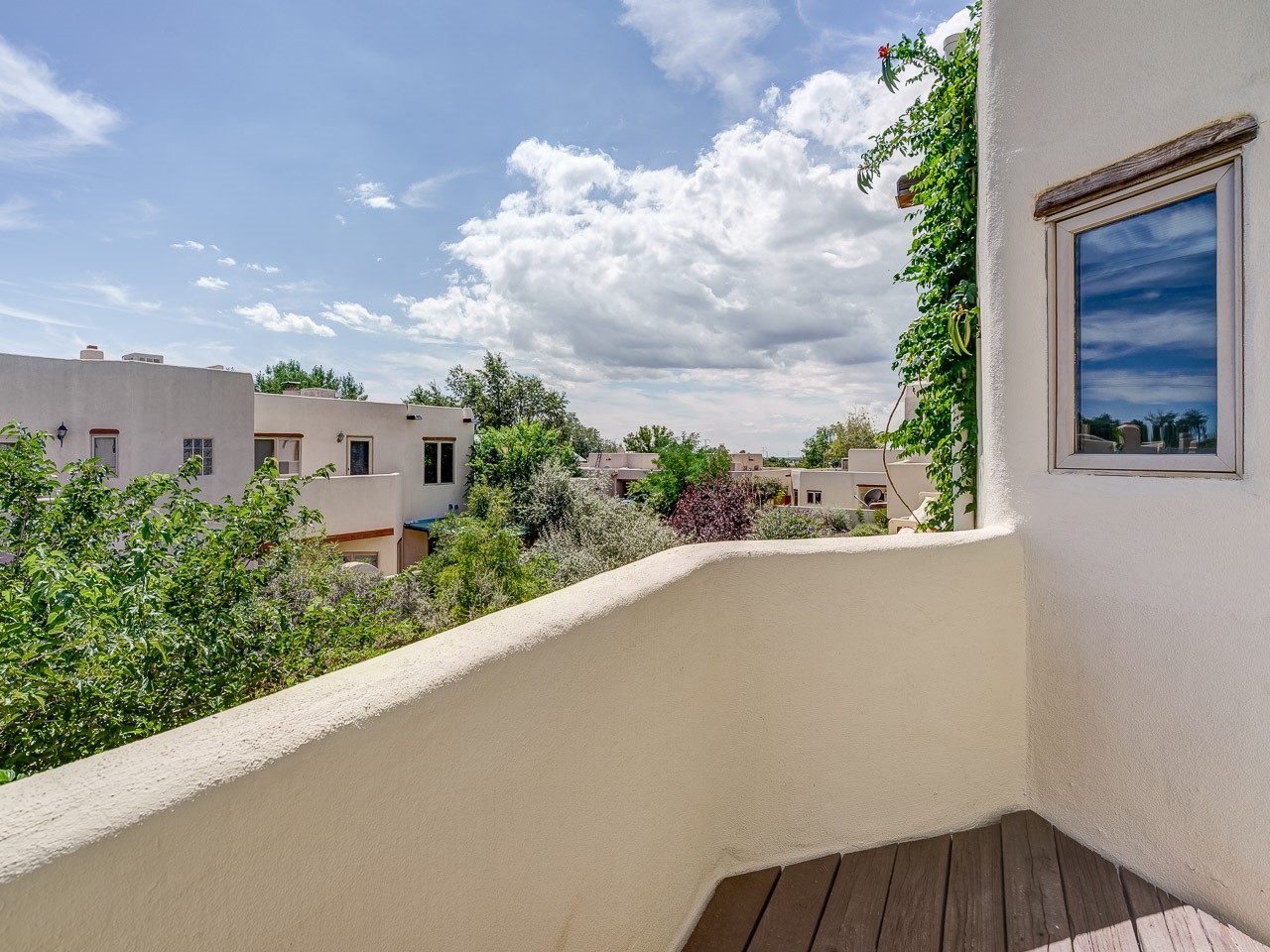 Experience the quintessential Santa Fe lifestyle in this light-filled condo, nestled in the peaceful and centrally located Villa de la Paz neighborhood. Step inside to discover a beautiful, open-concept living space with soaring ceilings, classic Saltillo tile floors, and a stunning kiva fireplace--perfect for cozy evenings. The charming kitchen and dining area flow seamlessly to a private courtyard, offering a tranquil outdoor retreat for al fresco dining or morning coffee. The main level also features a convenient powder room, stacked washer and dryer, and ample storage. Upstairs, the airy loft bedroom is a serene sanctuary, bathed in natural light and featuring a full en-suite bathroom, a generous walk-in closet, and a sweet balcony overlooking the courtyard and open space. This 1,206 sq ft home, built in 2002, embodies the best of Northern New Mexico style with its multi-level design and beamed ceilings. It also includes a private carport and access to the community's well-maintained common areas and trails. With its desirable location, you will be just moments from shopping, dining, and all the cultural amenities Santa Fe has to offer. This is a rare opportunity to own a piece of Santa Fe magic.