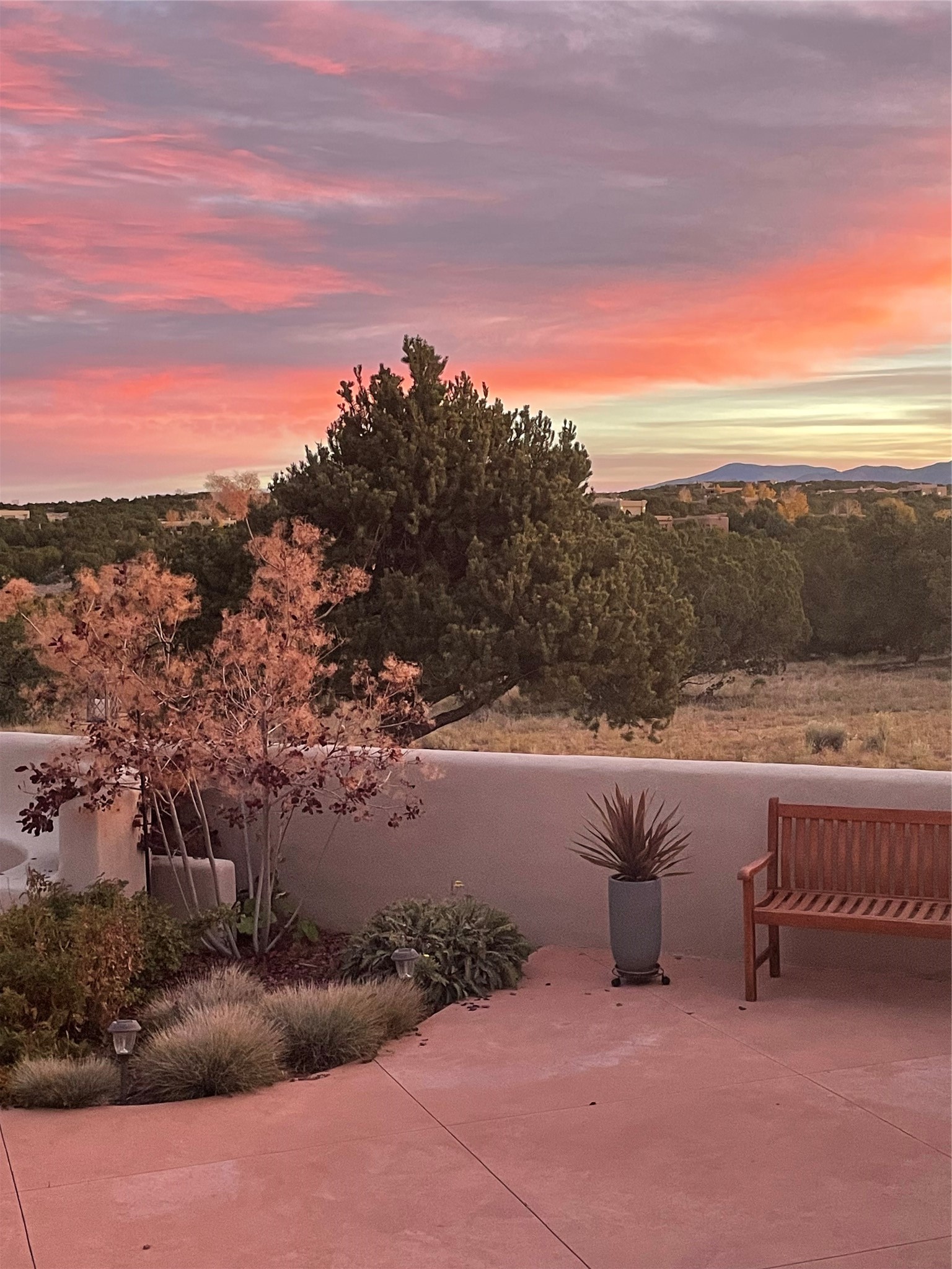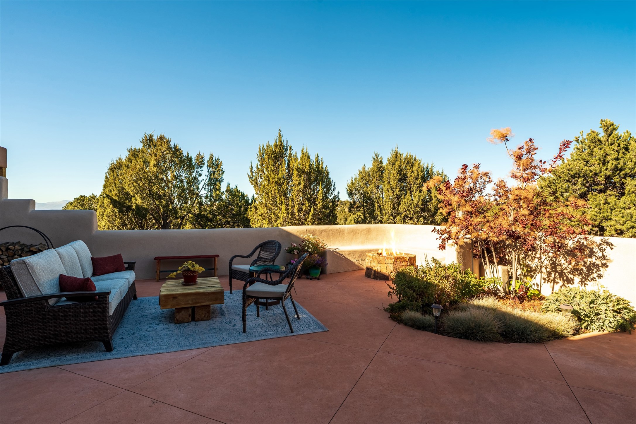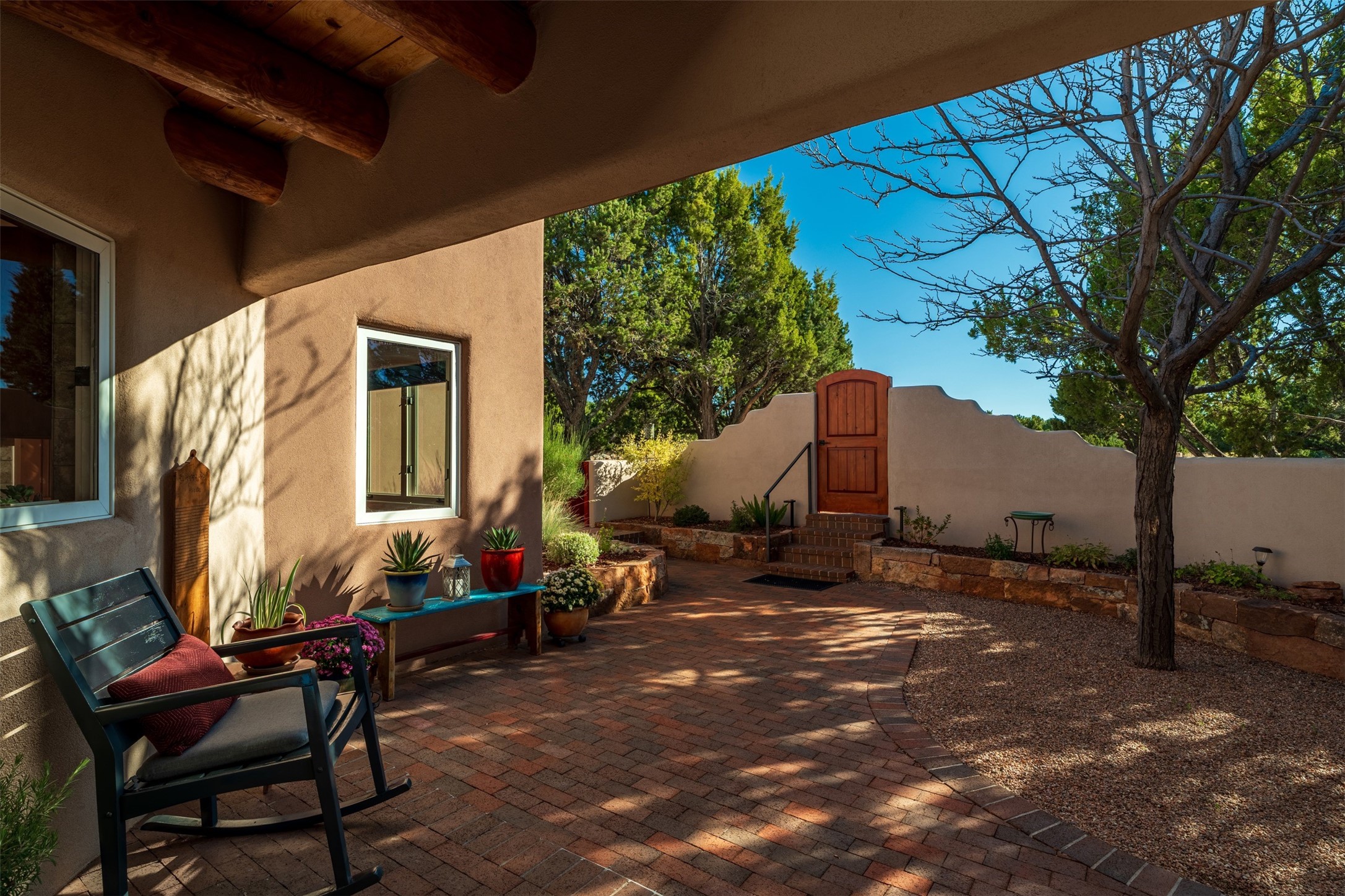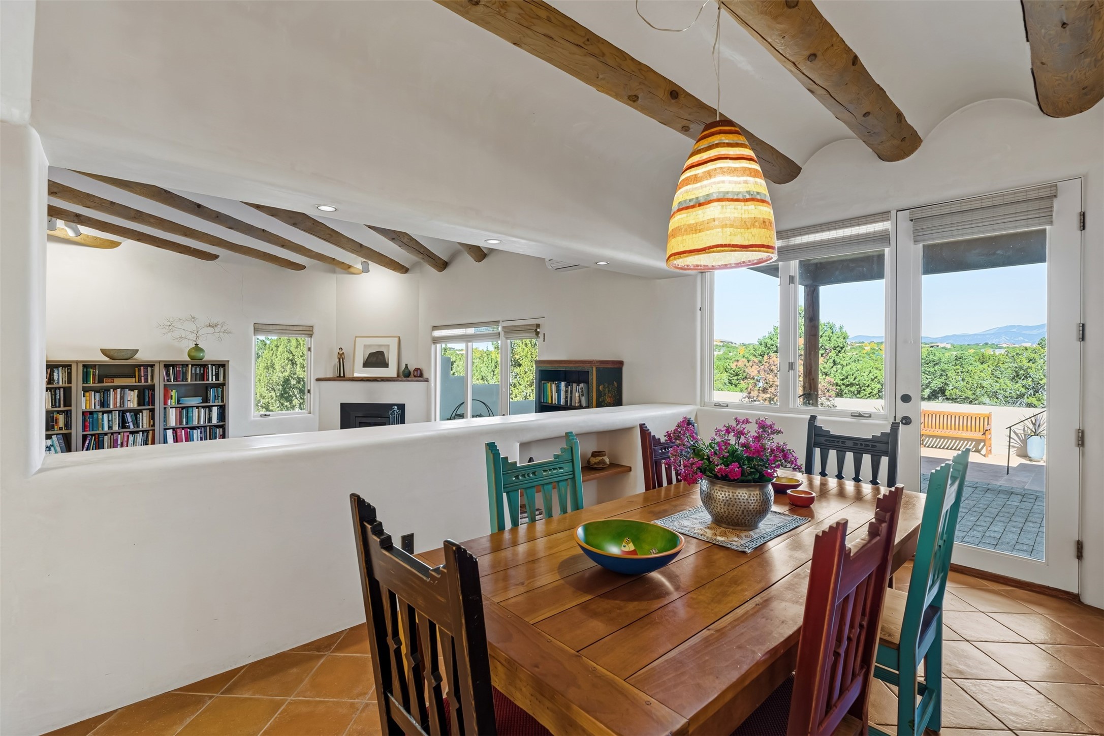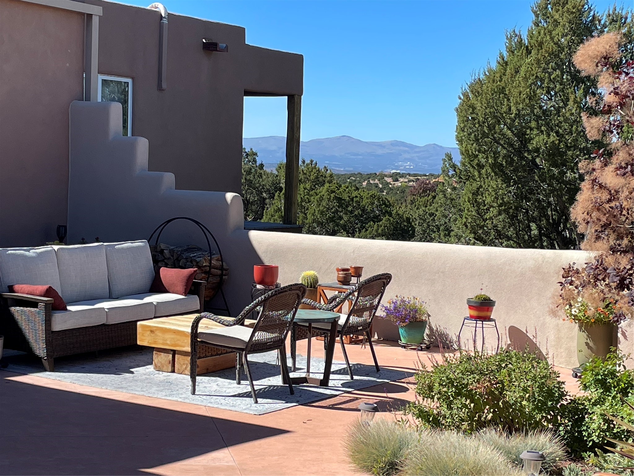 Experience breathtaking views of the majestic Sangre de Cristo and Jemez mountains from this stunning single level 4 bedroom 3.5 bath residence located on 1.76 acres in La Mariposa. This prime location is 10 minutes to the Plaza downtown and close to the Club at Las Campanas. An open natural light filled floor plan features a spacious living room with a fireplace and a dining room - both with large windows showcasing the captivating mouuntain views. A well-appointed kitchen includes a charming breakfast nook with banco seating. The primary suite offers ultimate comfort with a luxurious bath and a cozy fireplace, creating a private retreat. There is a second oversized bedroom with its own fireplace and adjacent bath. Two additional guest bedrooms share a bath. Enjoy relaxing or entertaining in the inviting outdoor spaces, featuring a private enclosed backyard patio and a cozy gas firepit. The property is enhanced with extensive low maintenance landscaping designed for beauty and ease of care.