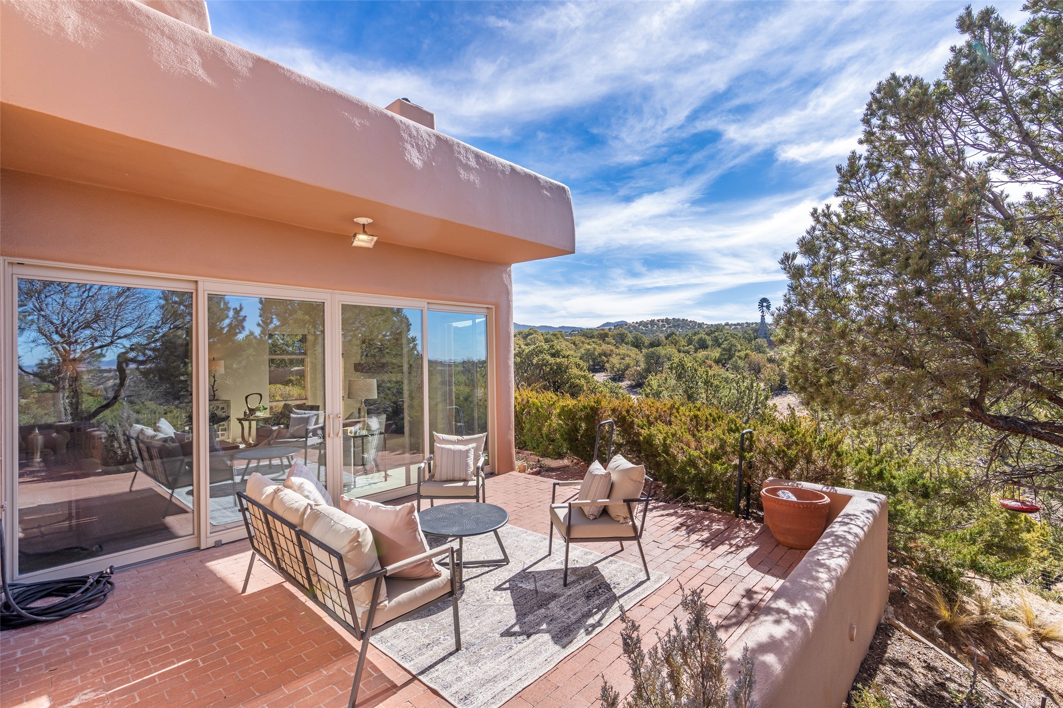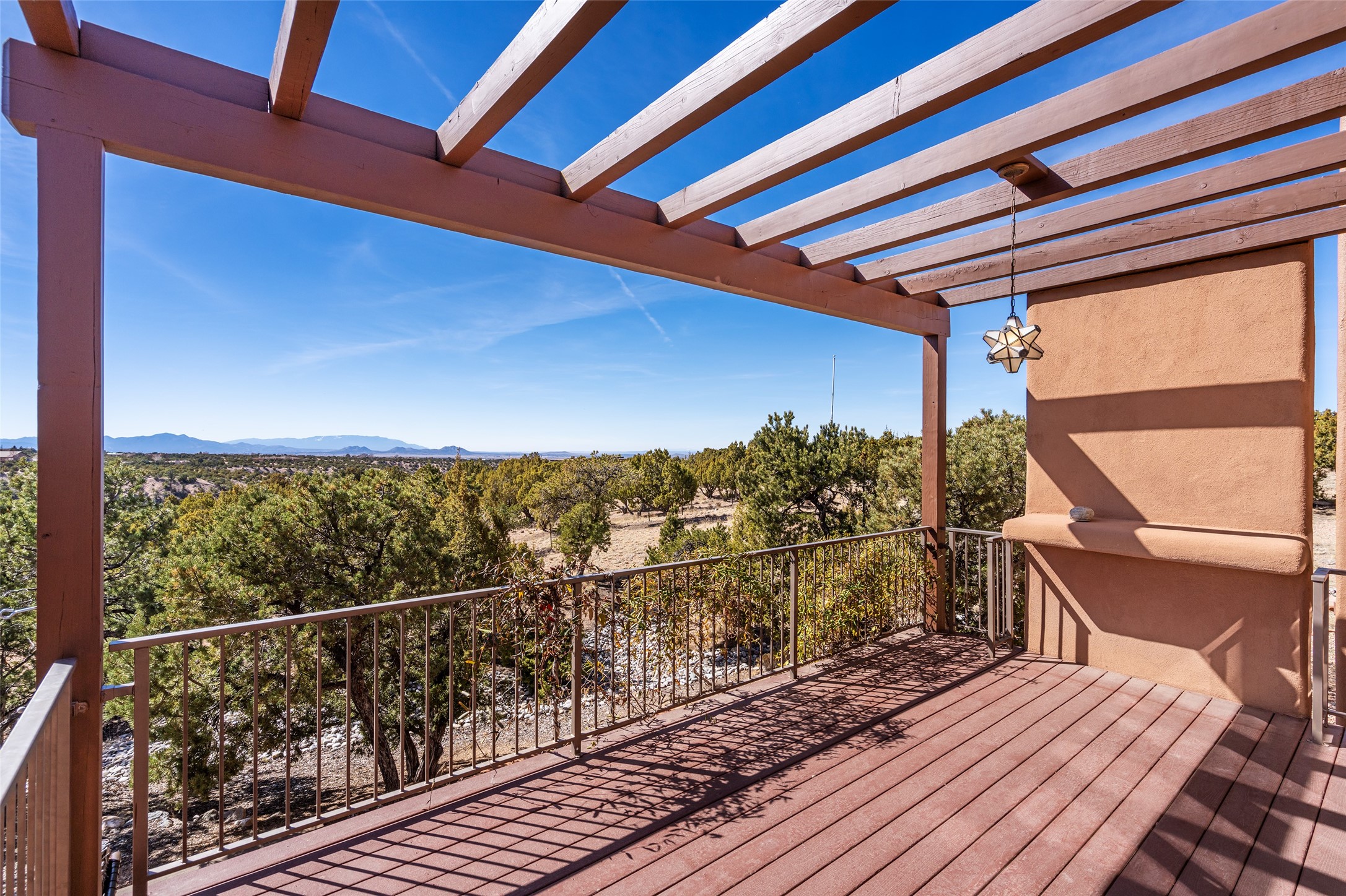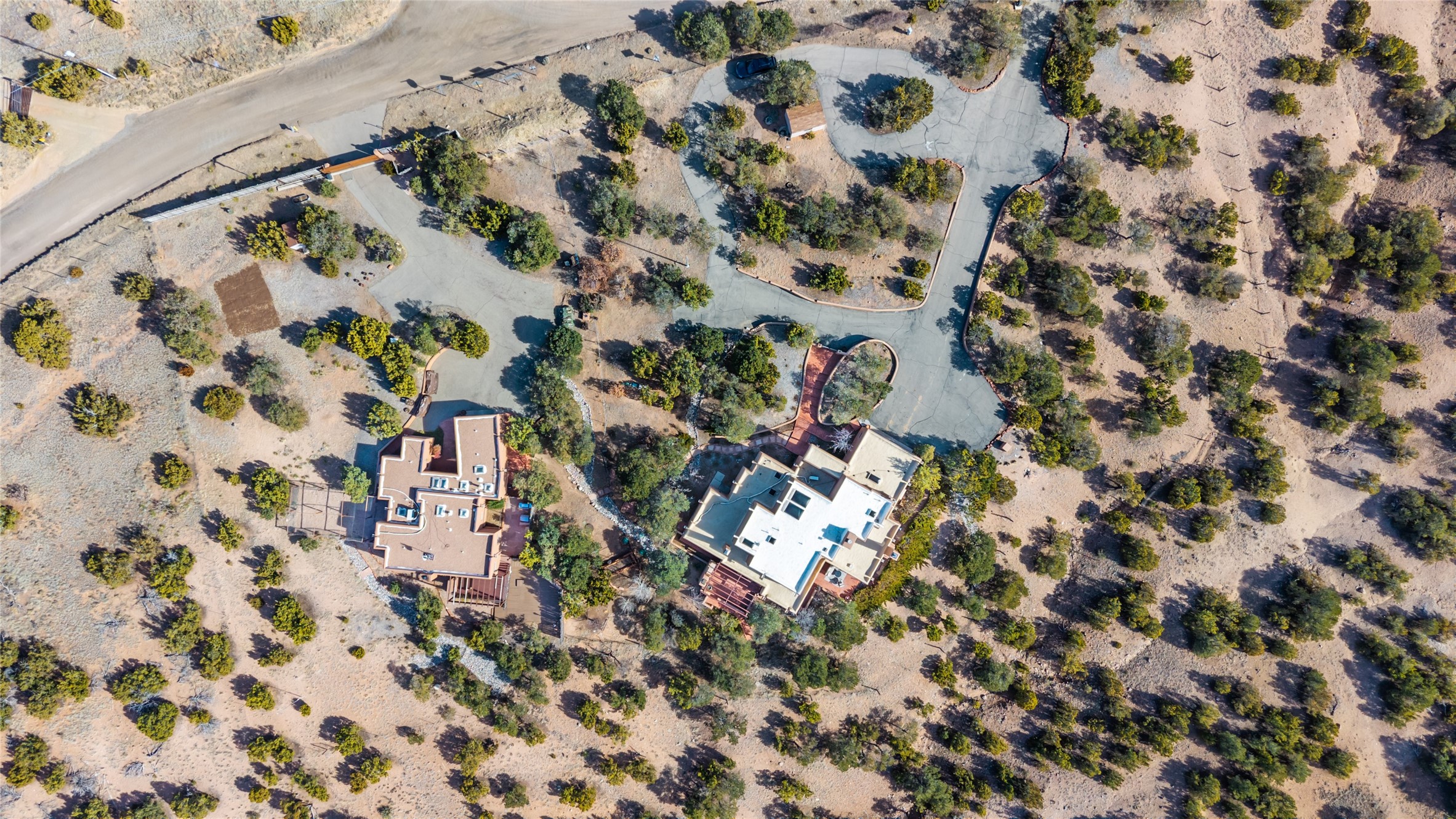 Santa Fe Compound Minutes From Plaza. This gated 8+ acre Santa Fe estate with two homes and sweeping southern views is tucked away along Old Agua Fria Road at the end of Old Pecos Trail and offers privacy and exceptional convenience. Located less than 5 miles from the Historic Santa Fe Plaza and moments from the I-25 Old Pecos Trail exit, this gated property feels peaceful and secluded while remaining incredibly accessible. The estate includes two residences with separate addresses, creating an ideal setup for multi-generational living, guests, rental potential, or a private retreat. Expansive views, big skies, and multiple outdoor living areas provide the perfect setting for entertaining or enjoying a beautiful sunset. The main residence (approx. 3,300 sq ft) features 3 bedrooms and 3.5 baths, with ensuite baths in every bedroom. The thoughtful layout includes a spacious main-level bedroom suite and two additional bedrooms upstairs, providing flexibility and privacy. The separate casita (approx. 1,200 sq ft) offers 2 bedrooms and 1.5 baths and opens to a large south-facing deck with panoramic views--an ideal space for gatherings, sunset dinners or relaxing under star-filled skies. Arroyo Hondo open space and archaeological easements run through the back of the property, which help to preserve the natural landscape, history of the area, and sight-lines. Recent improvements include new roofs with transferable warranties, a new boiler, and updated & repainted stucco. Experience the privacy, views, and convenience of this distinctive Santa Fe compound. Be sure to watch the drone video over the arroyo and property here https://youtu.be/qAOJMNmIgfY
