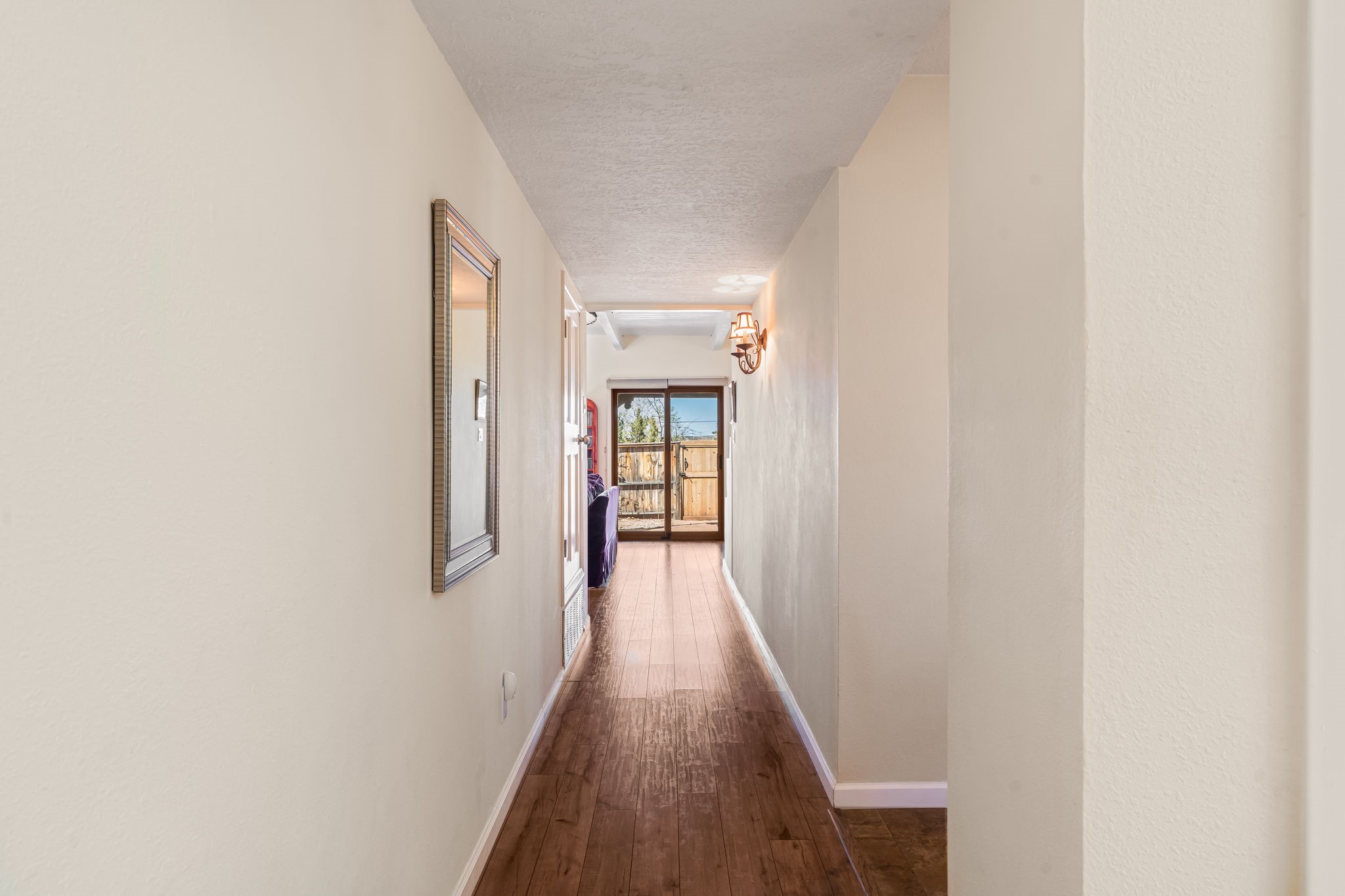 Filled with natural light and lovingly cared for over the past 30 years, this inviting single-story townhouse offers comfort, beauty, and an exceptional Park Plazas setting. With open space on three sides, the home enjoys a wonderful sense of privacy along with views of the Jemez Mountains, where sunsets are especially beautiful, as well as glimpses of the Sangre de Cristo range. Inside, the living and dining room feel warm and welcoming with beautiful laminate flooring, a corner Kiva fireplace, and sliding doors that open to a covered portal--an ideal place to relax and take in the surroundings. The kitchen has been thoughtfully updated with newer appliances, including a convection oven, Silestone countertops, a subway tile backsplash, a granite composite farm sink, and two skylights that bring in even more light. A sunny breakfast area with a cozy window seat adds to the home's charm. The spacious primary bedroom is bright and peaceful, and the updated bath features granite counters and a beautifully tiled walk-in shower. Additionally, there is a lovely second bedroom and full bath as well as a detached 2 car garage. This home is sparkling and ready for its new owner. Located in the centrally situated Park Plazas neighborhood, residents enjoy miles of walking trails, tennis courts, an off-leash dog park, and easy access to shopping, dining, and the Santa Fe Plaza.