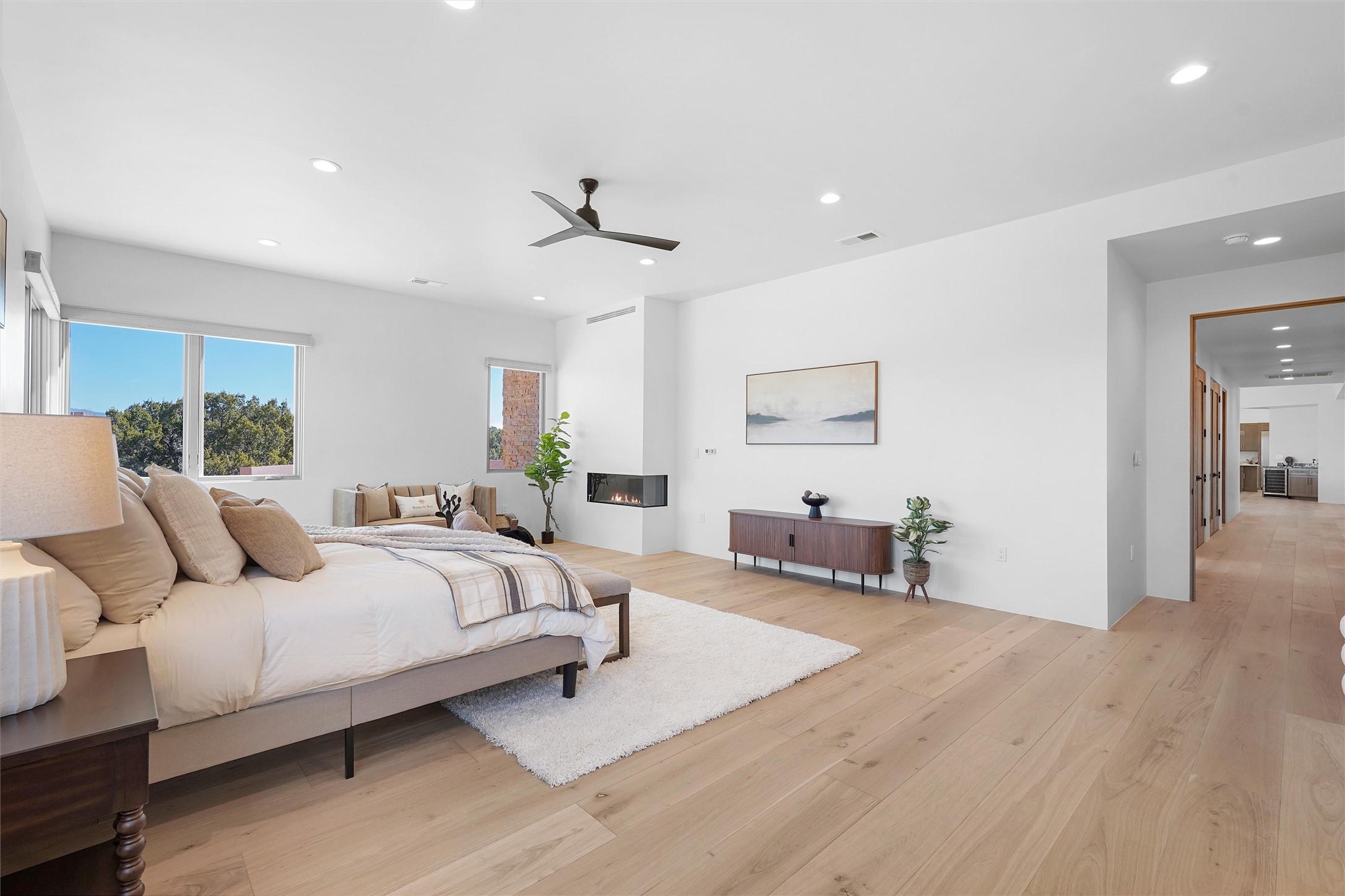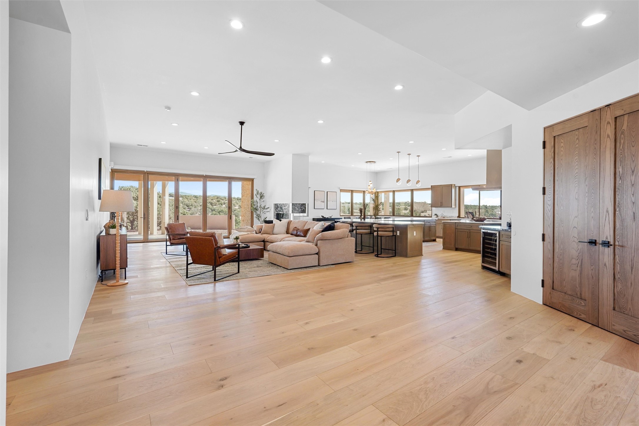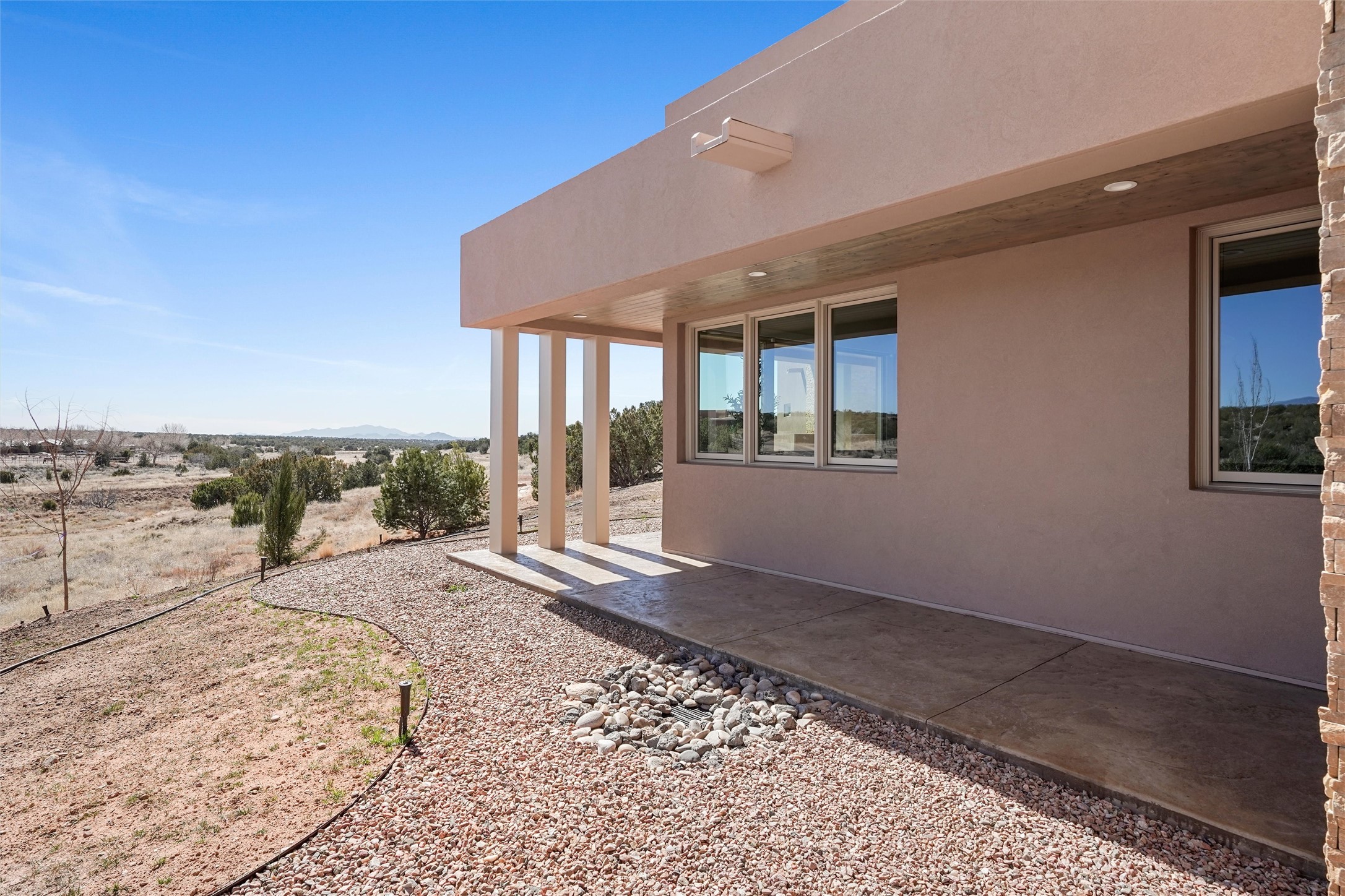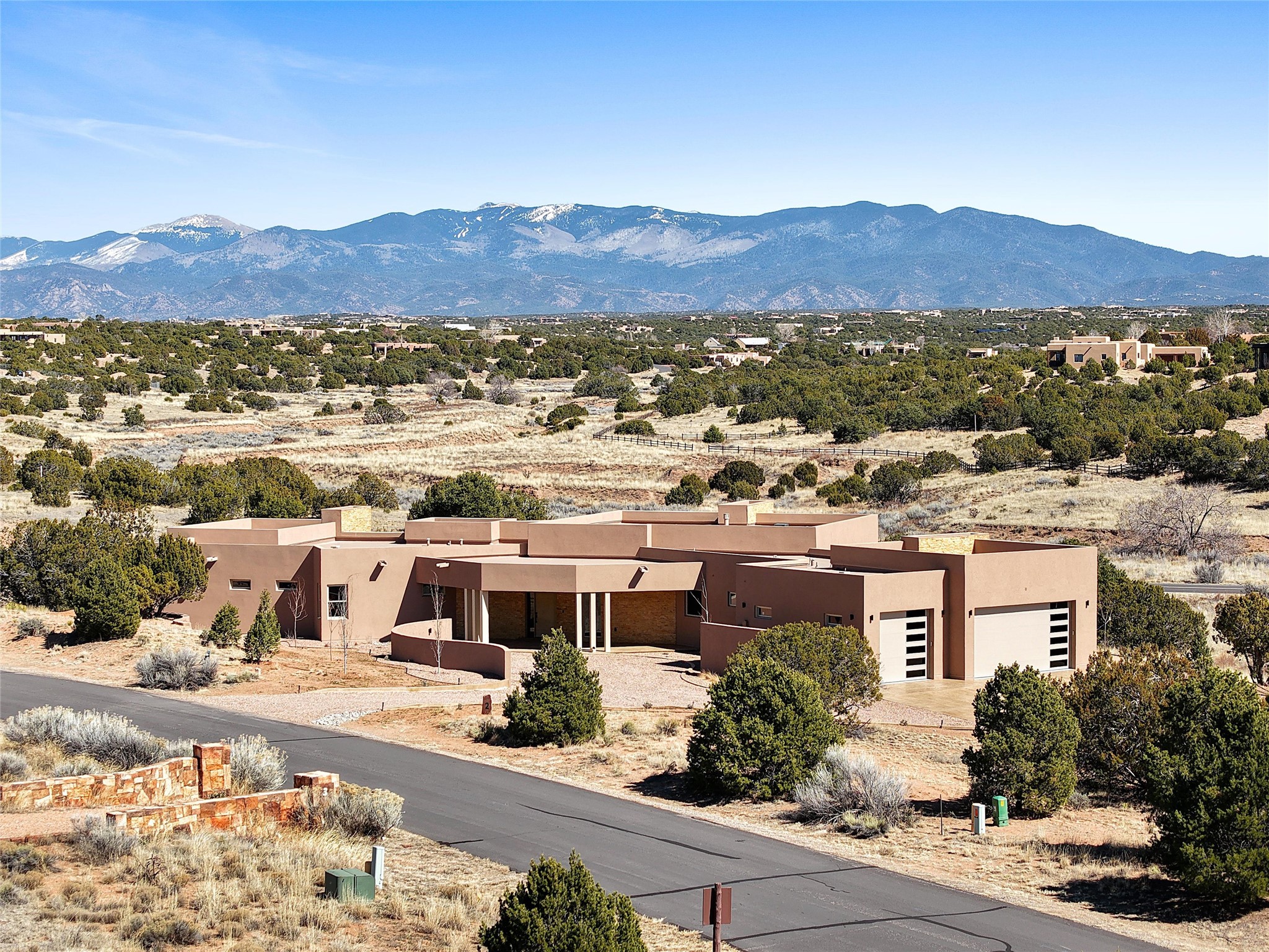 Completed in late 2025 and set on 2 acres in Las Campanas, this single level residence captures expansive views of the Sangre de Cristo Mountains and the nearby equestrian center. Built by Contreras Construction, a respected local builder known for integrity, the home reflects planning and attention to detail throughout. This home offers 4,209 square feet with three bedrooms, five bathrooms, a dedicated office, and a three-car garage with epoxy-coated flooring. The main living and dining spaces are centered around a two-way fireplace that creates a natural focal point for gathering. The kitchen features Thermador appliances, quartzite countertops, and a butler's pantry that provides additional storage and preparation space. Folding glass doors open the main living area to the outdoor patio, allowing the interior spaces to flow easily outside. The primary suite includes a fireplace and spacious bathroom including a soaking tub, rain shower, Toto bidet toilet, and porcelain tile finishes. Closet pull-downs and built-in storage elements provide practical organization throughout the home.Outdoor living areas were designed to take advantage of the surrounding views. The patio includes a built-in gas grill, mini refrigerator, and fire pit positioned for enjoying the mountain setting and open sky. Located within the gated Las Campanas community, this property offers privacy, quiet surroundings, and convenient access to Santa Fe's dining, galleries, and cultural destinations.