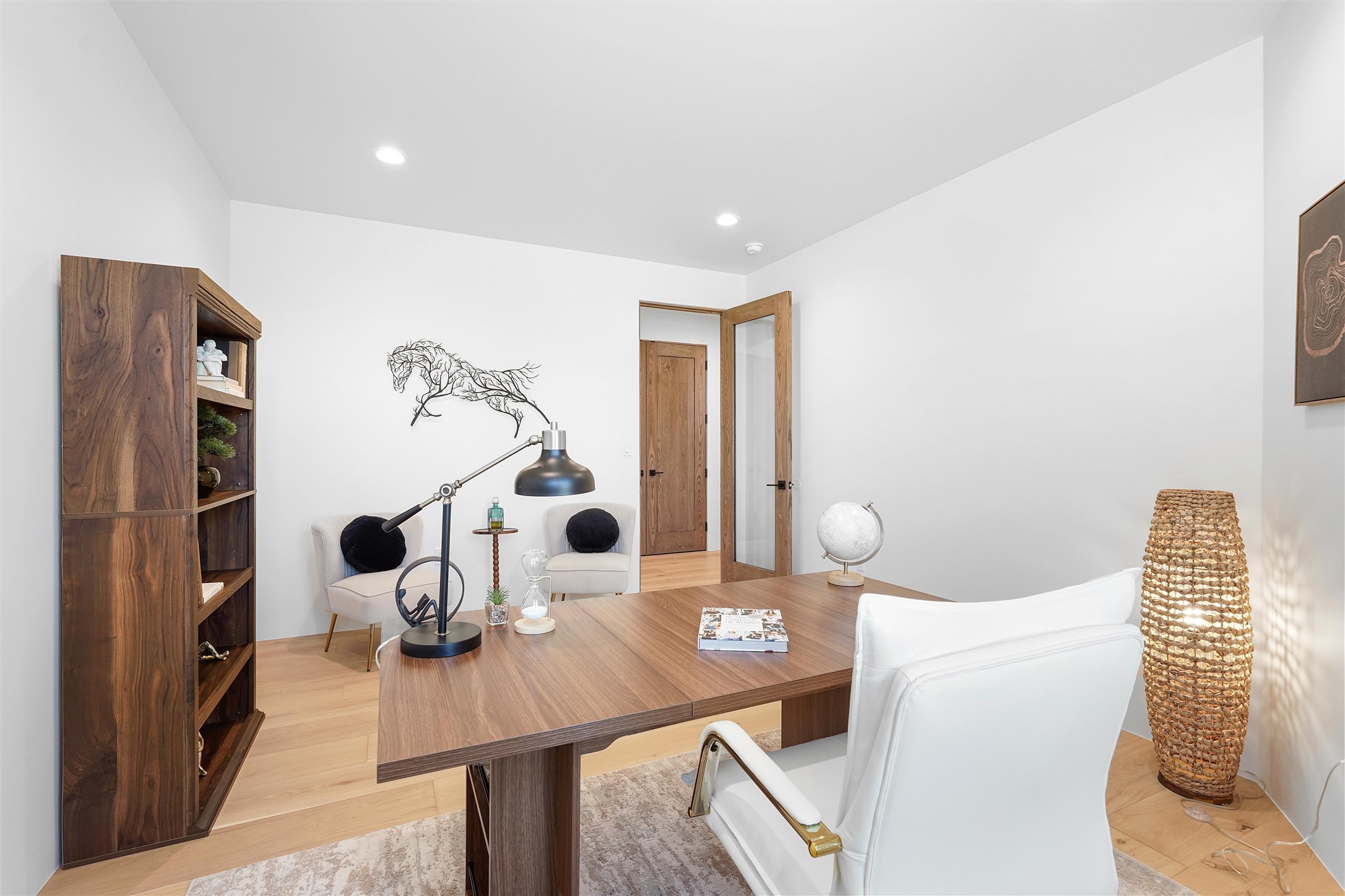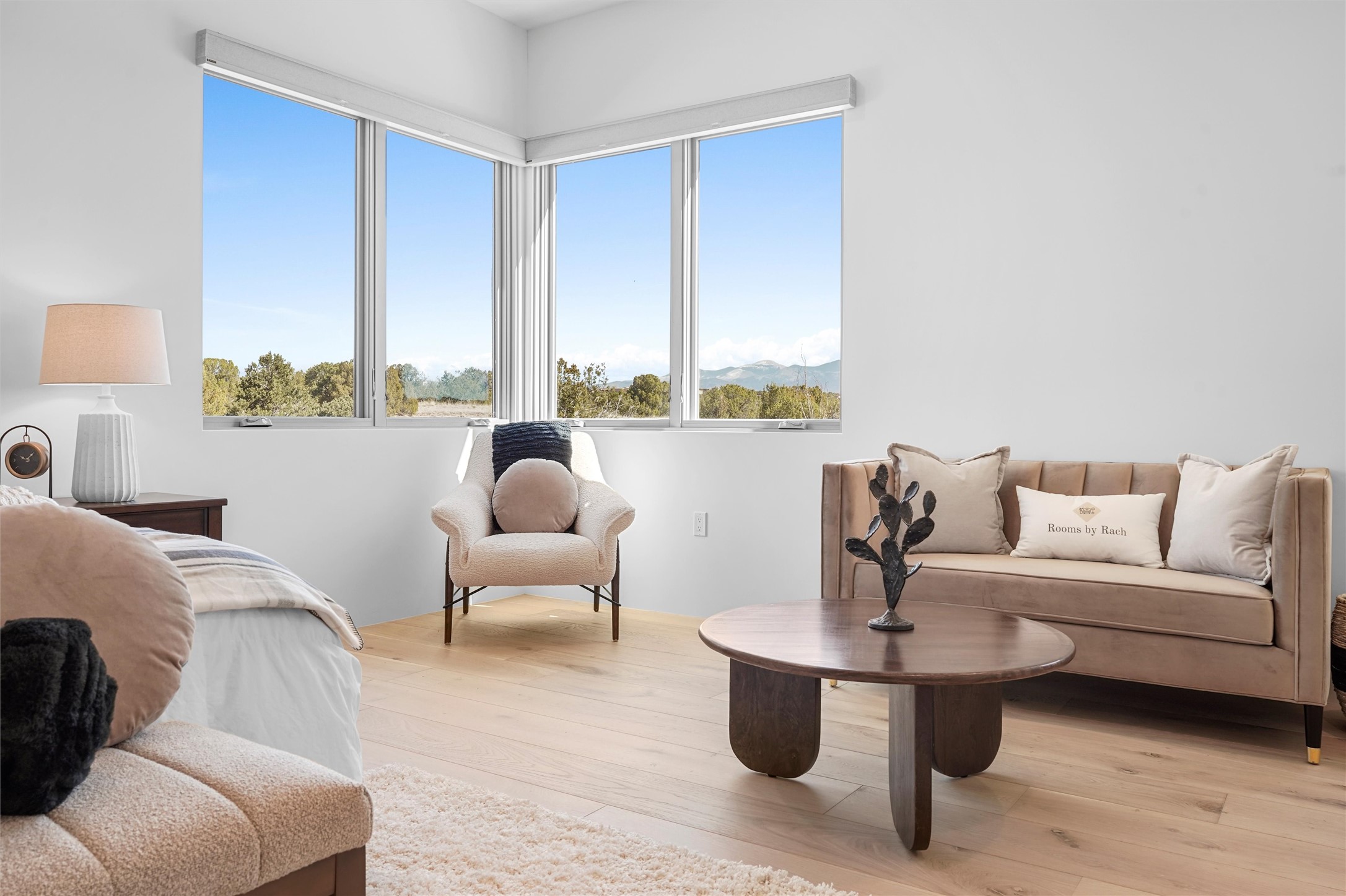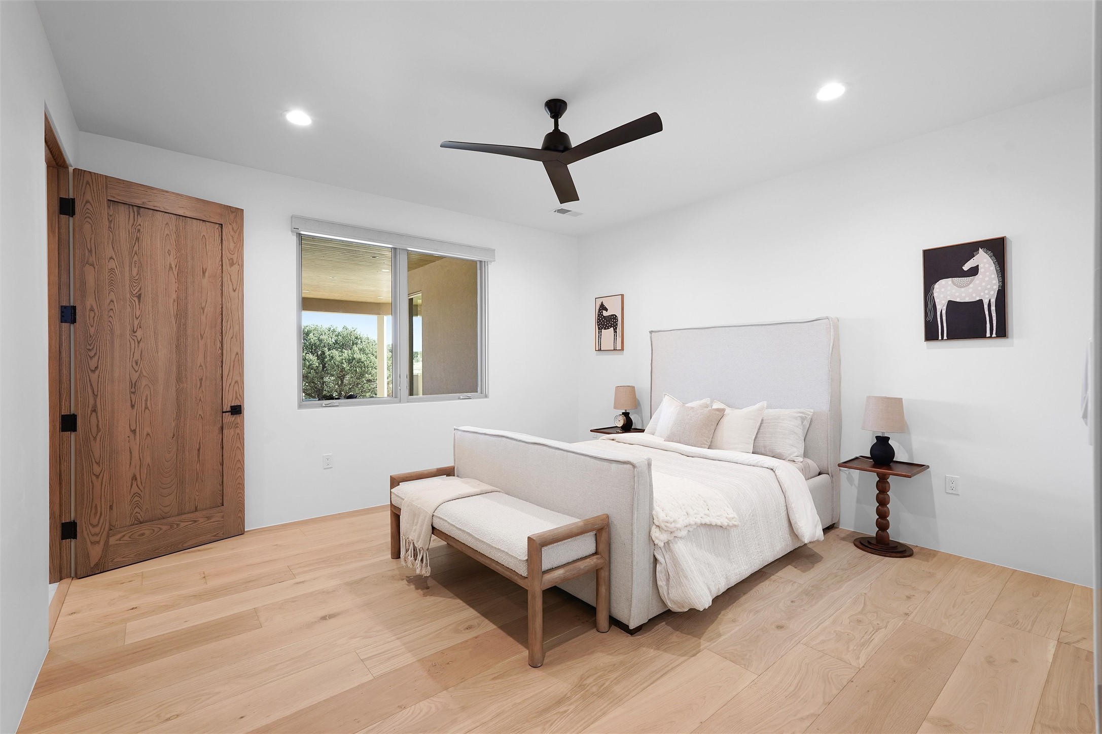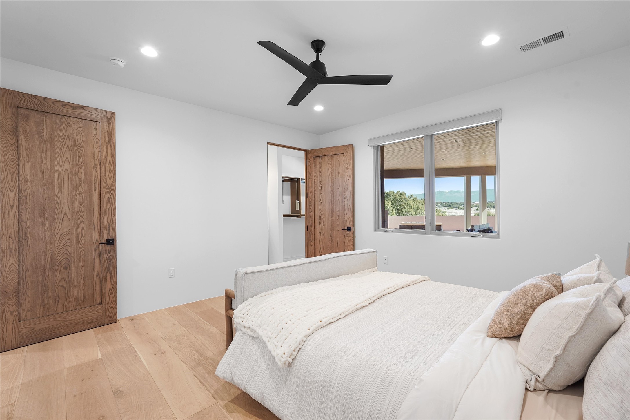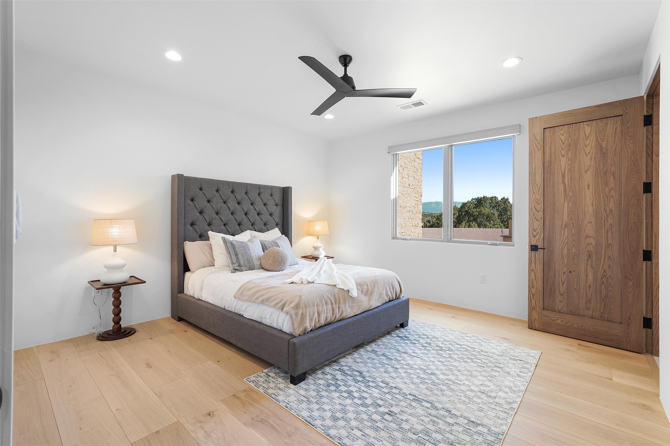 Completed in late 2025 and set on 2 acres in Las Campanas, this single level residence captures expansive views of the Sangre de Cristo Mountains and the nearby equestrian center. Built by Contreras Construction, a respected local builder known for integrity, the home reflects planning and attention to detail throughout. This home offers 4,209 square feet with three bedrooms, five bathrooms, a dedicated office, and a three-car garage with epoxy-coated flooring. The main living and dining spaces are centered around a two-way fireplace that creates a natural focal point for gathering. The kitchen features Thermador appliances, quartzite countertops, and a butler's pantry that provides additional storage and preparation space. Folding glass doors open the main living area to the outdoor patio, allowing the interior spaces to flow easily outside. The primary suite includes a fireplace and spacious bathroom including a soaking tub, rain shower, Toto bidet toilet, and porcelain tile finishes. Closet pull-downs and built-in storage elements provide practical organization throughout the home.Outdoor living areas were designed to take advantage of the surrounding views. The patio includes a built-in gas grill, mini refrigerator, and fire pit positioned for enjoying the mountain setting and open sky. Located within the gated Las Campanas community, this property offers privacy, quiet surroundings, and convenient access to Santa Fe's dining, galleries, and cultural destinations.
