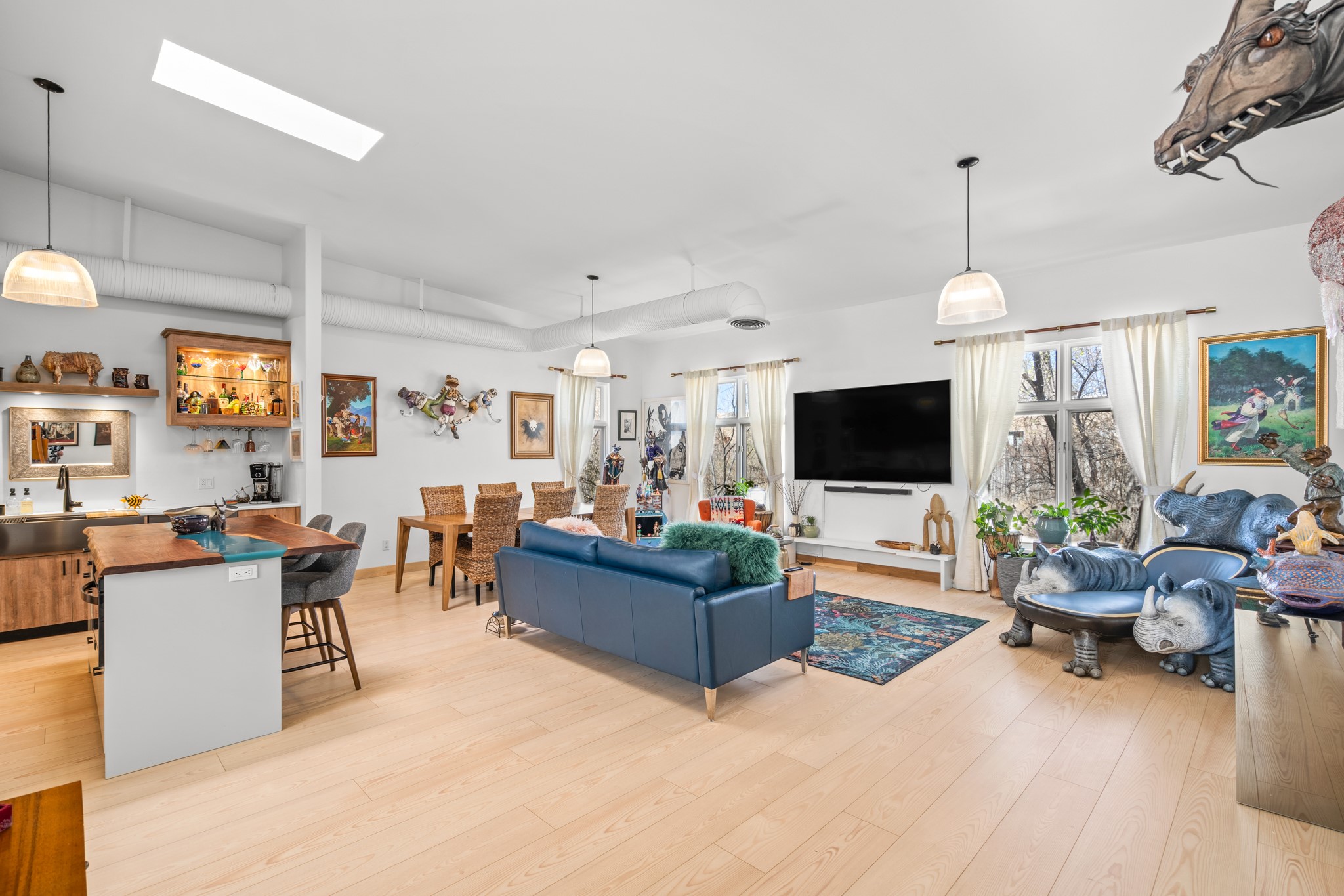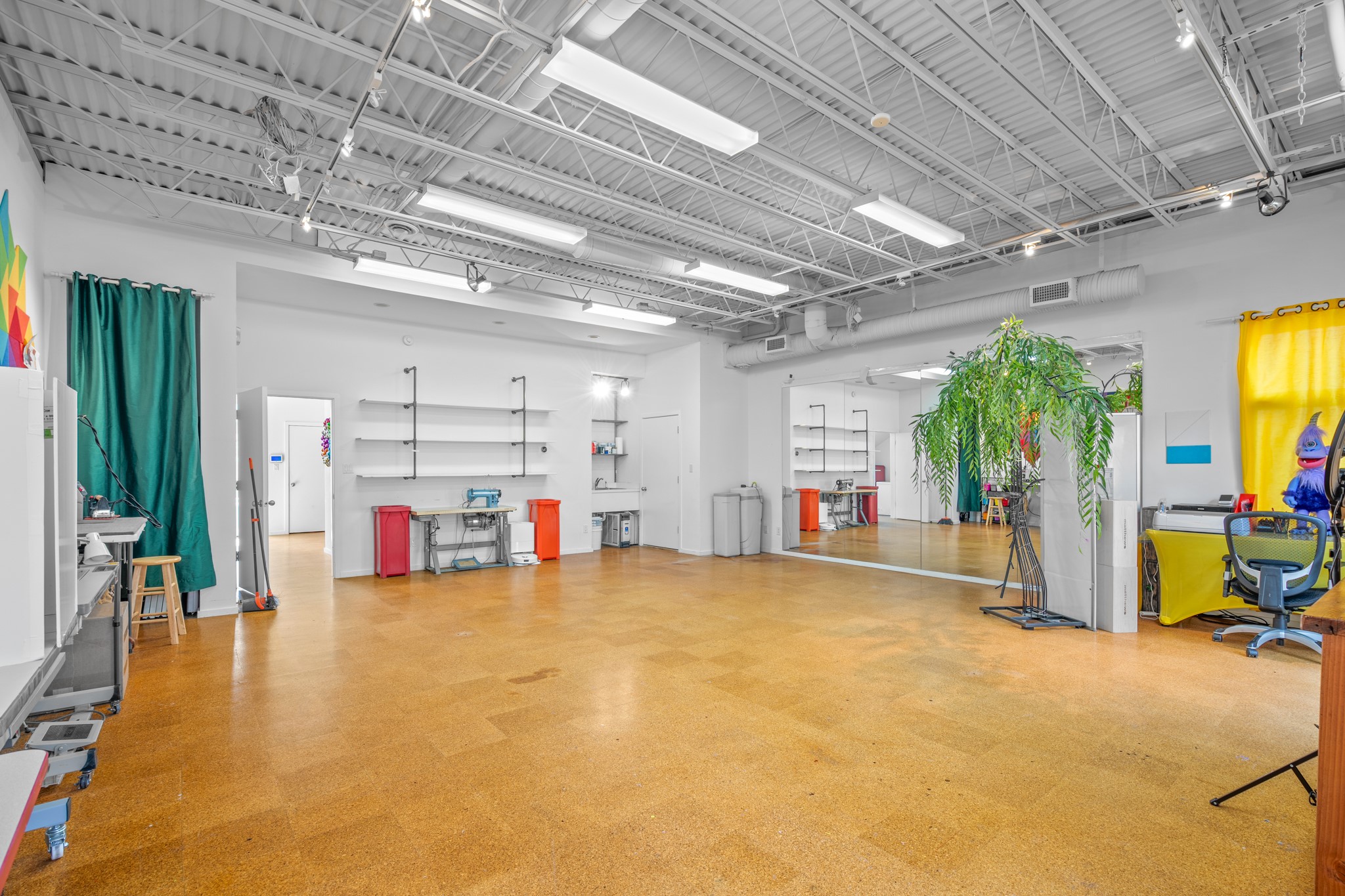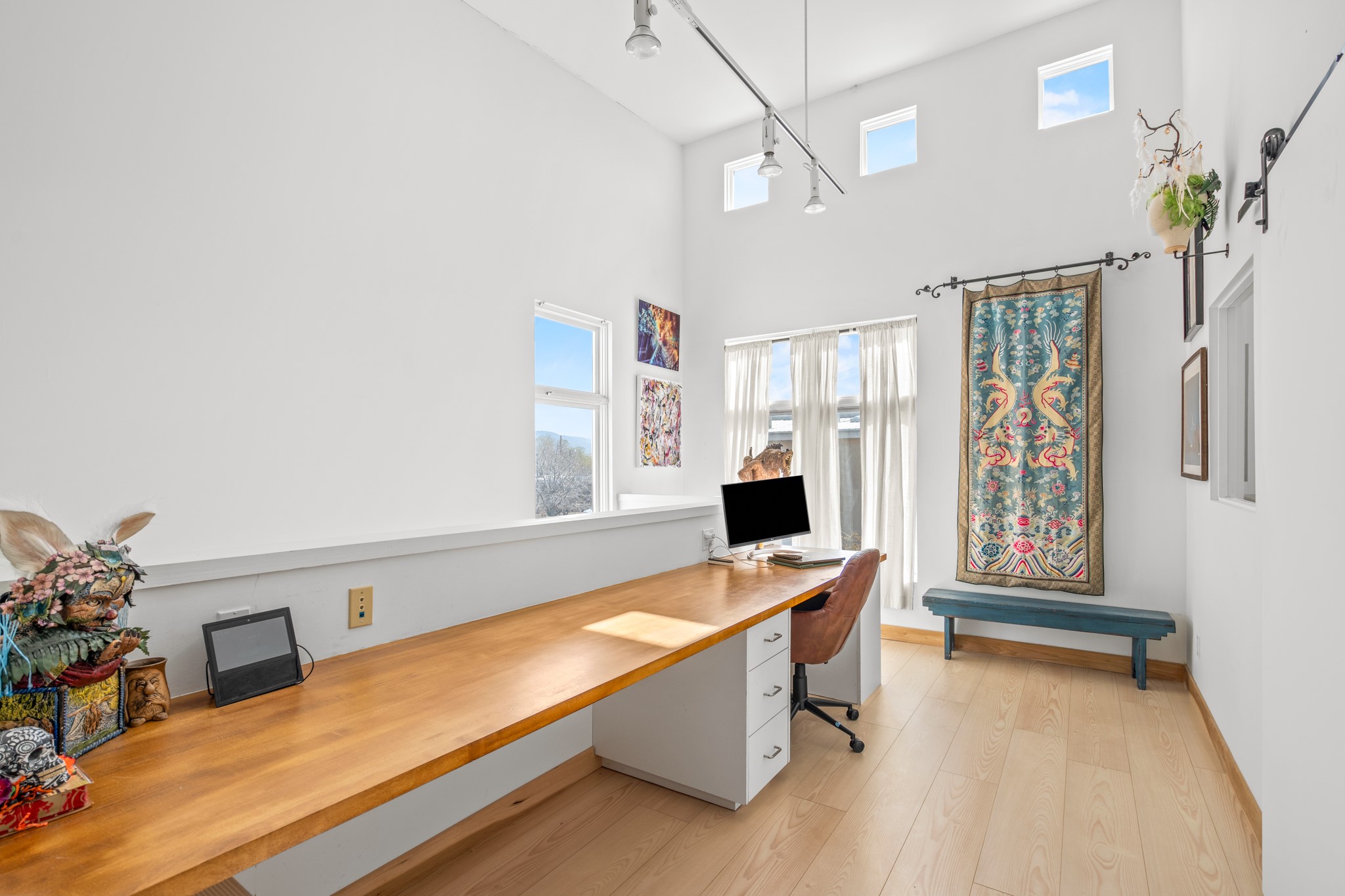 Could this be the most fabulous live / work studio in all of Santa Fe!! 2 commercially zoned live-work loft units in one.Upstairs: Completely remodeled 2 years ago. Open concept, high ceilings, very bright with skylights throughout. A 12.5x12.5 Primary Bedroom with an attached laundry space with stacked high end washer / dryer combo. The Kitchen is a high end $50K Douglas Maahs design featuring custom fixtures, custom bar / glass and lighting throughout. Many unique features were added at the time of installation. The primary bathroom is custom designed with zen copper and brass piping with wood effect tile, oversized tub and a built in bidet toilet creating a spa like feel. In the hallway there is a custom wooden work station and two stand alone closets. The open living room and dining area face a private wooded area creating a tranquil and peaceful environment.Downstairs: There is a huge 27x24 industrial space with mirrors lining one wall, cork flooring and 2 sets of french doors leading out to a tiled patio space. This room has a sink area and additional closets for storage. There are endless possibilities for this space: yoga studio, dance studio, art studio, gathering space etc. A full bath and a second 12x12 flex room for either an office, storage or a second downstairs bedroom.There are many built in custom shelve systems and plenty of storage.2550 square feet in total with the top floor and bottom floor in equal size but in different configurations. These 2 floors can be separated into 2 unique spaces or kept as one large unit. There are many businesses and private living spaces in The Lofts Complex, commercially zoned, ample parking with handicapped parking right in front ... did I mention the large dog park just a few feet away? ... Will you be the next owners to move in and make your work / live dreams come true?