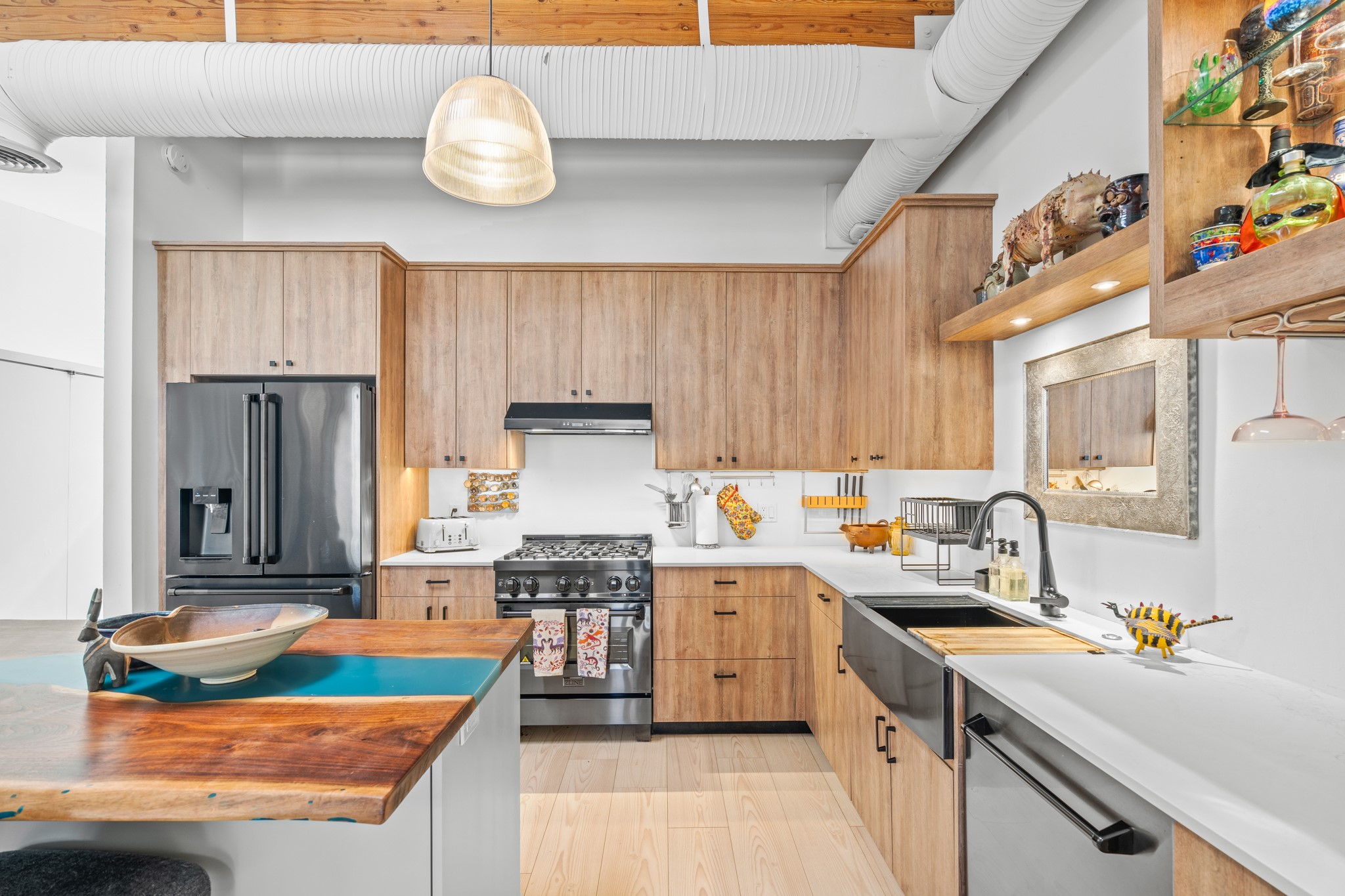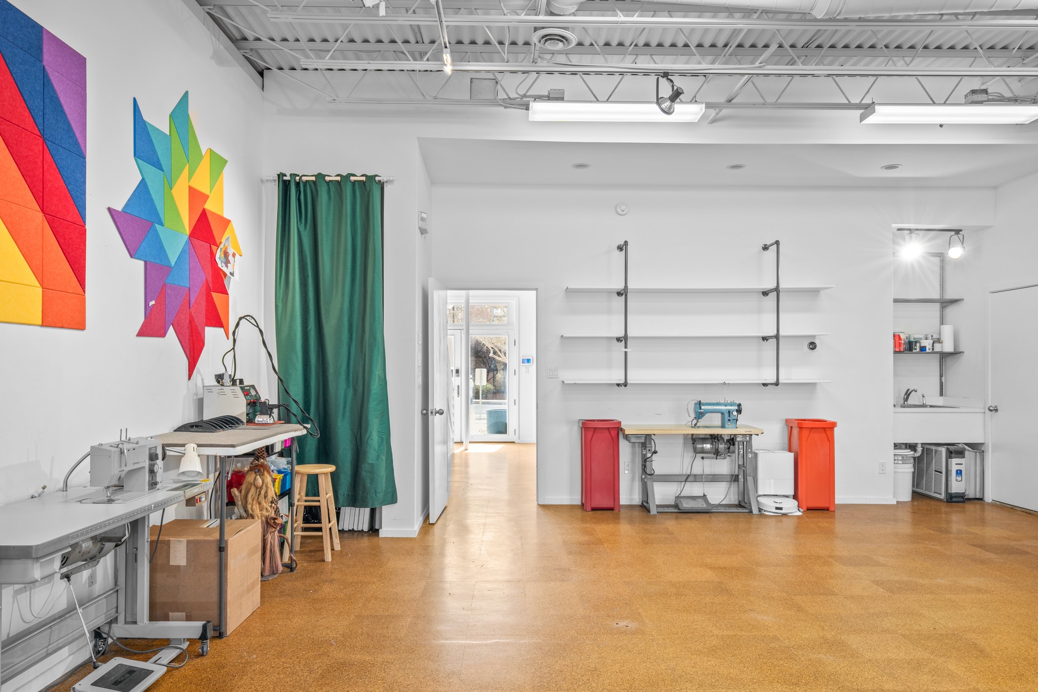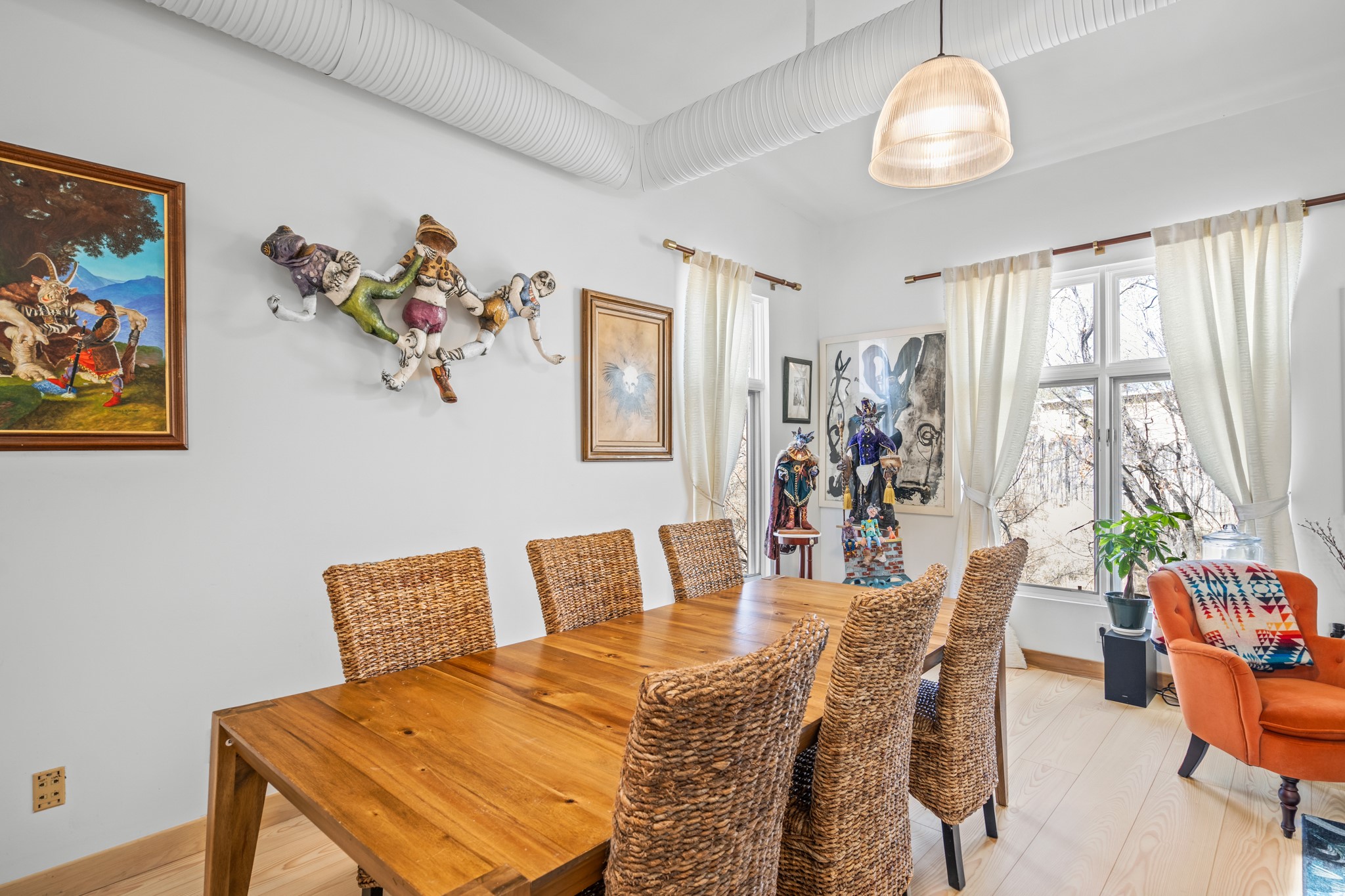 Could this be the most fabulous live / work studio in all of Santa Fe!! 2 commercially zoned live-work loft units in one.Upstairs: Completely remodeled 2 years ago. Open concept, high ceilings, very bright with skylights throughout. A 12.5x12.5 Primary Bedroom with an attached laundry space with stacked high end washer / dryer combo. The Kitchen is a high end $50K Douglas Maahs design featuring custom fixtures, custom bar / glass and lighting throughout. Many unique features were added at the time of installation. The primary bathroom is custom designed with zen copper and brass piping with wood effect tile, oversized tub and a built in bidet toilet creating a spa like feel. In the hallway there is a custom wooden work station and two stand alone closets. The open living room and dining area face a private wooded area creating a tranquil and peaceful environment.Downstairs: There is a huge 27x24 industrial space with mirrors lining one wall, cork flooring and 2 sets of french doors leading out to a tiled patio space. This room has a sink area and additional closets for storage. There are endless possibilities for this space: yoga studio, dance studio, art studio, gathering space etc. A full bath and a second 12x12 flex room for either an office, storage or a second downstairs bedroom.There are many built in custom shelve systems and plenty of storage.2550 square feet in total with the top floor and bottom floor in equal size but in different configurations. These 2 floors can be separated into 2 unique spaces or kept as one large unit. There are many businesses and private living spaces in The Lofts Complex, commercially zoned, ample parking with handicapped parking right in front ... did I mention the large dog park just a few feet away? ... Will you be the next owners to move in and make your work / live dreams come true?