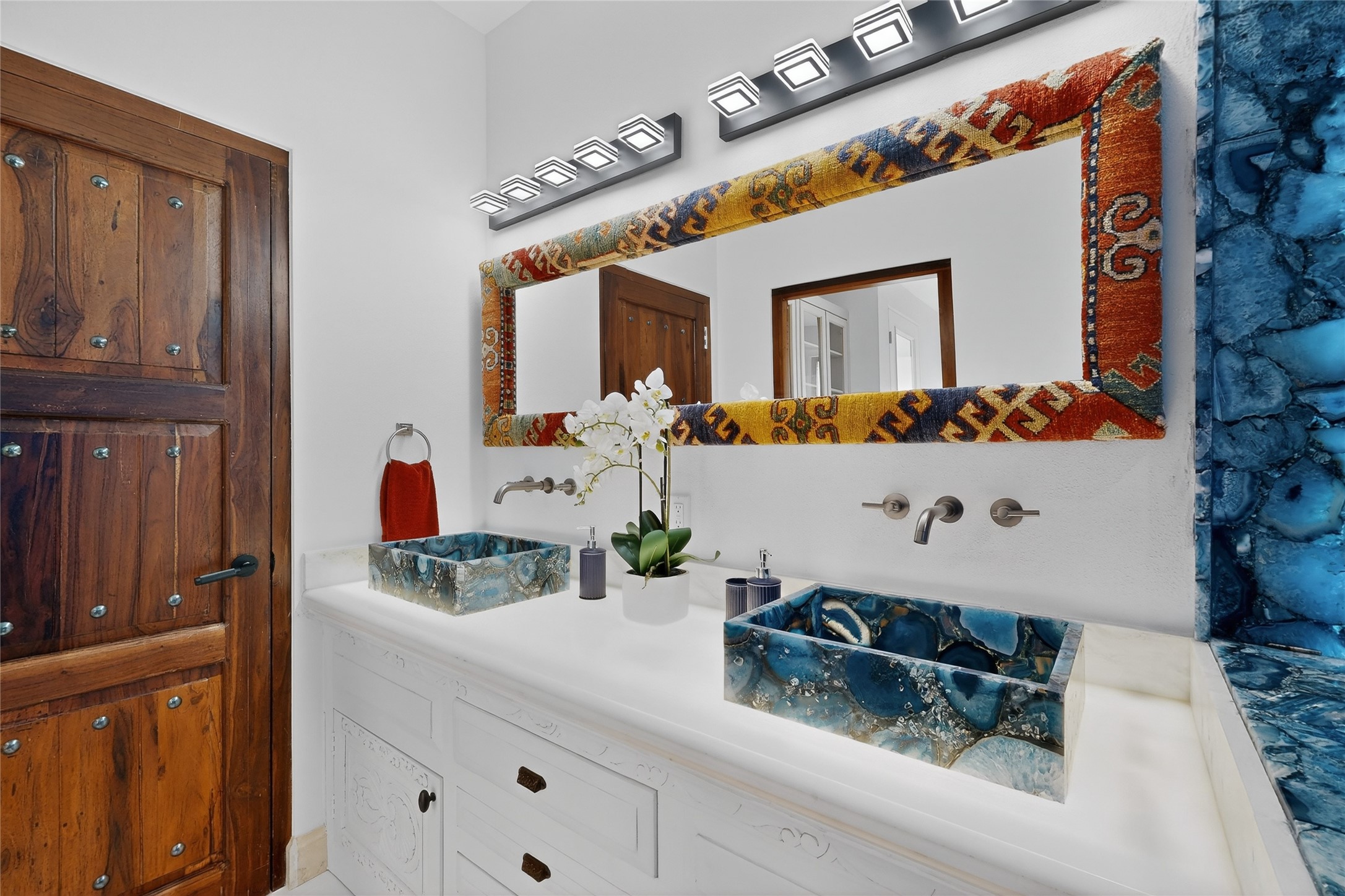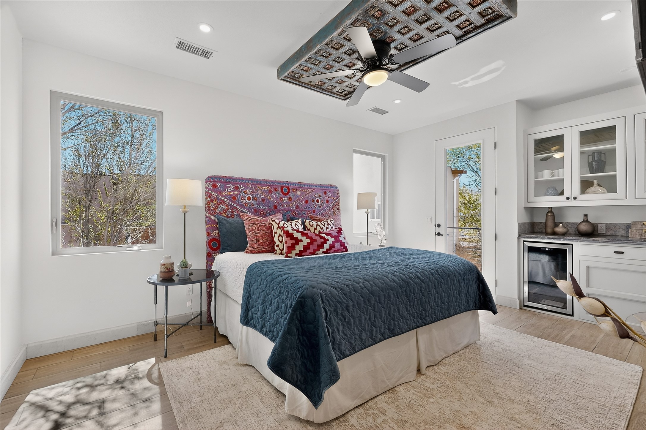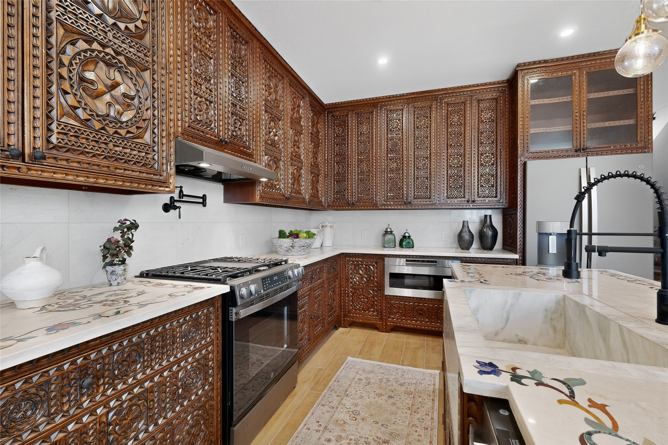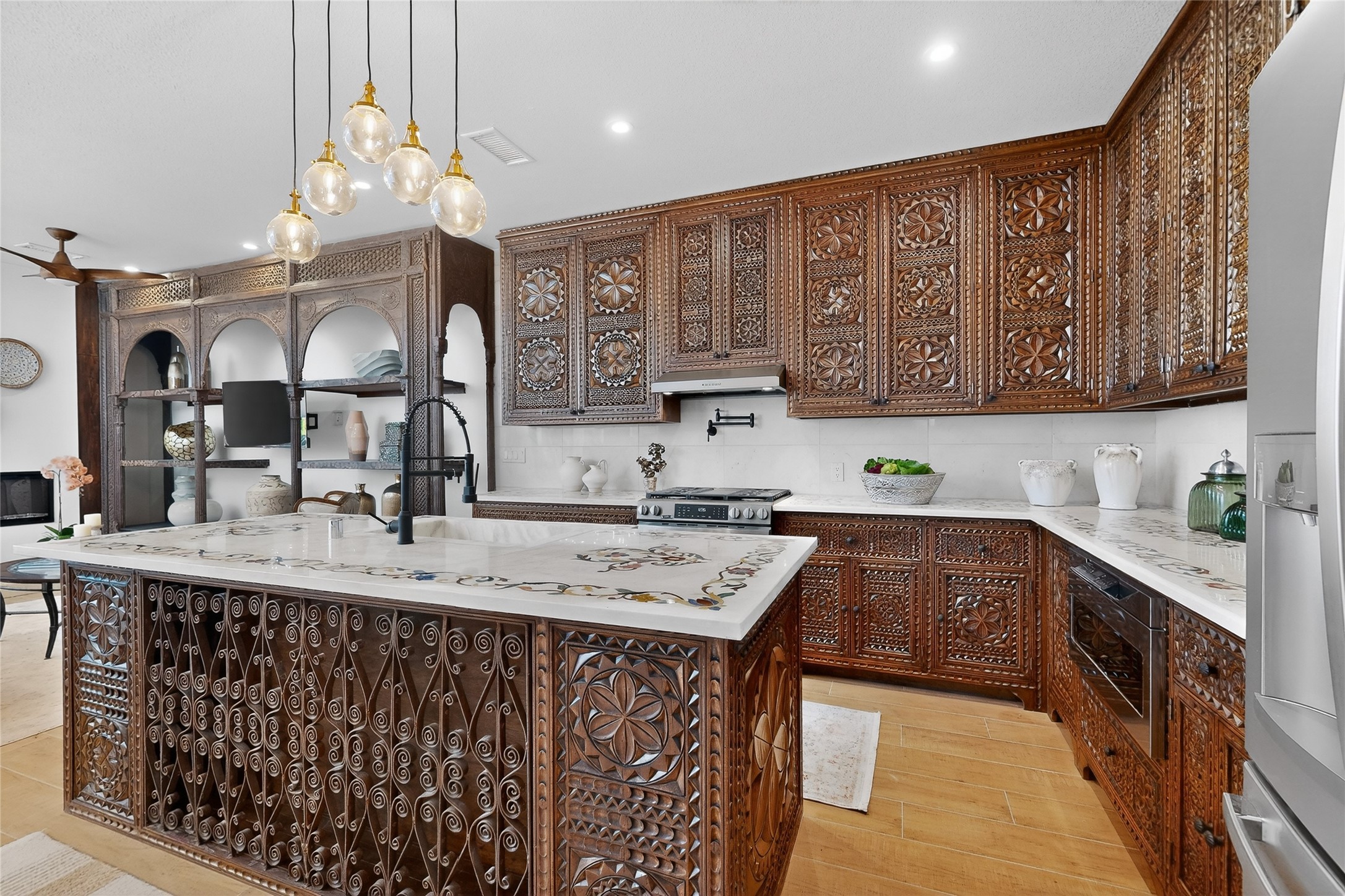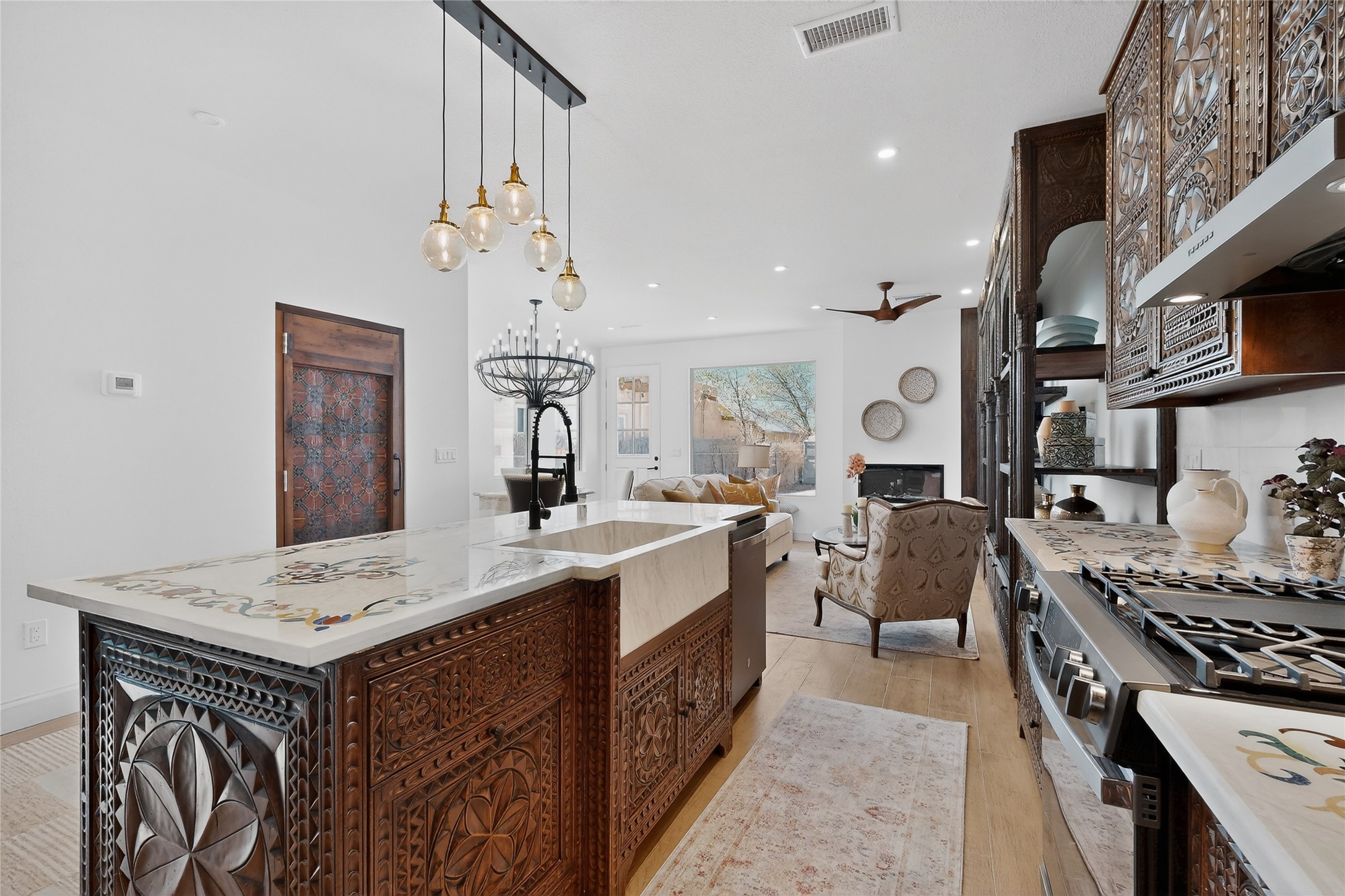 Old world craftsmanship blends seamlessly with modern luxury at the Estancia Collection, a unique compound located in the Baca Railyard District, minutes from Santa Fe's top galleries and restaurants. This latest vision of renowned developer Mitch Menaker, is where every room becomes a work of living art. Curated by artisans from around the world, using hand cut semi-precious stone, tiles, iron, and rare wood finishes creates a truly immersive and peaceful experience, as if being hugged by nature. As you enter the sanctuary, a profound sensory experience awaits: a 20-foot Anasazi-style wall creates awe and naturally anchors the home. Inside are hand-carved teak doors, alder kitchen cabinets artisan-crafted in Mexico, and Italian marble countertops inlaid with semi-precious stone, creating a fine art masterpiece. The open concept living area features a 250-year-old triple-arch entertainment center that mimics the arcade of an ancient palace. Ascending the staircase is like gliding through a canyon of stone to the bedroom suites above. The primary bedroom greets you through a charming speakeasy door. This light-filled sanctuary features a fireplace, an antique carved wooden ceiling, a wet bar and a one of a kind spa-like bathroom with blue agate sinks, set on backlit white onyx countertops. The tub/shower, surrounded by stunning backlit blue agate panels, creates a luxurious and luminous retreat. The second light-filled bedroom features a bathroom with a hand-carved Mexican vanity and petrified wood sink atop a white onyx counter. The museum-quality shower/tub is framed in petrified wood squares, hand-assembled to create a puzzle pattern.The laundry room, located on the 2nd floor includes a dog shower covered with "happy dog" faces on each hand cut tile. Blending ancient techniques with the expert hands that brought them to life, the developer's vision has created the most unique visual and artistic sanctuary Santa Fe has seen in years.