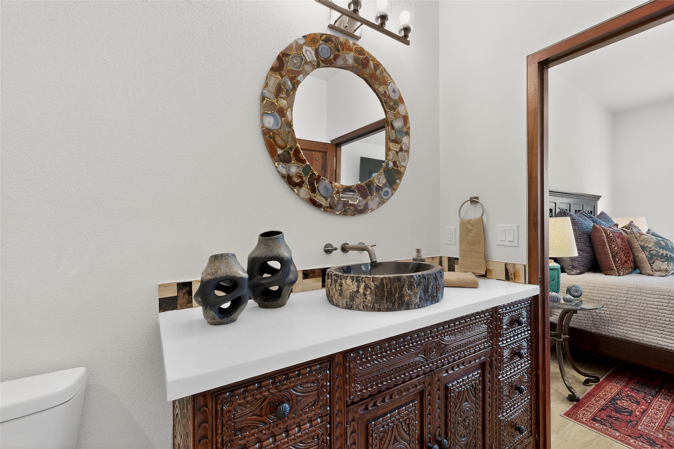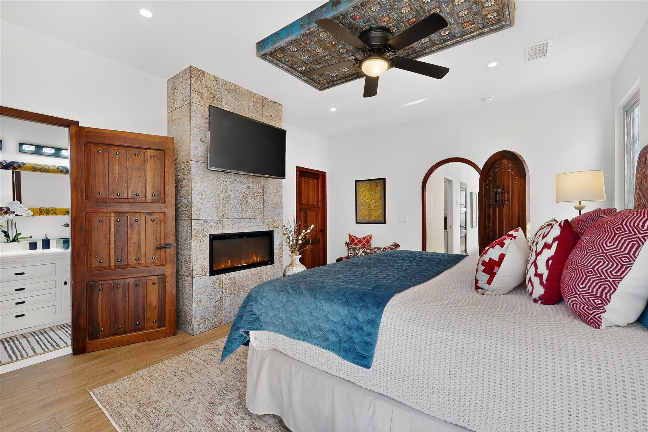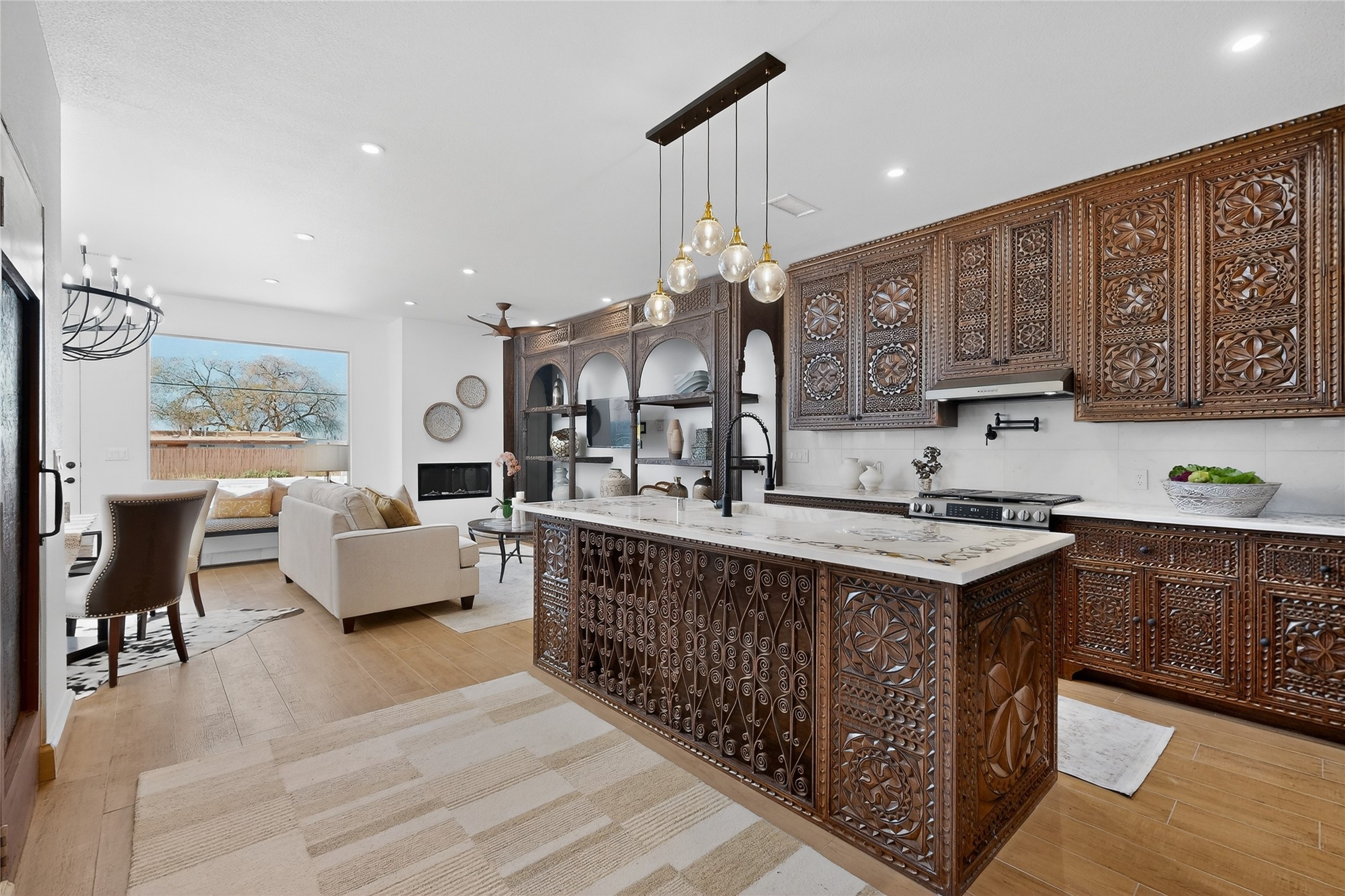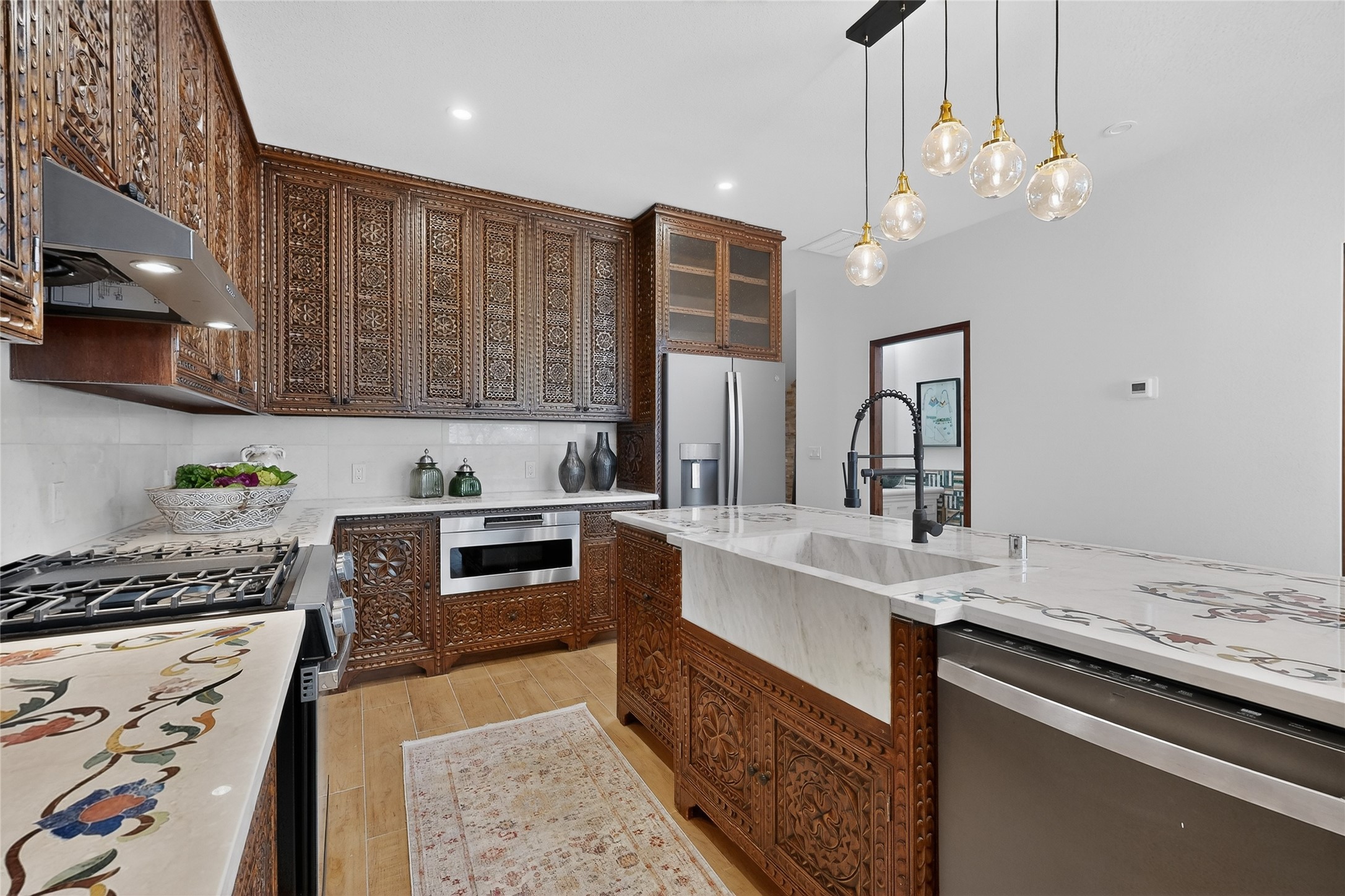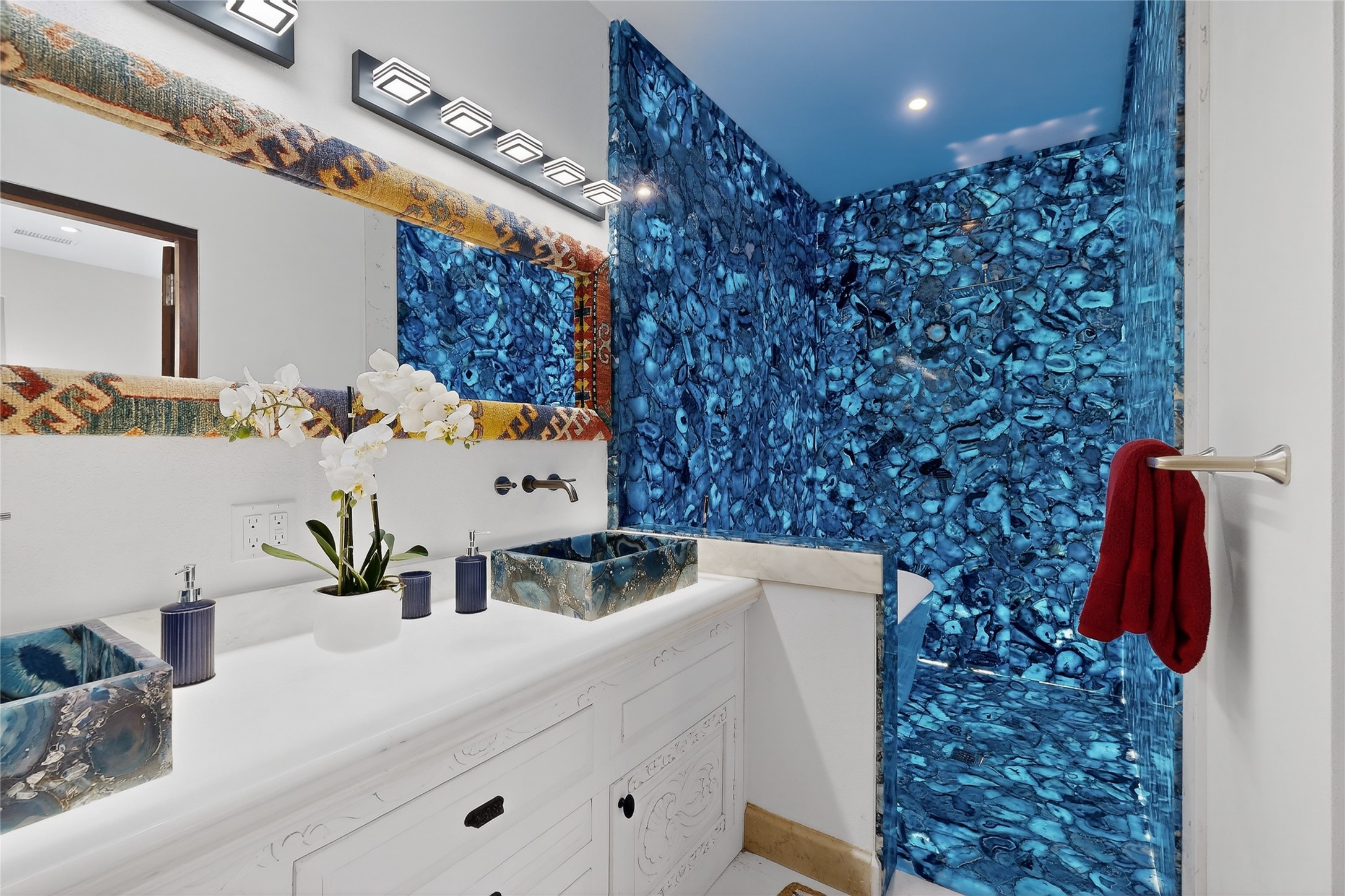 Old world craftsmanship blends seamlessly with modern luxury at the Estancia Collection, a unique compound located in the Baca Railyard District, minutes from Santa Fe's top galleries and restaurants. This latest vision of renowned developer Mitch Menaker, is where every room becomes a work of living art. Curated by artisans from around the world, using hand cut semi-precious stone, tiles, iron, and rare wood finishes creates a truly immersive and peaceful experience, as if being hugged by nature. As you enter the sanctuary, a profound sensory experience awaits: a 20-foot Anasazi-style wall creates awe and naturally anchors the home. Inside are hand-carved teak doors, alder kitchen cabinets artisan-crafted in Mexico, and Italian marble countertops inlaid with semi-precious stone, creating a fine art masterpiece. The open concept living area features a 250-year-old triple-arch entertainment center that mimics the arcade of an ancient palace. Ascending the staircase is like gliding through a canyon of stone to the bedroom suites above. The primary bedroom greets you through a charming speakeasy door. This light-filled sanctuary features a fireplace, an antique carved wooden ceiling, a wet bar and a one of a kind spa-like bathroom with blue agate sinks, set on backlit white onyx countertops. The tub/shower, surrounded by stunning backlit blue agate panels, creates a luxurious and luminous retreat. The second light-filled bedroom features a bathroom with a hand-carved Mexican vanity and petrified wood sink atop a white onyx counter. The museum-quality shower/tub is framed in petrified wood squares, hand-assembled to create a puzzle pattern.The laundry room, located on the 2nd floor includes a dog shower covered with "happy dog" faces on each hand cut tile. Blending ancient techniques with the expert hands that brought them to life, the developer's vision has created the most unique visual and artistic sanctuary Santa Fe has seen in years.
