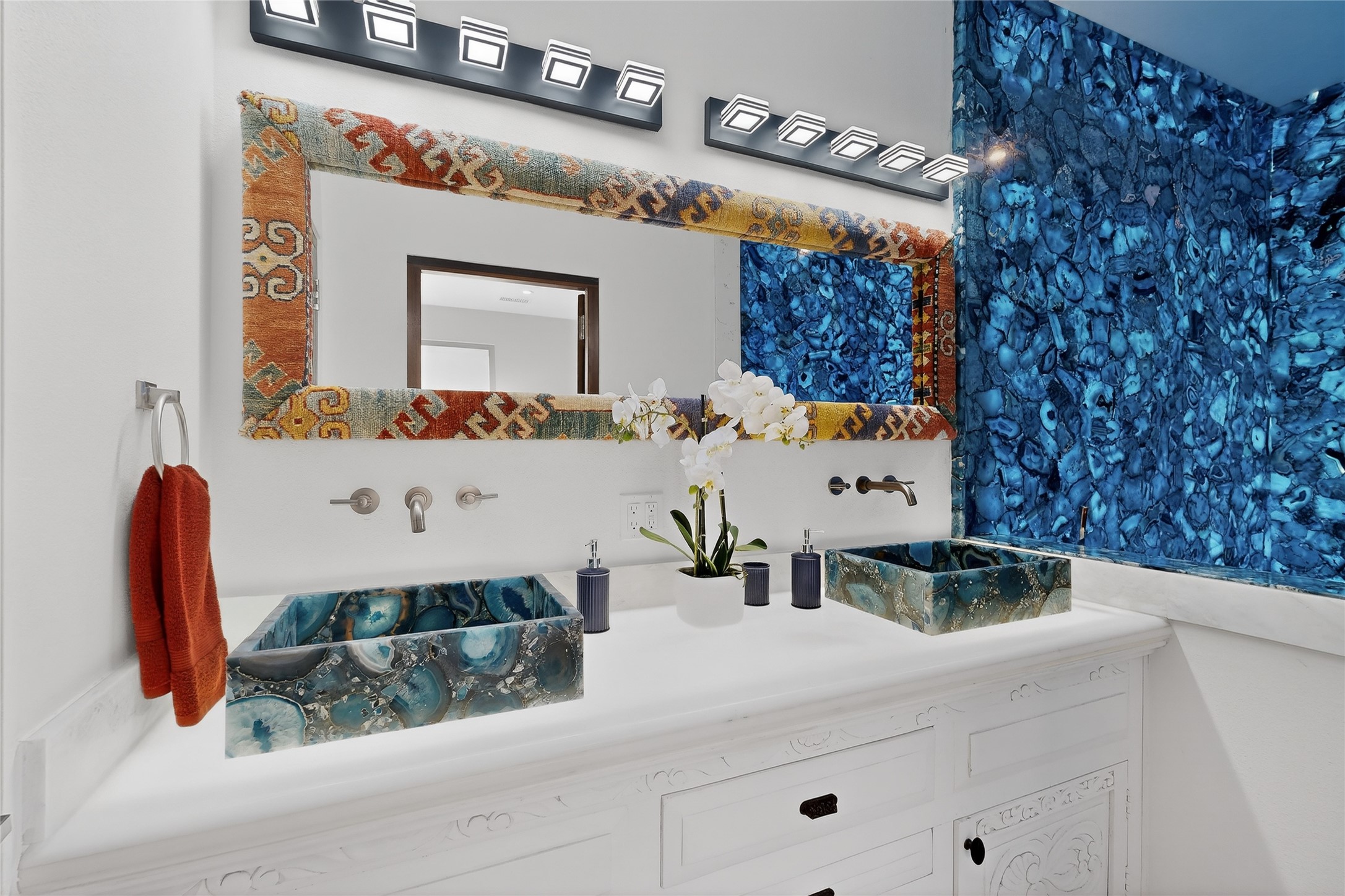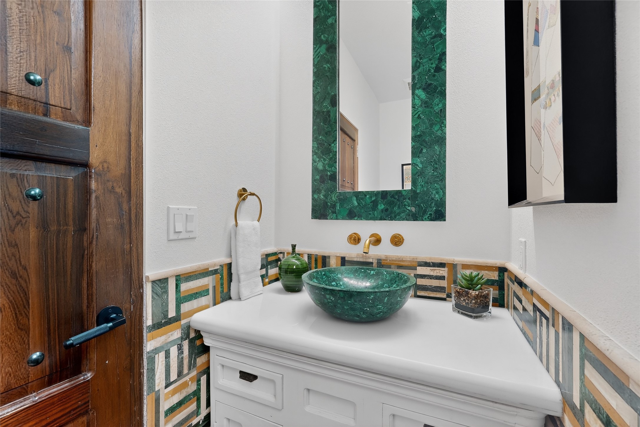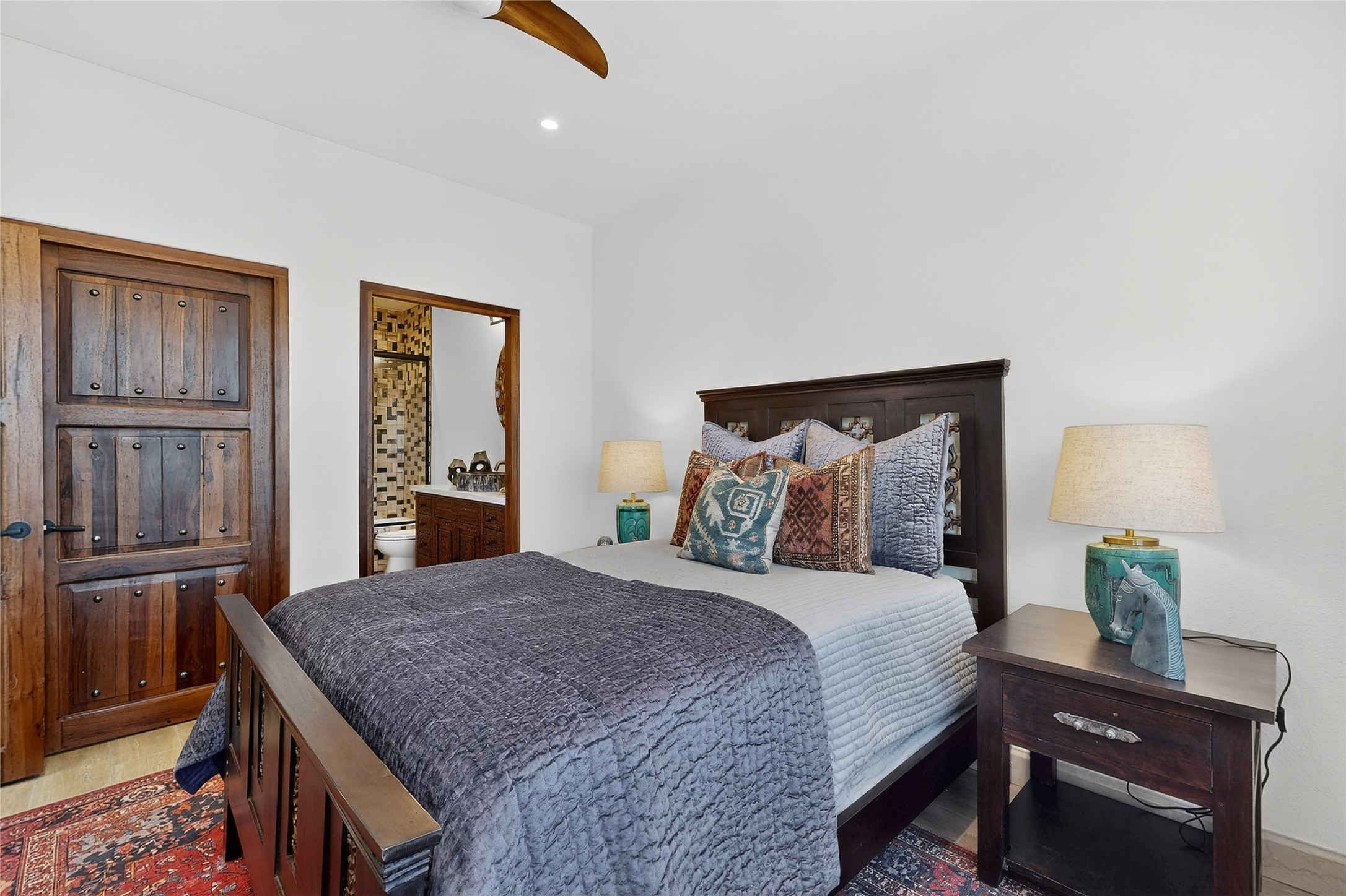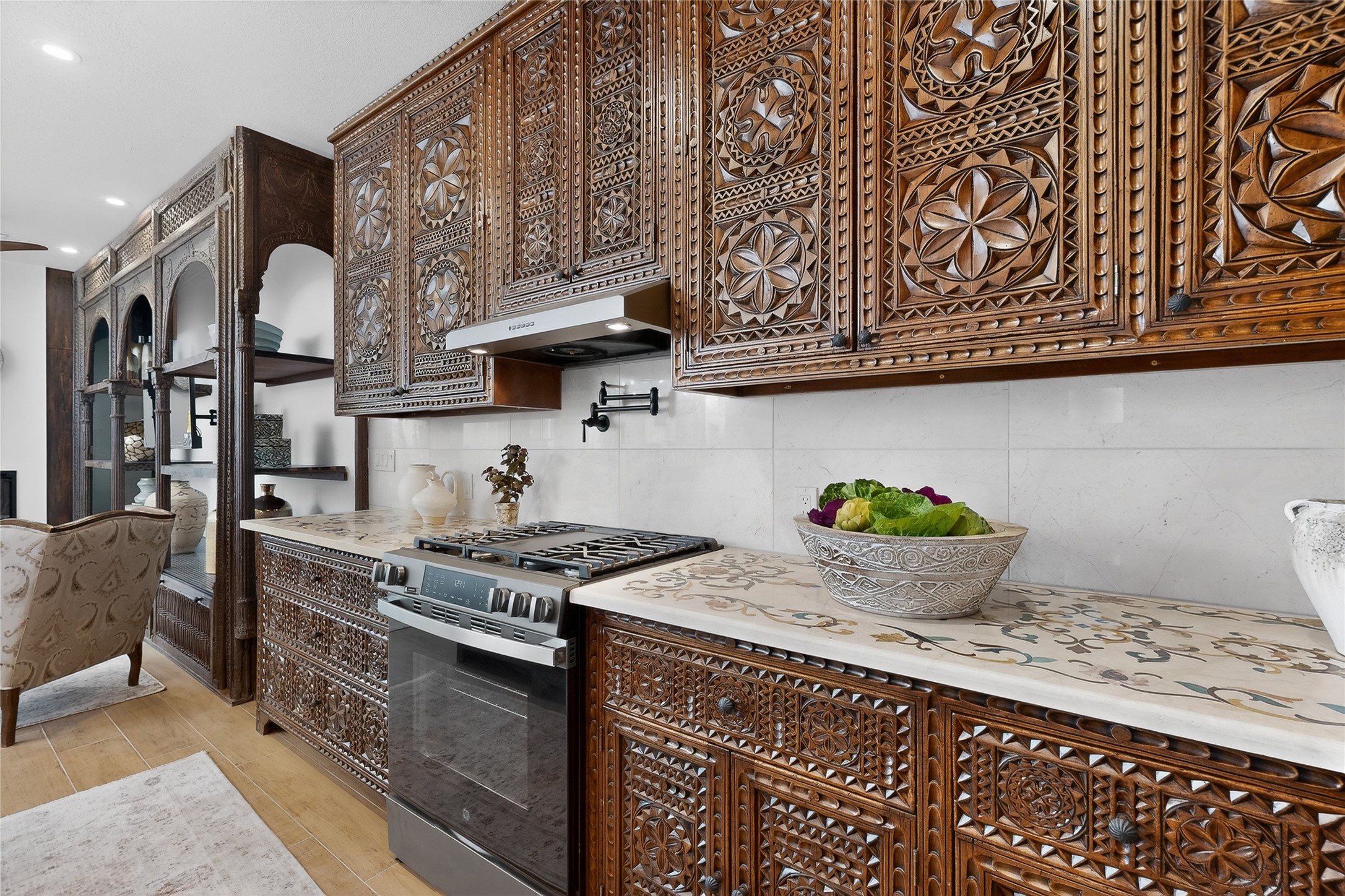 Old world craftsmanship blends seamlessly with modern luxury at the Estancia Collection, a unique compound located in the Baca Railyard District, minutes from Santa Fe's top galleries and restaurants. This latest vision of renowned developer Mitch Menaker, is where every room becomes a work of living art. Curated by artisans from around the world, using hand cut semi-precious stone, tiles, iron, and rare wood finishes creates a truly immersive and peaceful experience, as if being hugged by nature. As you enter the sanctuary, a profound sensory experience awaits: a 20-foot Anasazi-style wall creates awe and naturally anchors the home. Inside are hand-carved teak doors, alder kitchen cabinets artisan-crafted in Mexico, and Italian marble countertops inlaid with semi-precious stone, creating a fine art masterpiece. The open concept living area features a 250-year-old triple-arch entertainment center that mimics the arcade of an ancient palace. Ascending the staircase is like gliding through a canyon of stone to the bedroom suites above. The primary bedroom greets you through a charming speakeasy door. This light-filled sanctuary features a fireplace, an antique carved wooden ceiling, a wet bar and a one of a kind spa-like bathroom with blue agate sinks, set on backlit white onyx countertops. The tub/shower, surrounded by stunning backlit blue agate panels, creates a luxurious and luminous retreat. The second light-filled bedroom features a bathroom with a hand-carved Mexican vanity and petrified wood sink atop a white onyx counter. The museum-quality shower/tub is framed in petrified wood squares, hand-assembled to create a puzzle pattern.The laundry room, located on the 2nd floor includes a dog shower covered with "happy dog" faces on each hand cut tile. Blending ancient techniques with the expert hands that brought them to life, the developer's vision has created the most unique visual and artistic sanctuary Santa Fe has seen in years.