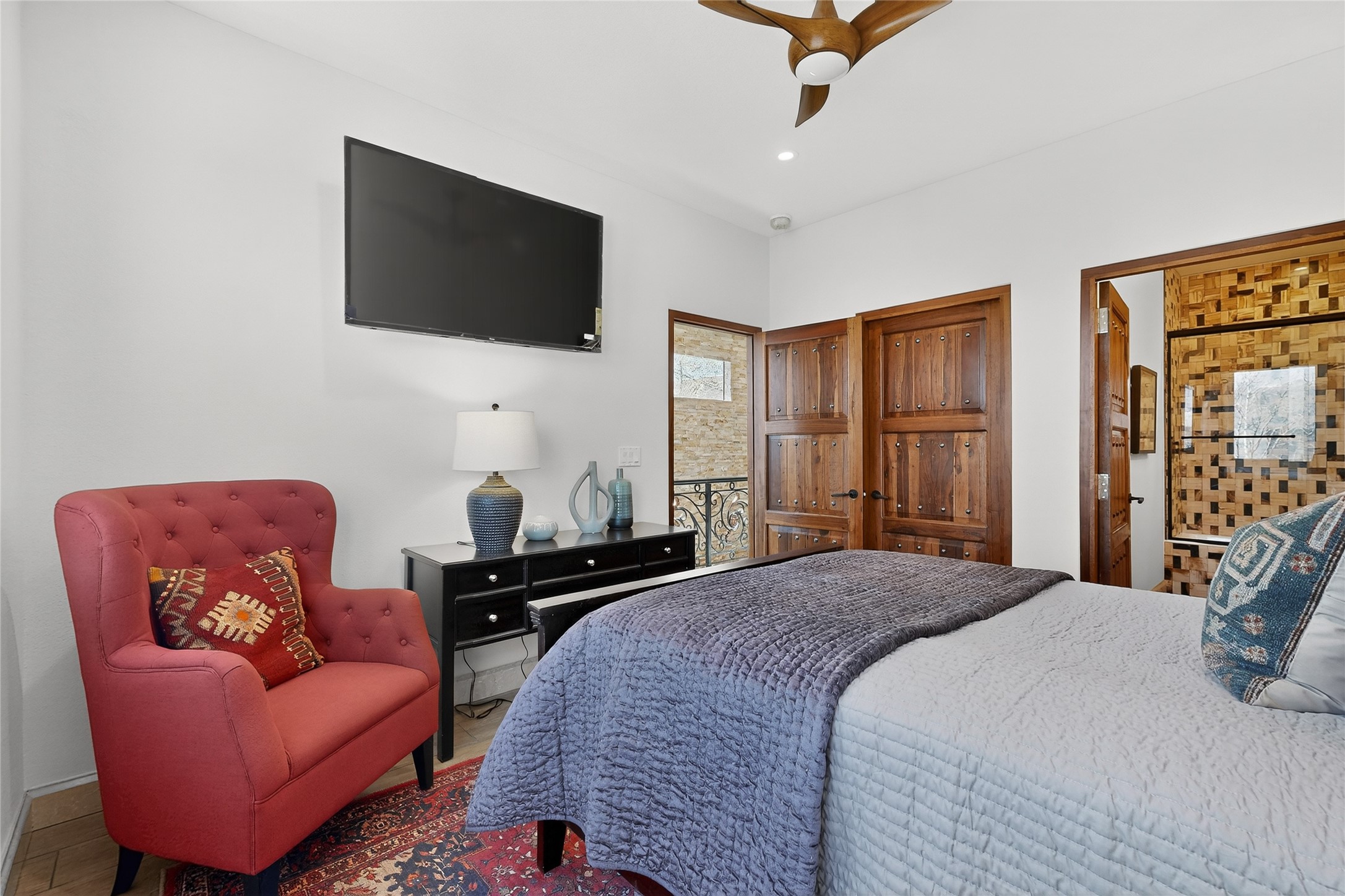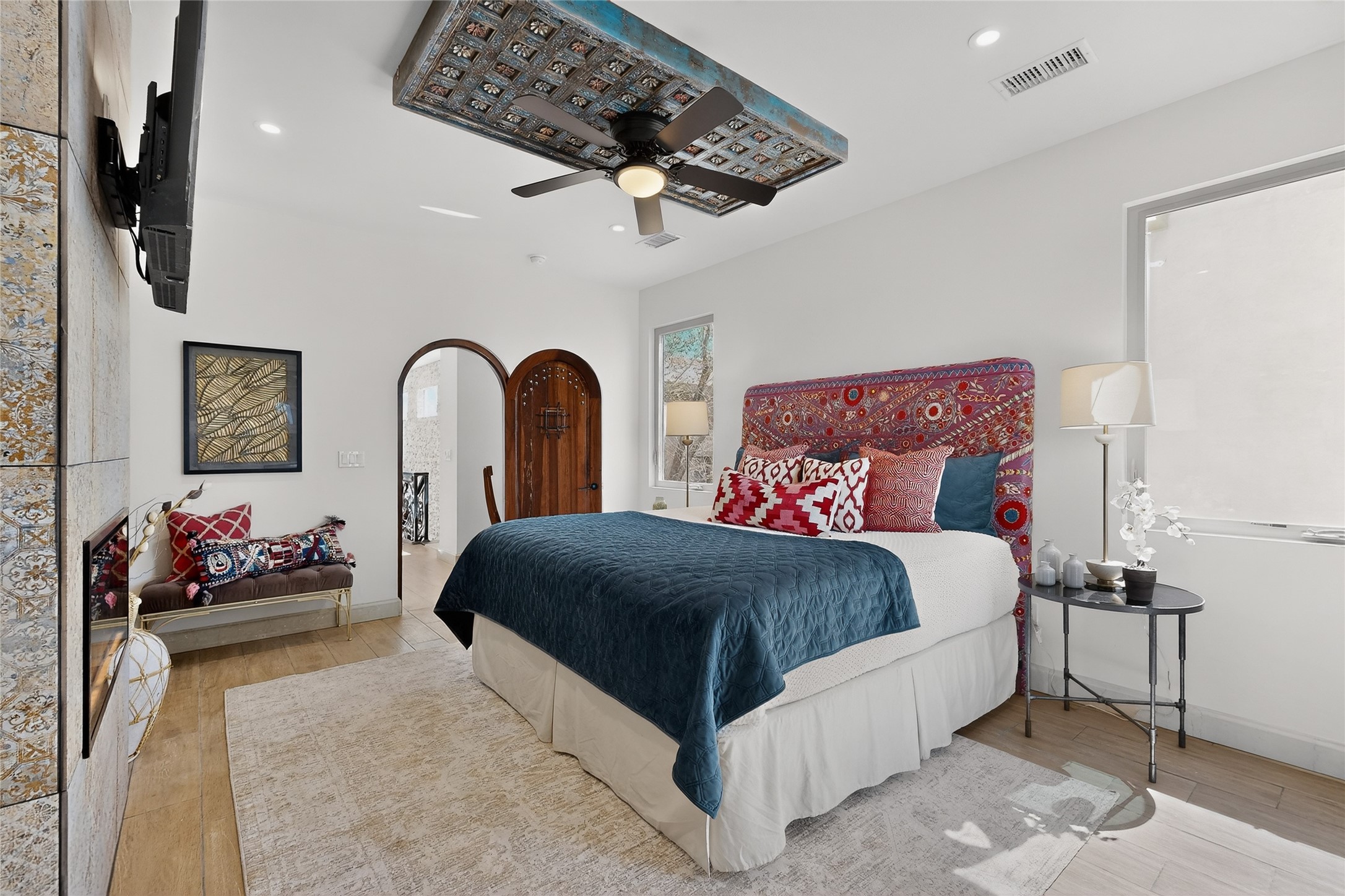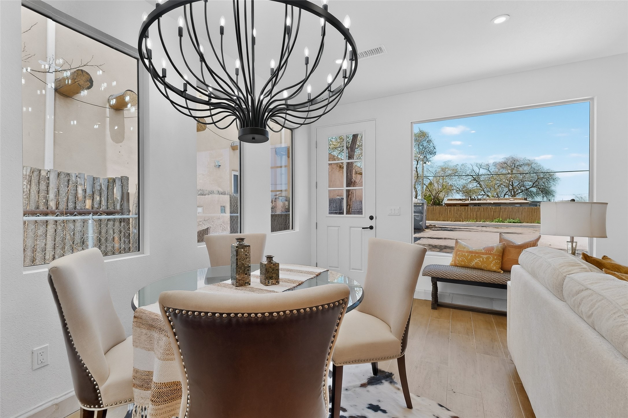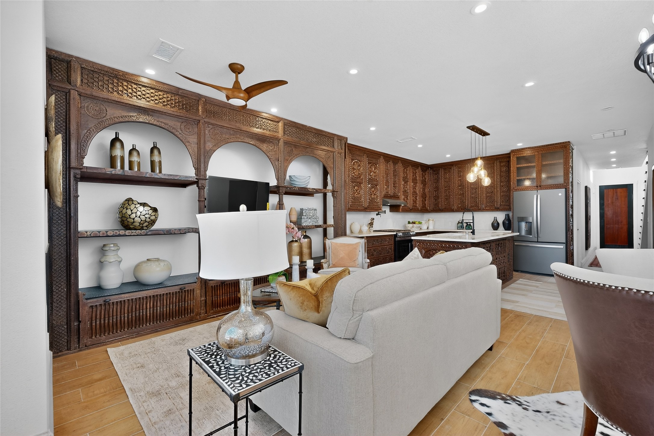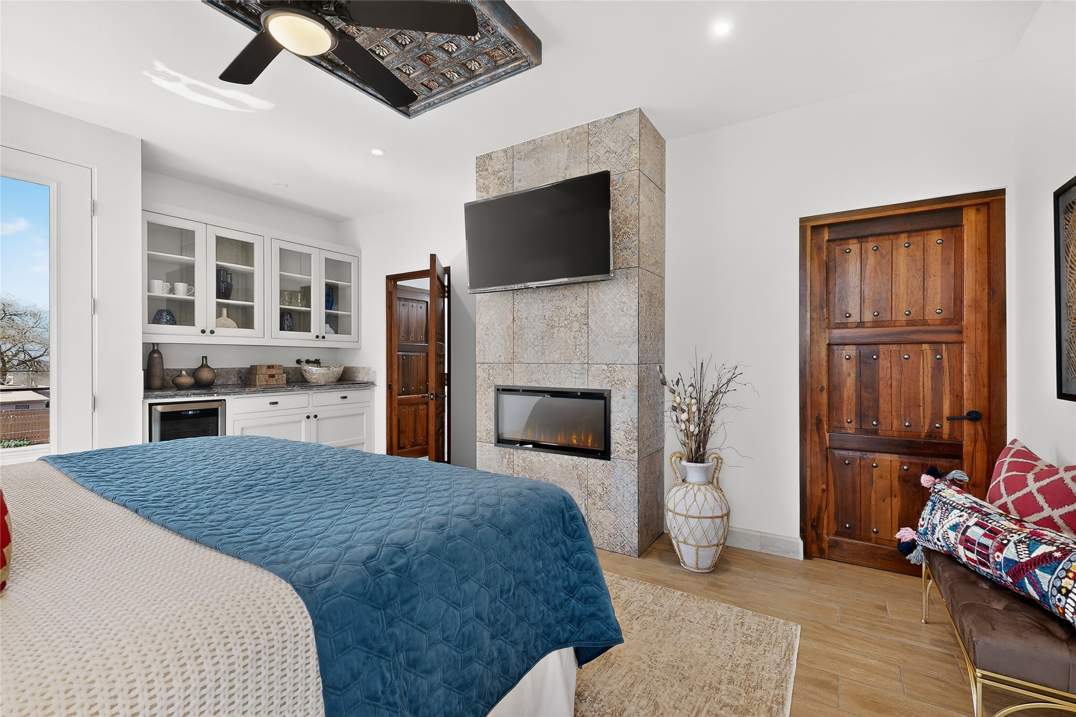 Old world craftsmanship blends seamlessly with modern luxury at the Estancia Collection, a unique compound located in the Baca Railyard District, minutes from Santa Fe's top galleries and restaurants. This latest vision of renowned developer Mitch Menaker, is where every room becomes a work of living art. Curated by artisans from around the world, using hand cut semi-precious stone, tiles, iron, and rare wood finishes creates a truly immersive and peaceful experience, as if being hugged by nature. As you enter the sanctuary, a profound sensory experience awaits: a 20-foot Anasazi-style wall creates awe and naturally anchors the home. Inside are hand-carved teak doors, alder kitchen cabinets artisan-crafted in Mexico, and Italian marble countertops inlaid with semi-precious stone, creating a fine art masterpiece. The open concept living area features a 250-year-old triple-arch entertainment center that mimics the arcade of an ancient palace. Ascending the staircase is like gliding through a canyon of stone to the bedroom suites above. The primary bedroom greets you through a charming speakeasy door. This light-filled sanctuary features a fireplace, an antique carved wooden ceiling, a wet bar and a one of a kind spa-like bathroom with blue agate sinks, set on backlit white onyx countertops. The tub/shower, surrounded by stunning backlit blue agate panels, creates a luxurious and luminous retreat. The second light-filled bedroom features a bathroom with a hand-carved Mexican vanity and petrified wood sink atop a white onyx counter. The museum-quality shower/tub is framed in petrified wood squares, hand-assembled to create a puzzle pattern.The laundry room, located on the 2nd floor includes a dog shower covered with "happy dog" faces on each hand cut tile. Blending ancient techniques with the expert hands that brought them to life, the developer's vision has created the most unique visual and artistic sanctuary Santa Fe has seen in years.