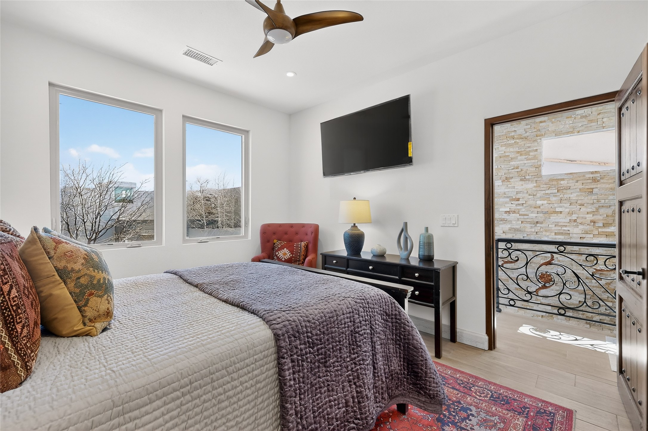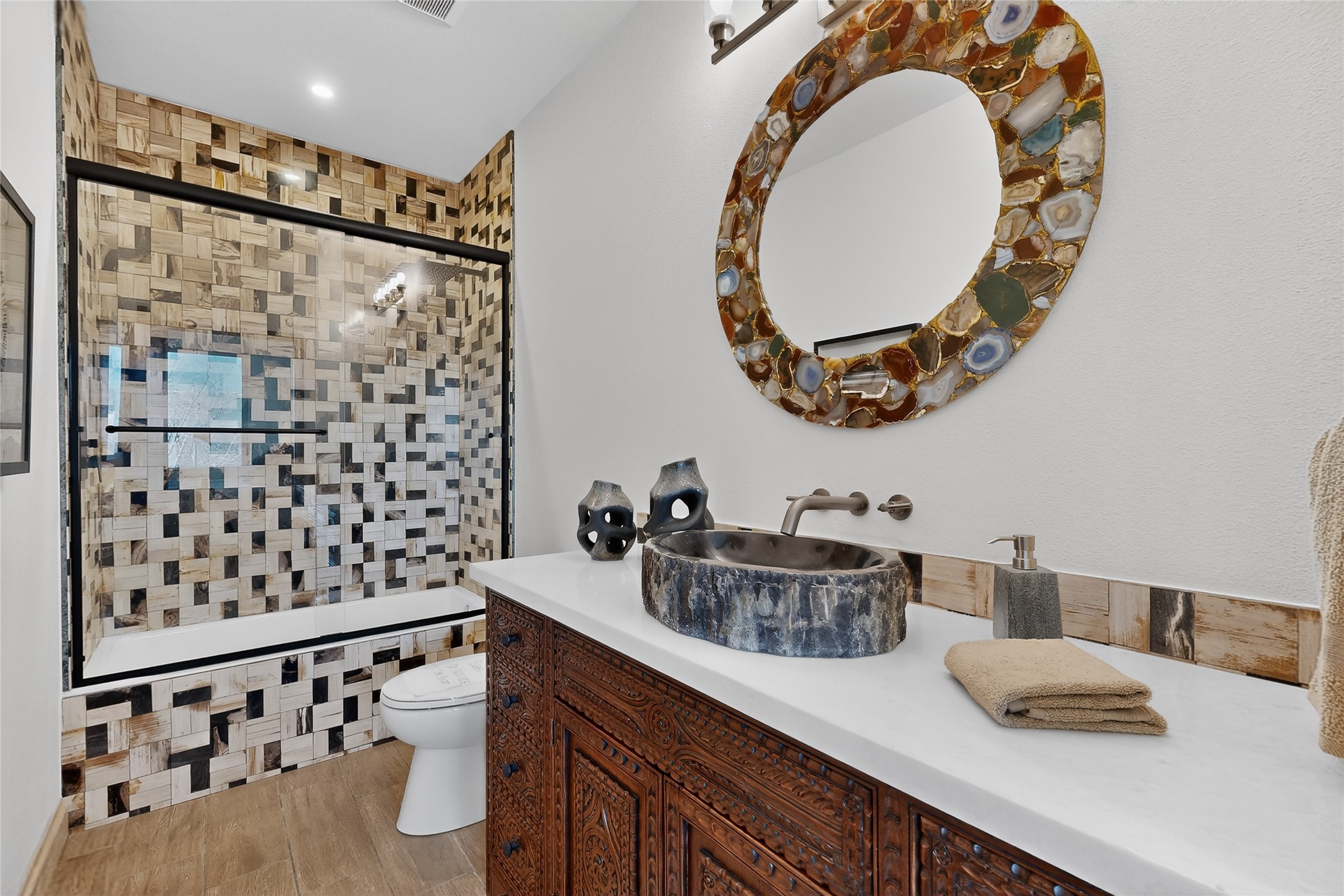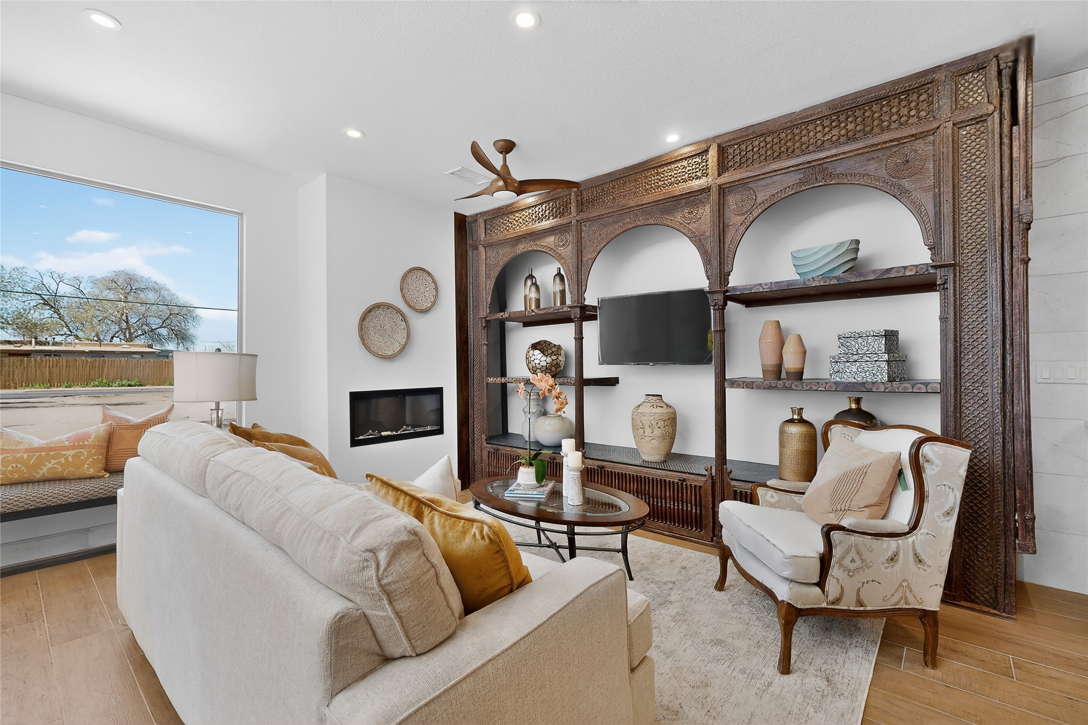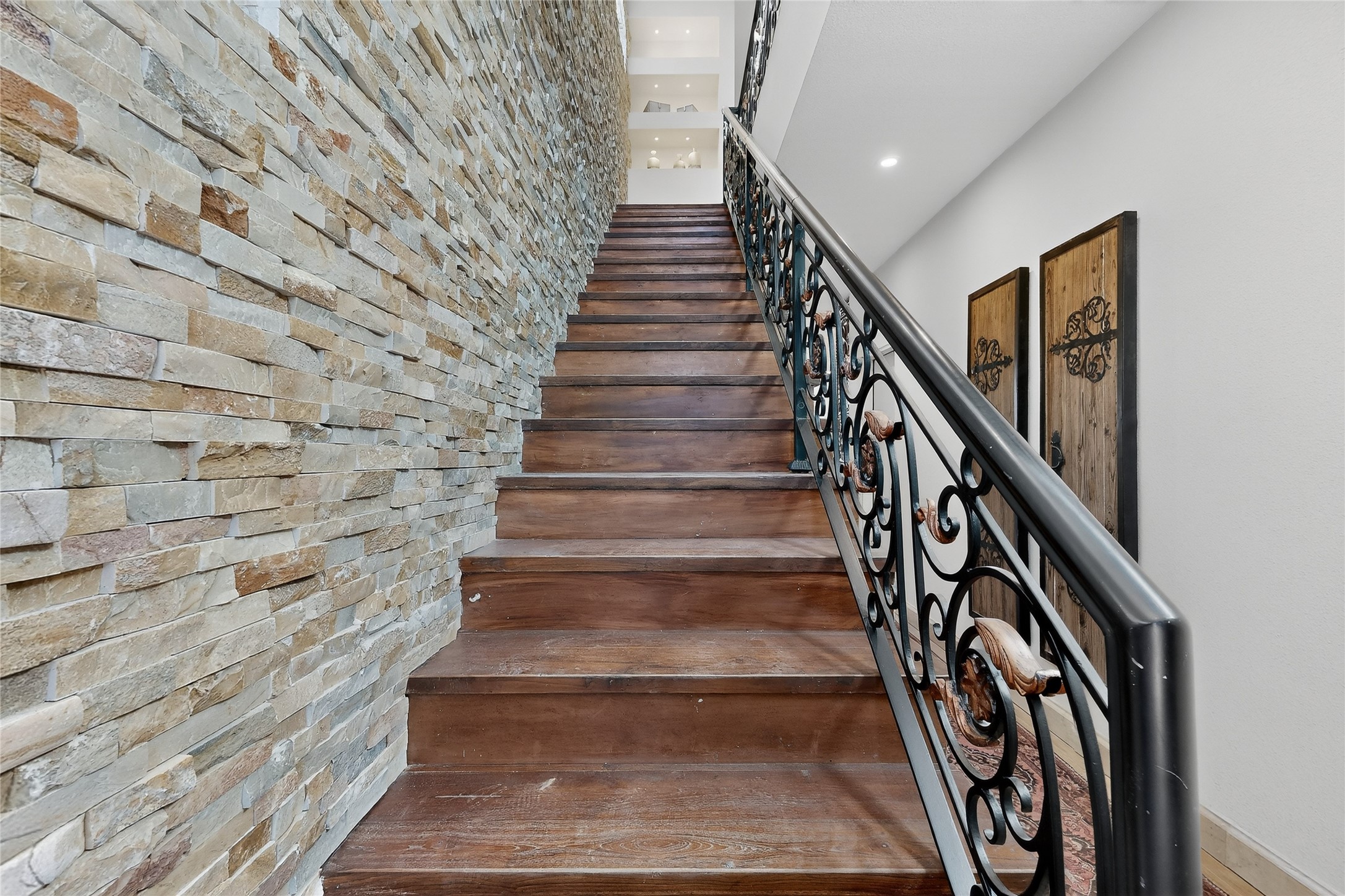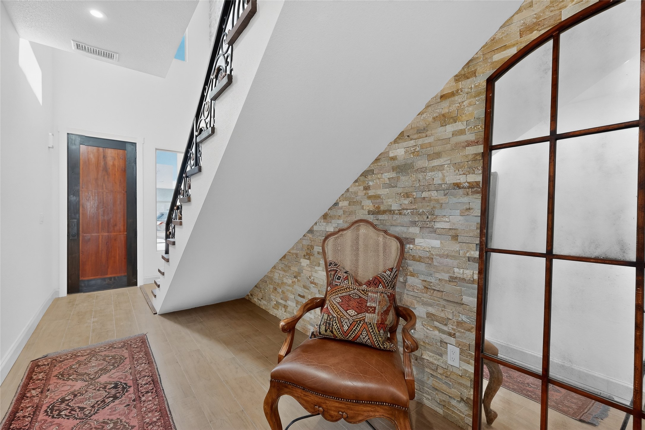 Old world craftsmanship blends seamlessly with modern luxury at the Estancia Collection, a unique compound located in the Baca Railyard District, minutes from Santa Fe's top galleries and restaurants. This latest vision of renowned developer Mitch Menaker, is where every room becomes a work of living art. Curated by artisans from around the world, using hand cut semi-precious stone, tiles, iron, and rare wood finishes creates a truly immersive and peaceful experience, as if being hugged by nature. As you enter the sanctuary, a profound sensory experience awaits: a 20-foot Anasazi-style wall creates awe and naturally anchors the home. Inside are hand-carved teak doors, alder kitchen cabinets artisan-crafted in Mexico, and Italian marble countertops inlaid with semi-precious stone, creating a fine art masterpiece. The open concept living area features a 250-year-old triple-arch entertainment center that mimics the arcade of an ancient palace. Ascending the staircase is like gliding through a canyon of stone to the bedroom suites above. The primary bedroom greets you through a charming speakeasy door. This light-filled sanctuary features a fireplace, an antique carved wooden ceiling, a wet bar and a one of a kind spa-like bathroom with blue agate sinks, set on backlit white onyx countertops. The tub/shower, surrounded by stunning backlit blue agate panels, creates a luxurious and luminous retreat. The second light-filled bedroom features a bathroom with a hand-carved Mexican vanity and petrified wood sink atop a white onyx counter. The museum-quality shower/tub is framed in petrified wood squares, hand-assembled to create a puzzle pattern.The laundry room, located on the 2nd floor includes a dog shower covered with "happy dog" faces on each hand cut tile. Blending ancient techniques with the expert hands that brought them to life, the developer's vision has created the most unique visual and artistic sanctuary Santa Fe has seen in years.