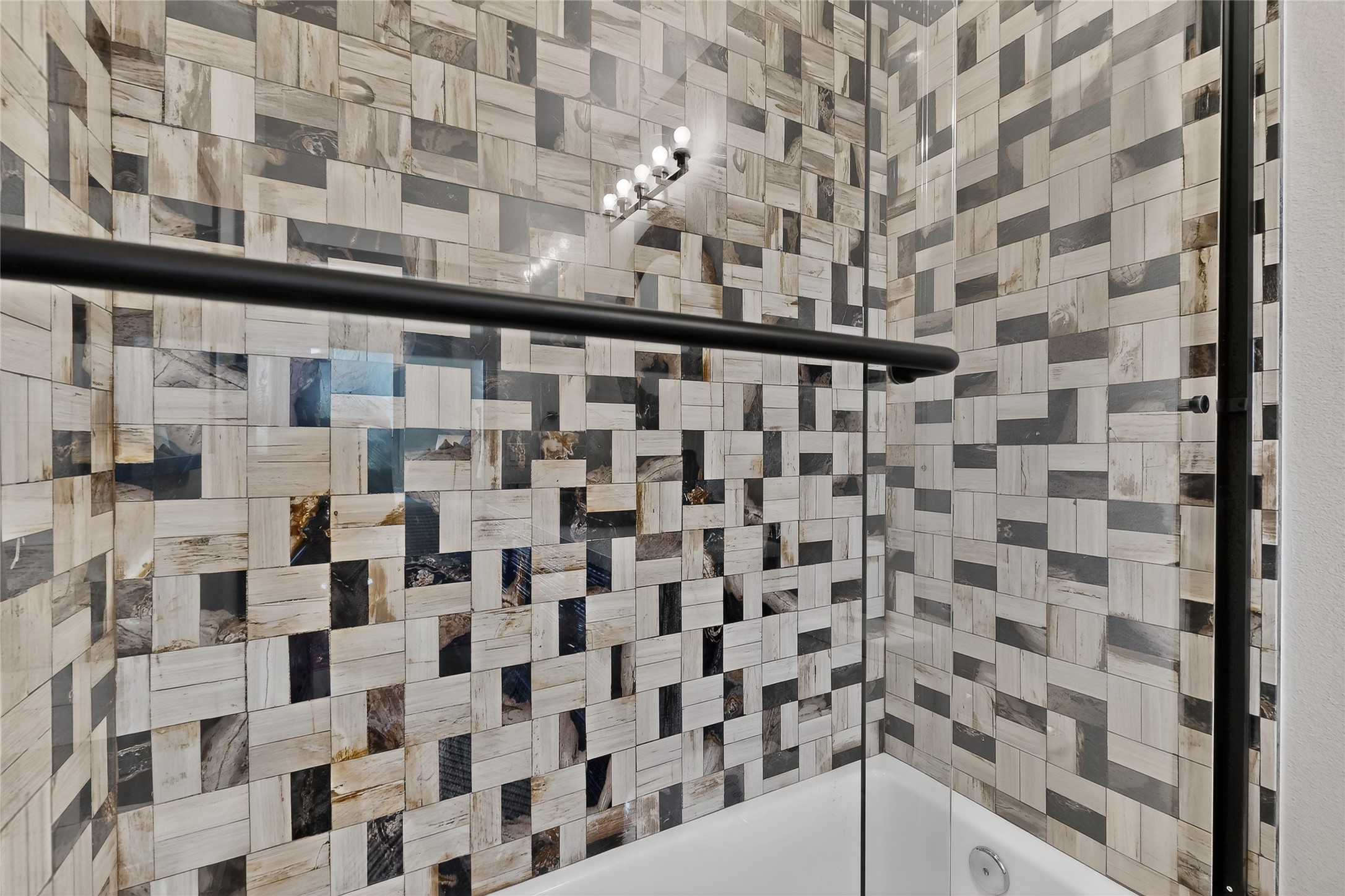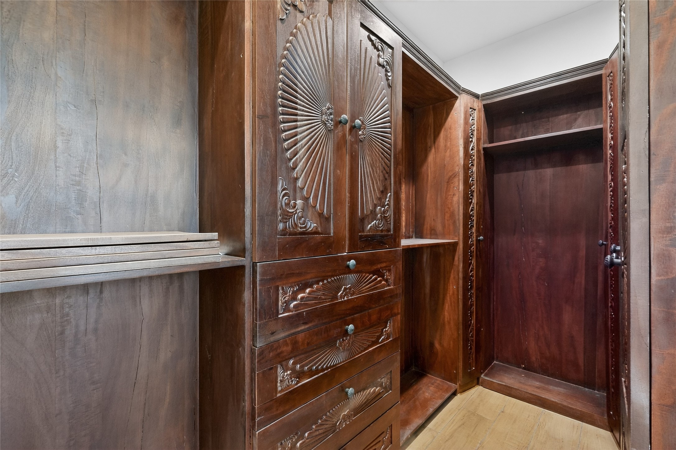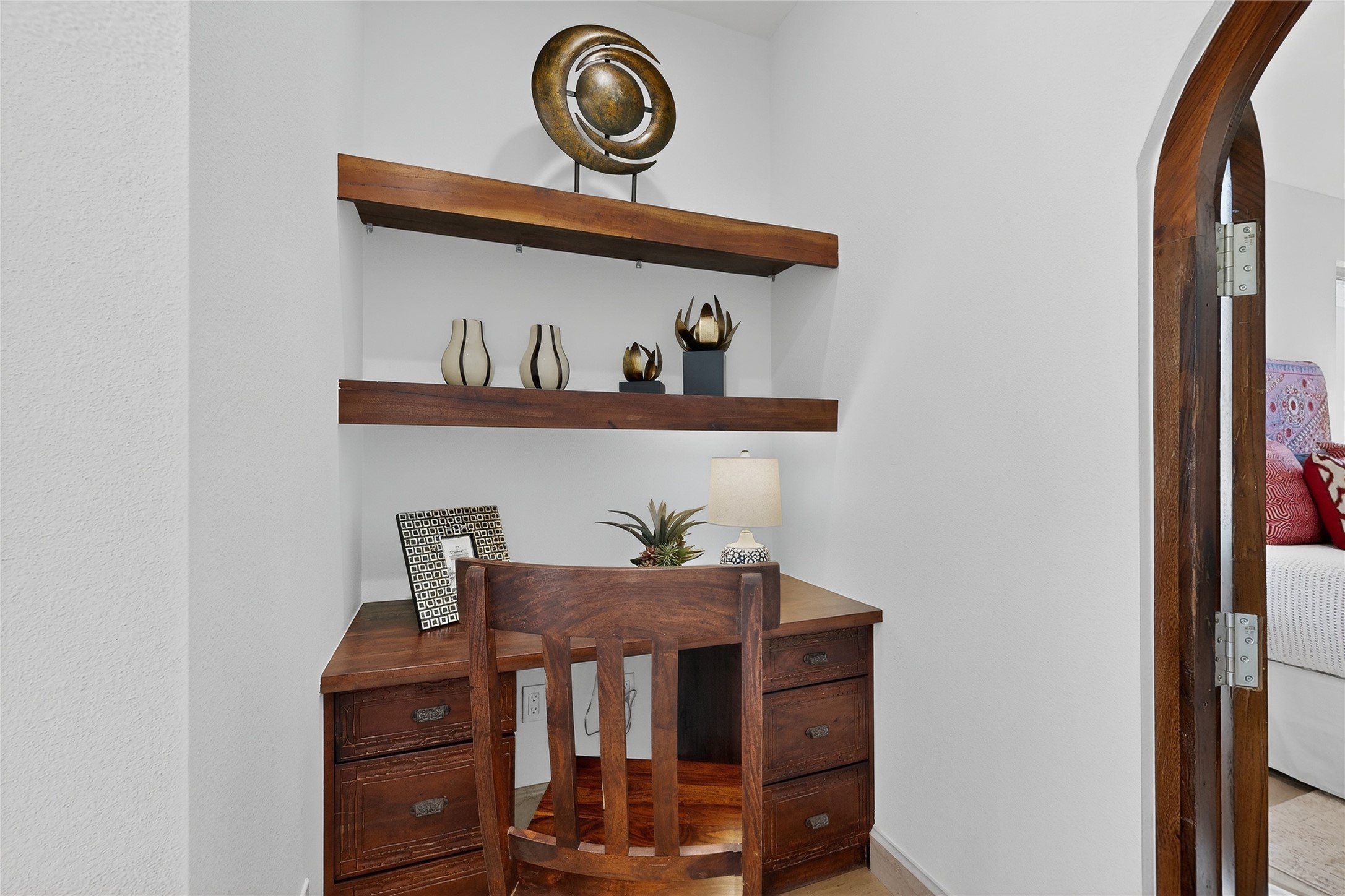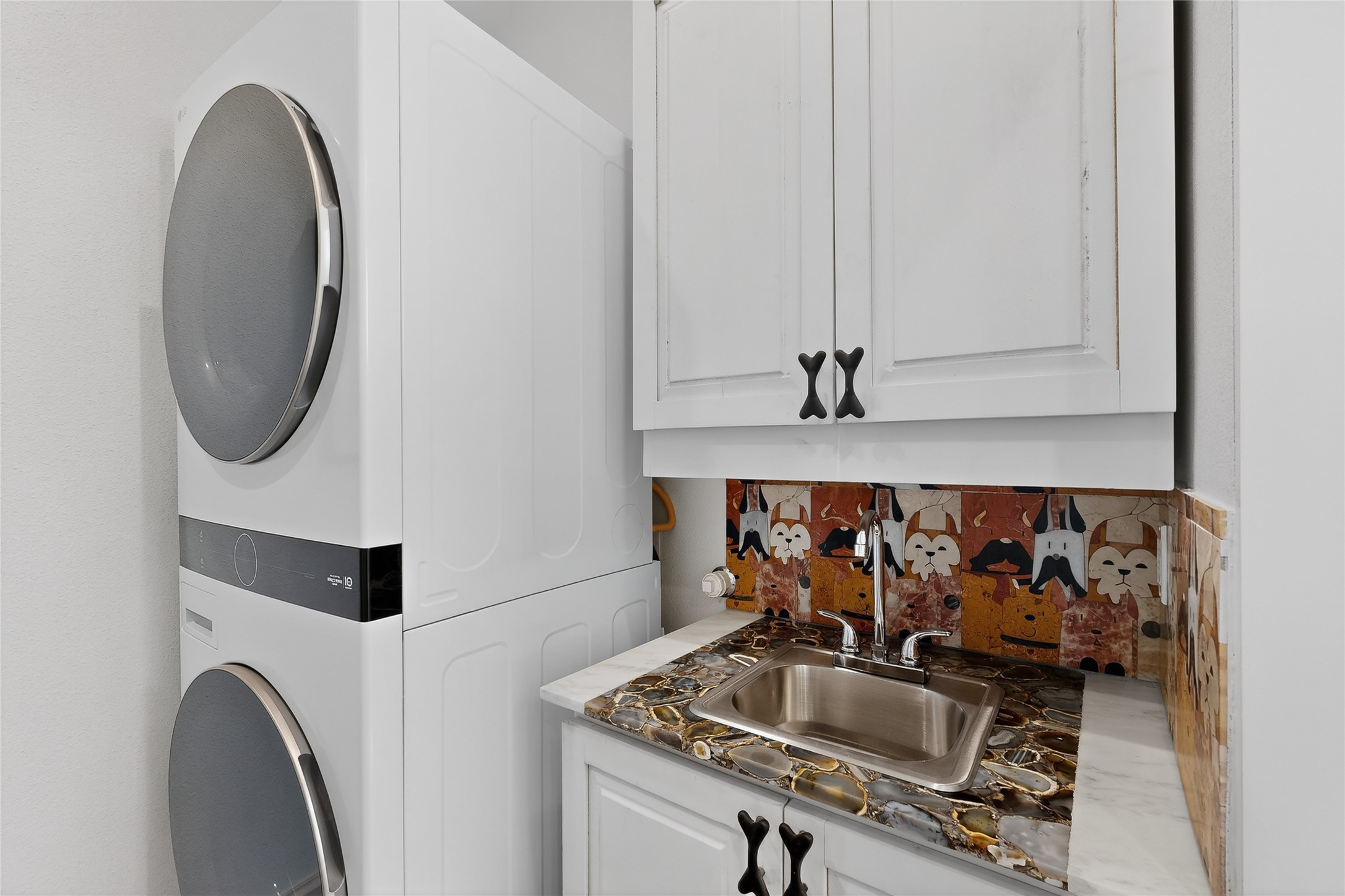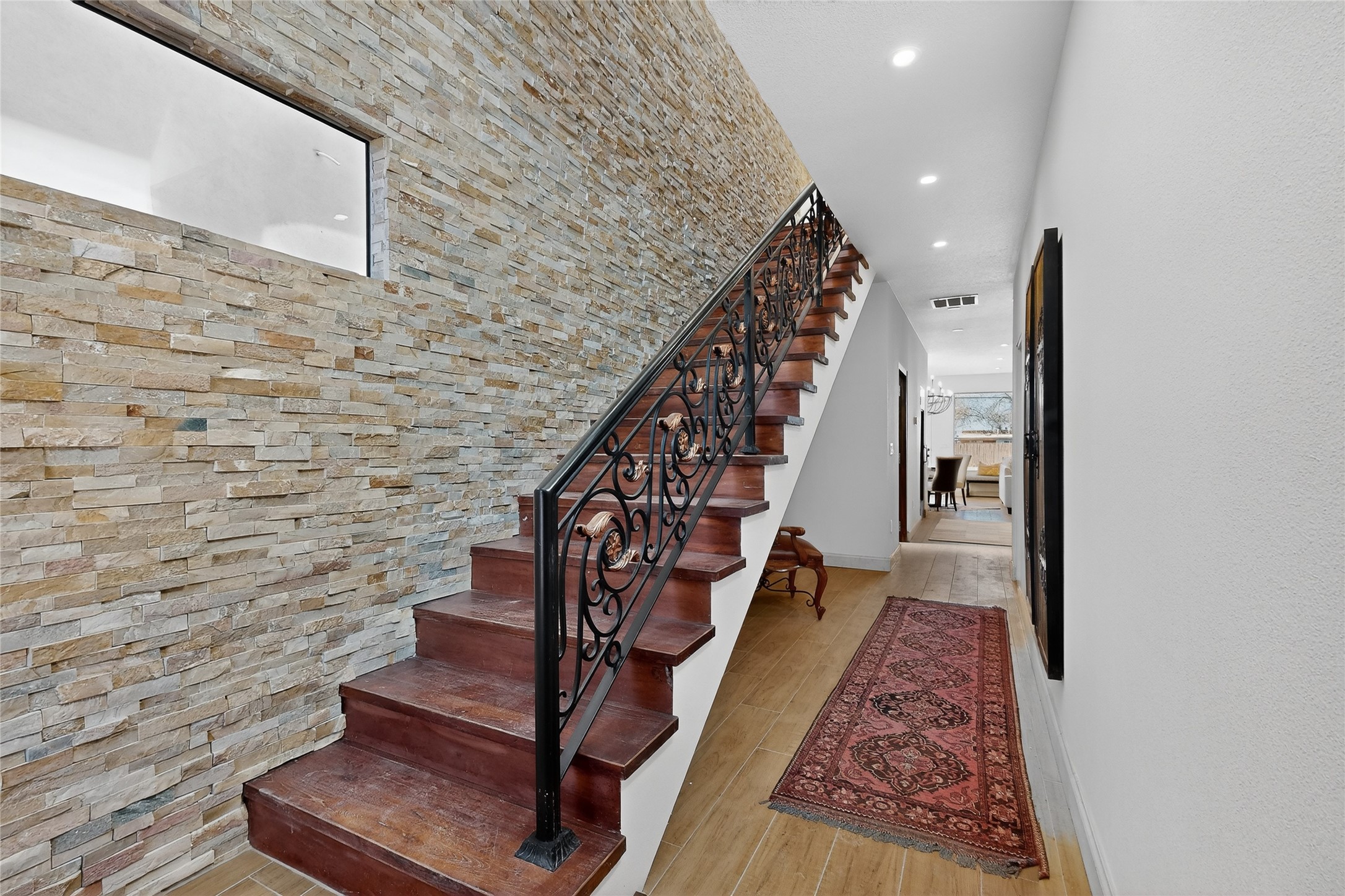 Old world craftsmanship blends seamlessly with modern luxury at the Estancia Collection, a unique compound located in the Baca Railyard District, minutes from Santa Fe's top galleries and restaurants. This latest vision of renowned developer Mitch Menaker, is where every room becomes a work of living art. Curated by artisans from around the world, using hand cut semi-precious stone, tiles, iron, and rare wood finishes creates a truly immersive and peaceful experience, as if being hugged by nature. As you enter the sanctuary, a profound sensory experience awaits: a 20-foot Anasazi-style wall creates awe and naturally anchors the home. Inside are hand-carved teak doors, alder kitchen cabinets artisan-crafted in Mexico, and Italian marble countertops inlaid with semi-precious stone, creating a fine art masterpiece. The open concept living area features a 250-year-old triple-arch entertainment center that mimics the arcade of an ancient palace. Ascending the staircase is like gliding through a canyon of stone to the bedroom suites above. The primary bedroom greets you through a charming speakeasy door. This light-filled sanctuary features a fireplace, an antique carved wooden ceiling, a wet bar and a one of a kind spa-like bathroom with blue agate sinks, set on backlit white onyx countertops. The tub/shower, surrounded by stunning backlit blue agate panels, creates a luxurious and luminous retreat. The second light-filled bedroom features a bathroom with a hand-carved Mexican vanity and petrified wood sink atop a white onyx counter. The museum-quality shower/tub is framed in petrified wood squares, hand-assembled to create a puzzle pattern.The laundry room, located on the 2nd floor includes a dog shower covered with "happy dog" faces on each hand cut tile. Blending ancient techniques with the expert hands that brought them to life, the developer's vision has created the most unique visual and artistic sanctuary Santa Fe has seen in years.