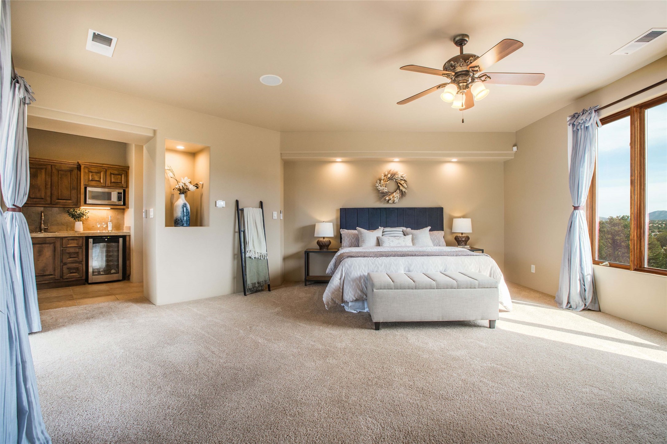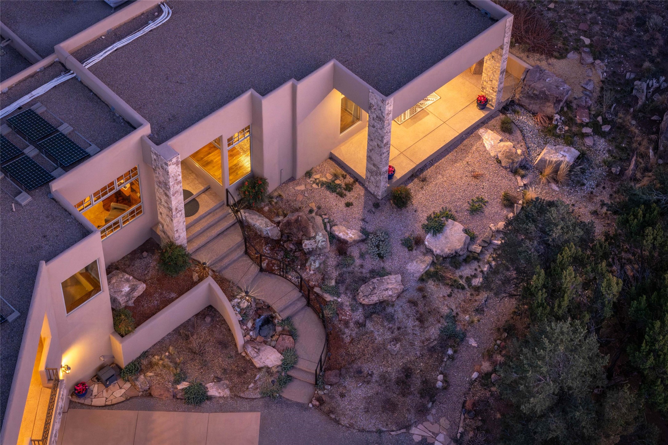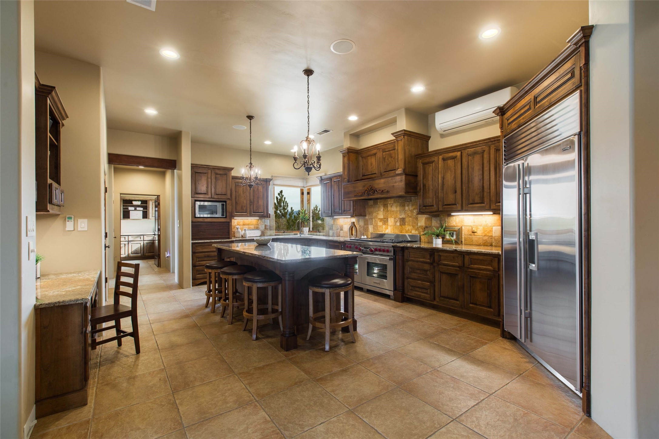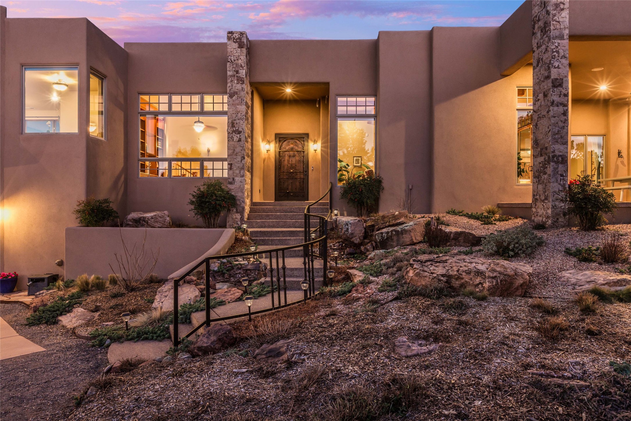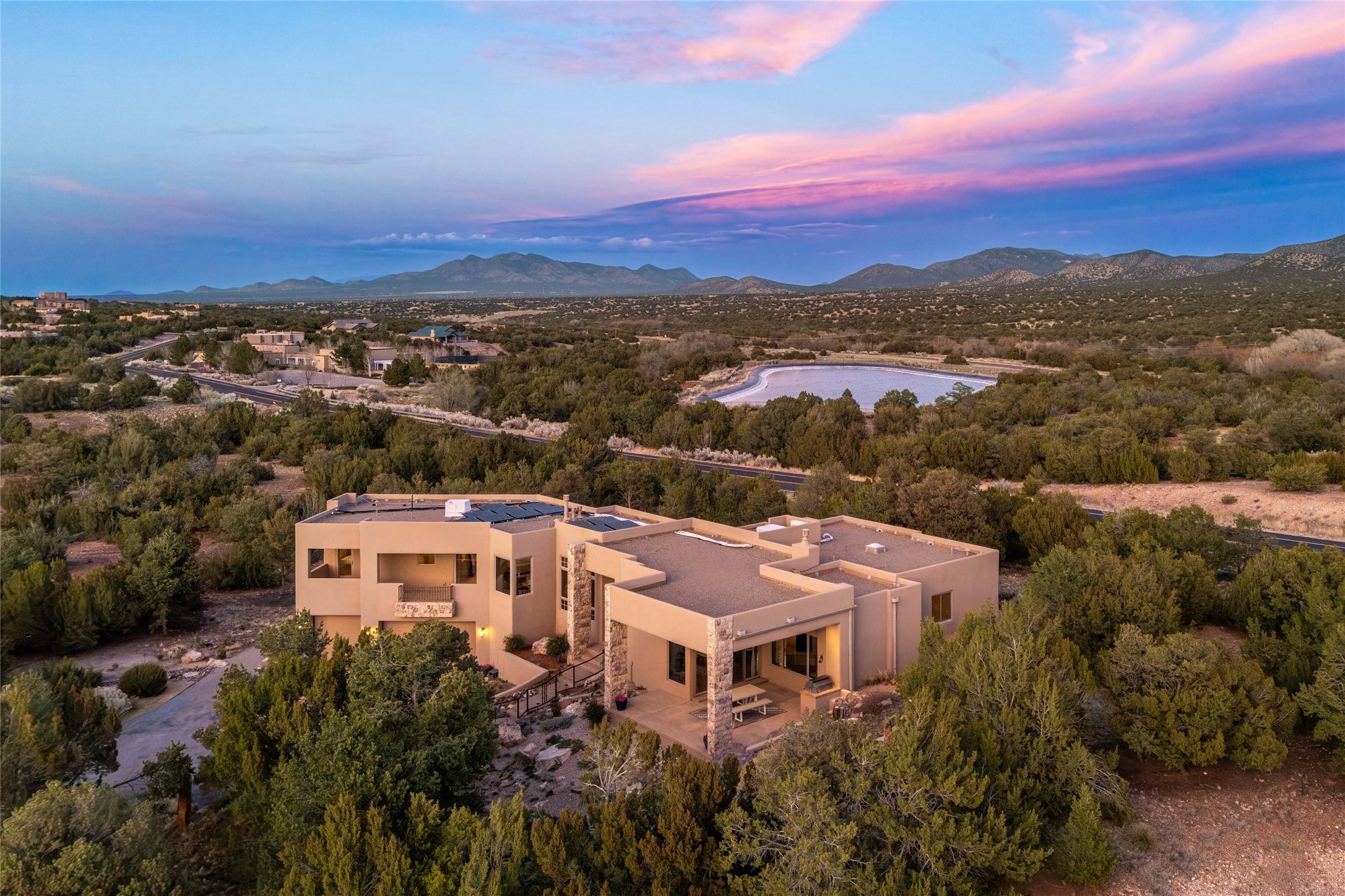 OPEN HOUSE 3-15 from 2-4pm. The outside and the inside meet in this superb warm Contemporary design. Wood, stone and glass elements and views from every room. Custom Harwell home; nestled in Paa-Ko with breathtaking Sandia and Placer Mountain views. Soaring ceilings with elegant wood beams, striking travertine accent walls, a multi-sided gas fireplace, and hand-scraped cherry hardwood floors. The gourmet kitchen boasts custom knotty alder cabinetry, and Wolf & Subzero pro-style appliances. Elegant dining room flanked by a fireplace one one side and large windows on the other is an inviting space and is separated from the kitchen by a convenient wet bar. Plush primary suite, in its own wing for ultimate privacy, offers a coffee bar, gas fireplace, sitting rm,spa-like bath, and private balcony. A gorgeous library features custom wood floor-to-ceiling shelving makes an excellent office. Two additional bedrooms on the opposite side of the home with a large full bath between. Enchanting outdoor spaces include a covered patio, courtyard, nature trail, and water features. Oversized 3-car garage. Owned Solar. The Paa-Ko community features a renowned golf course and a golf club with beautifully situated restaurant overlooking the course with the pond and mountains in the background. Additionally, there is a community pool, tennis courts and clubhouse. All of these amenities are within walking distance of the home. Living in this home is truly living New Mexico.