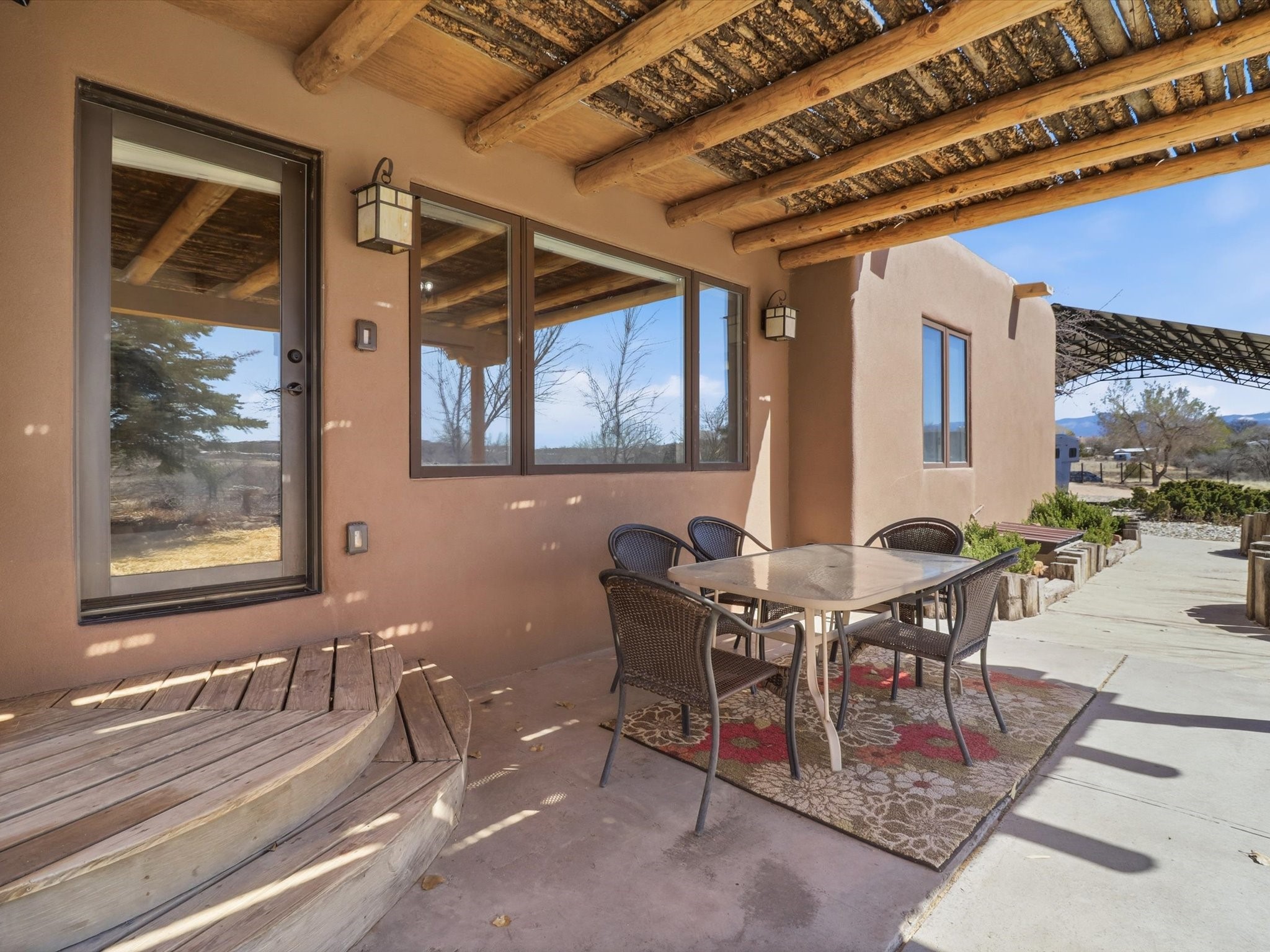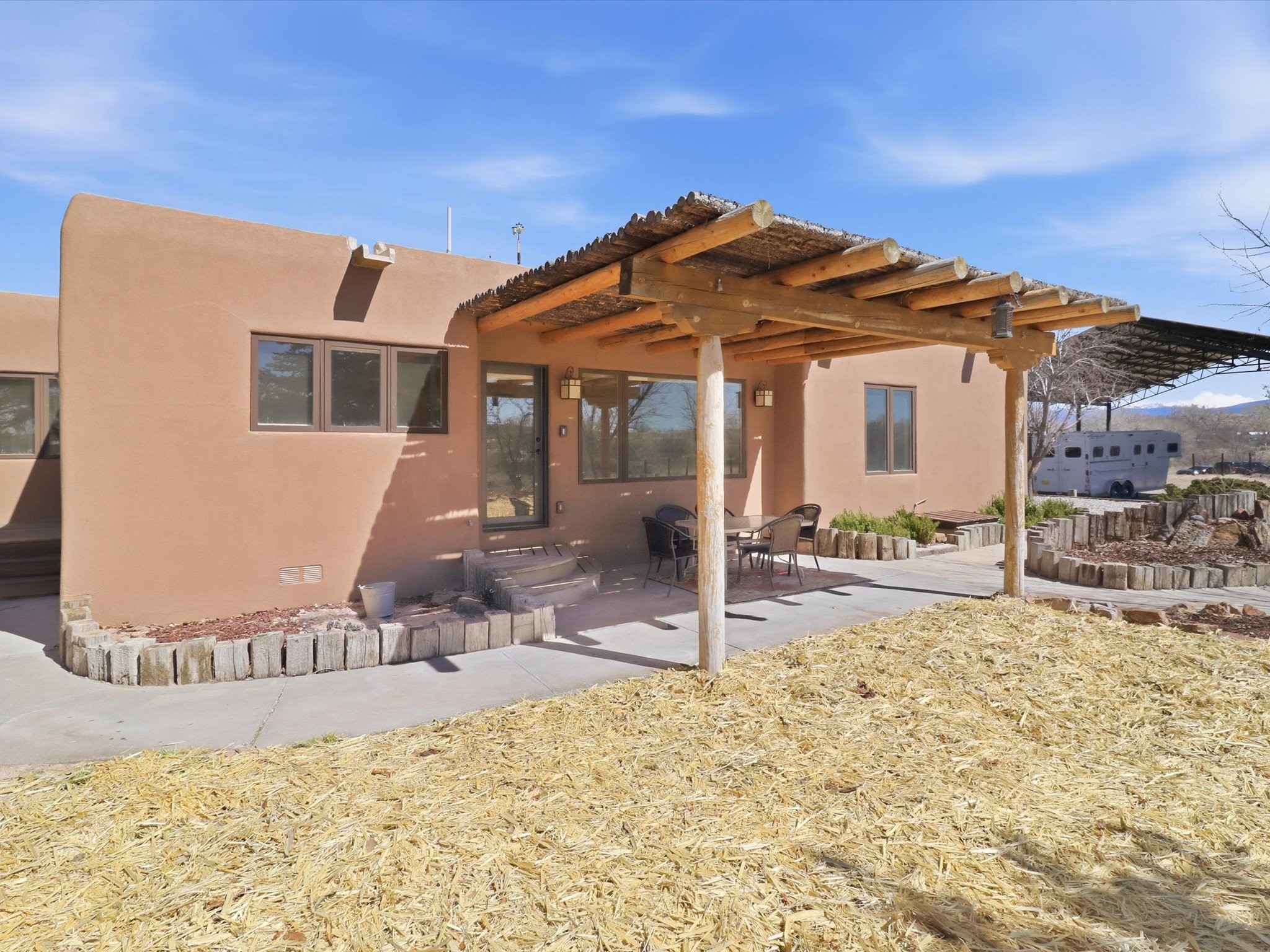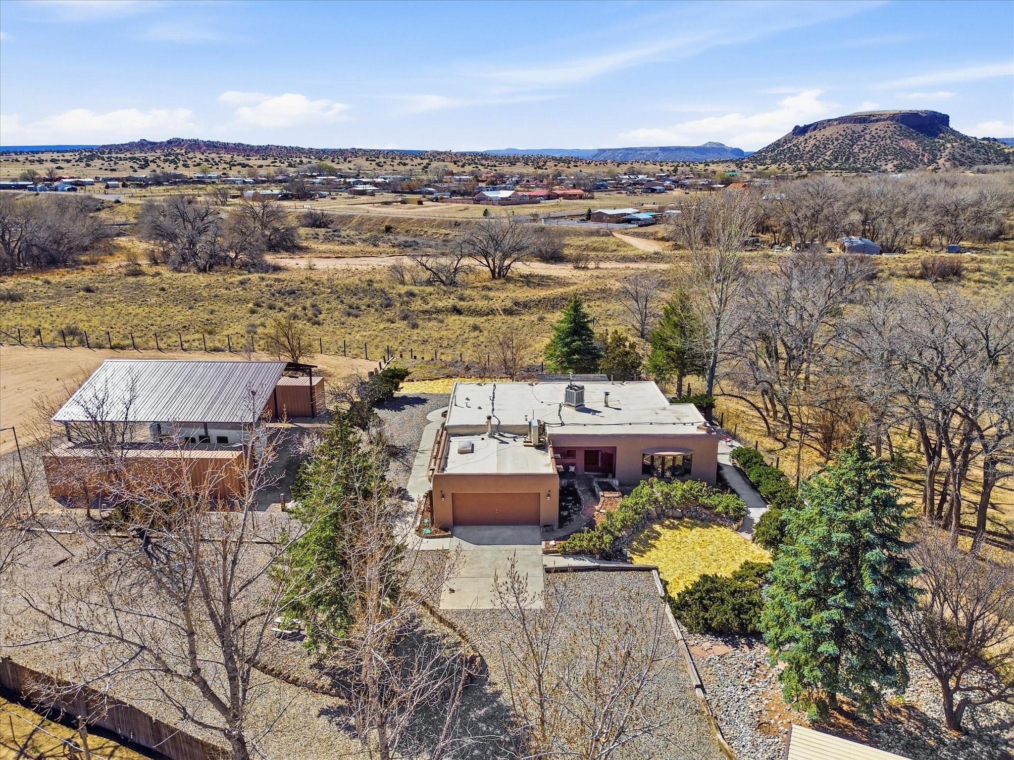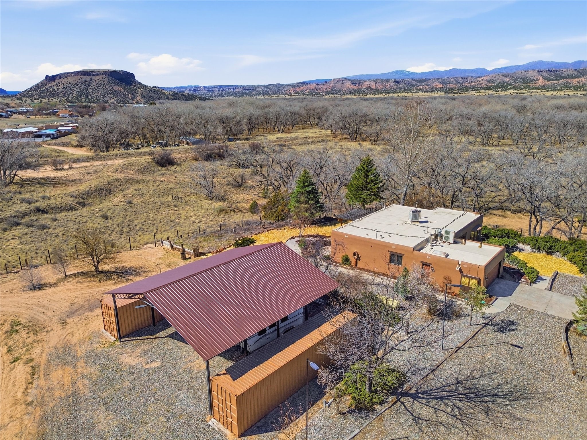 La Mesilla Retreat with Black Mesa Views! Maintained and thoughtfully updated, this peaceful La Mesilla retreat offers space, privacy, and stunning views of Black Mesa while backing directly to Pueblo land. Set on horse-friendly property, this home combines rural charm with convenient access to Los Alamos, Espaola, and Santa Fe. Inside, the home features 3 bedrooms and 2 updated bathrooms, along with newer laminate flooring throughout much of the living space. Two comfortable living areas showcase beautiful tongue-and-groove ceilings with exposed beams, creating warmth and character. There is a kiva fireplace in the main area and a Blaze King wood burning stove in the den. The primary bedroom continues the rustic charm with its own wood ceiling and beams. Major updates include a new TPO roof installed Winter of 2025 with a transferable warranty, new septic tank installed in the Fall of 2025, and Mitsubishi mini-split systems that provide efficient heating and cooling year-round. The outdoor space is ideal for those seeking room to spread out. Horse facilities include a stall with water and electricity, a chicken coop, and open space perfect for animals or gardening. Mature landscaping enhances the setting, while the property's position backing to Pueblo land provides privacy and uninterrupted views. For storage and functionality, the property includes two large 40' storage containers that bookend a 40' x 40' carport, plus an additional carport for extra vehicles or equipment. If you're looking for space, views, and a quiet setting with convenient access to Northern New Mexico's major communities, this La Mesilla property offers a unique opportunity to enjoy country living without sacrificing accessibility.