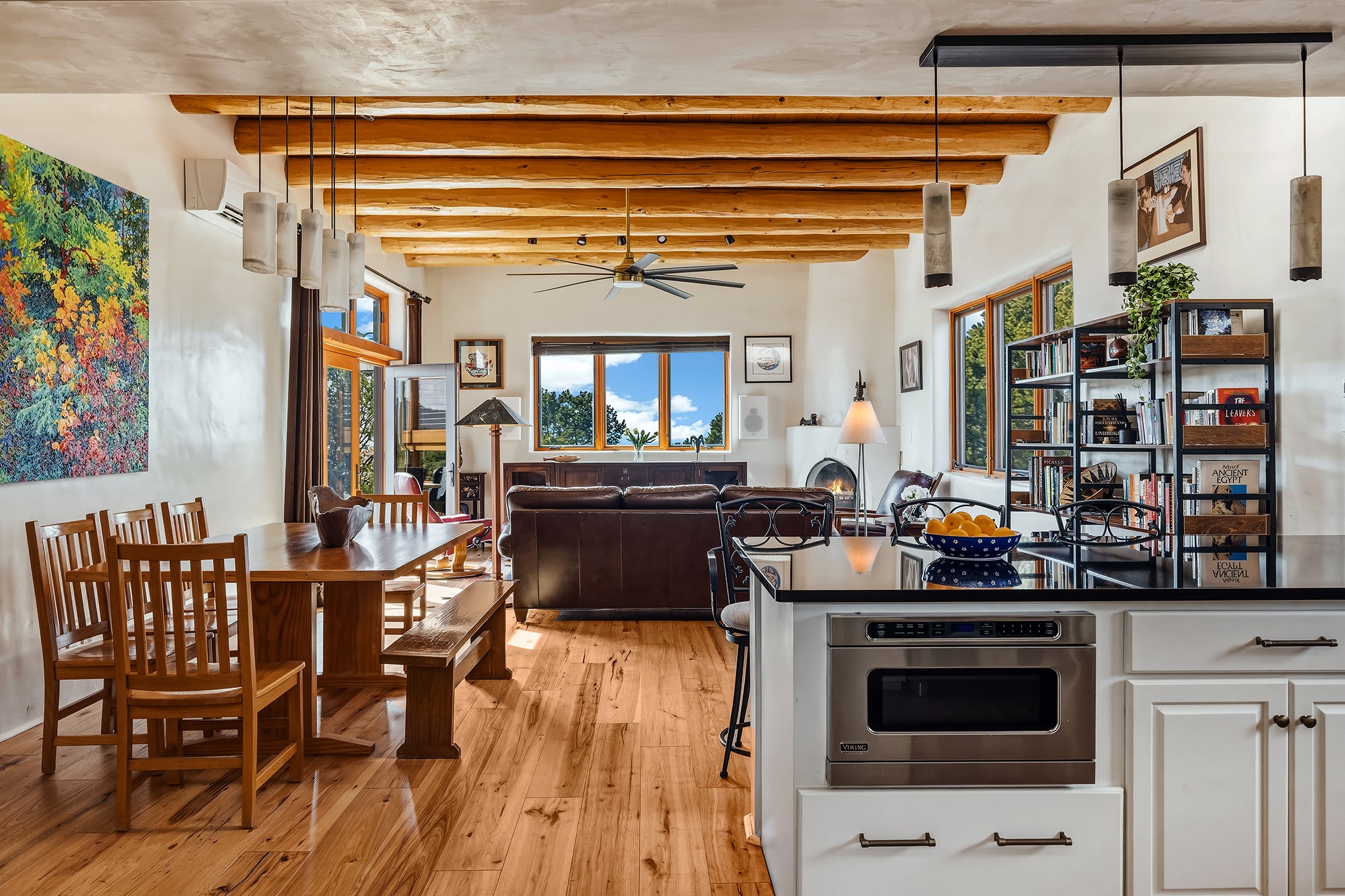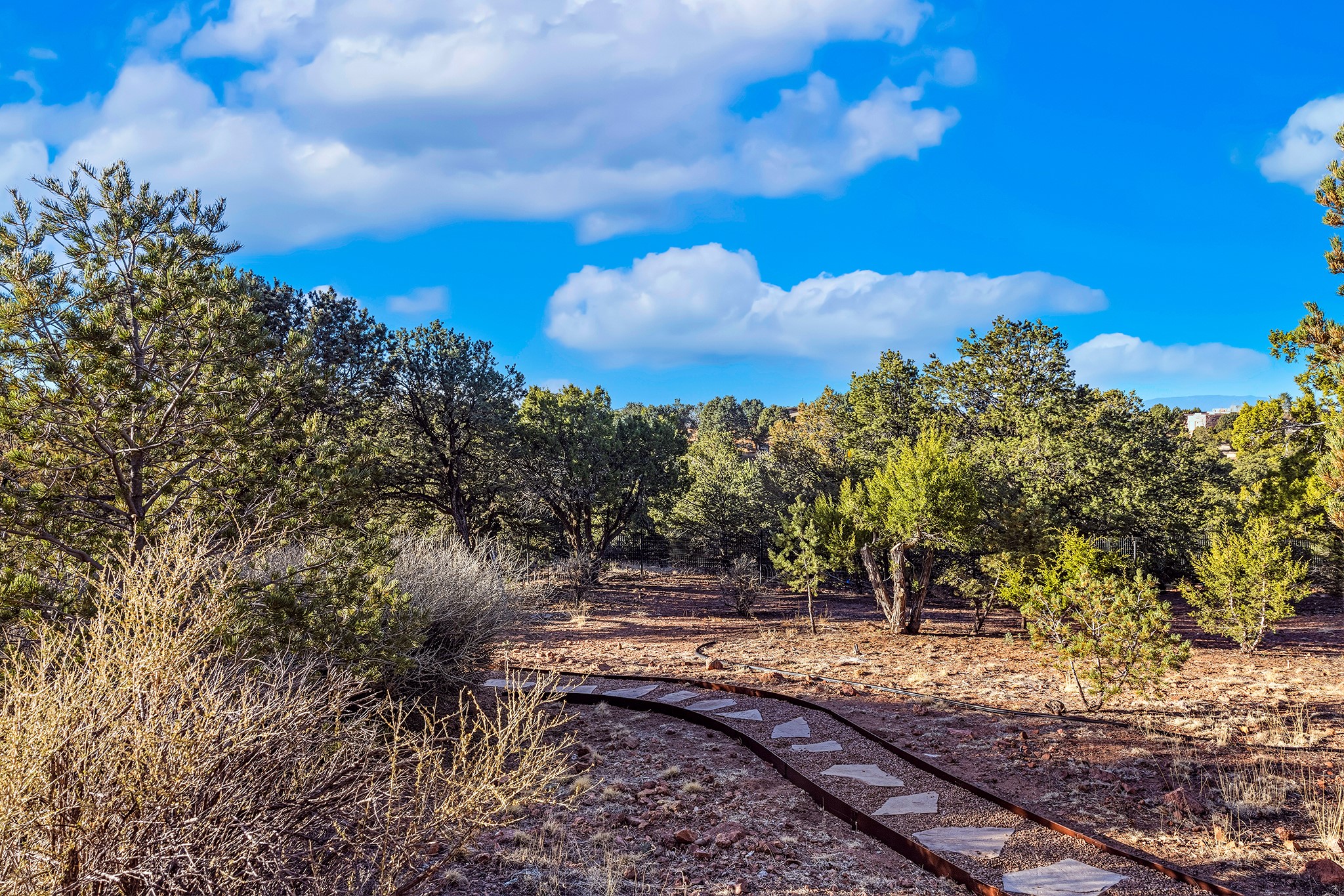 Located in the coveted gated community of Las Vistas and just minutes from the Plaza and downtown, this beautifully renovated 2,905 sq. ft. home offers 4 bedrooms, 3 baths, and an office/den on 2 acres at the end of a quiet cul-de-sac. The property enjoys wonderful views of the Sandia and Jemez Mountains.The open-concept kitchen, living, and dining areas feature new wood flooring, viga ceilings, and a thoughtfully designed chef's kitchen with generous counter space and a bar for casual dining. French doors from the living room open onto a Trex deck ideal for outdoor dining and relaxing while overlooking the fenced acreage, complete with walking paths and peaceful sitting areas.For four-legged family members, the owners have installed a buried electric fence around the perimeter of the property.The upper level hosts the primary suite and two generous guest bedrooms. The primary suite enjoys access to a long balcony perfect for sunset views and stargazing. The two guest bedrooms--one currently used as a gym--share a beautifully renovated bathroom.The lower level connects to the oversized two-car garage and includes a remodeled laundry room with storage, a half bath, and a renovated fourth bedroom with a three-quarter bath and direct access to the yard.Recent upgrades include a new solar array, complete electrical upgrade, mini-split systems, new flooring, a newly rebuilt deck, seven new windows, and a new tankless water heater. The HOA dues of $1,200/year cover water (award-winning community water), road maintenance and gate maintenance. Fiber optic was buried in Las Vistas 5 years ago and the internet is speed is exceptional. With its prime Las Vistas location, extensive renovations, and proximity to downtown Santa Fe, this move-in-ready property offers an exceptional opportunity to immediately enjoy the Santa Fe lifestyle. Located within the Wood Gormley Elementary School District.