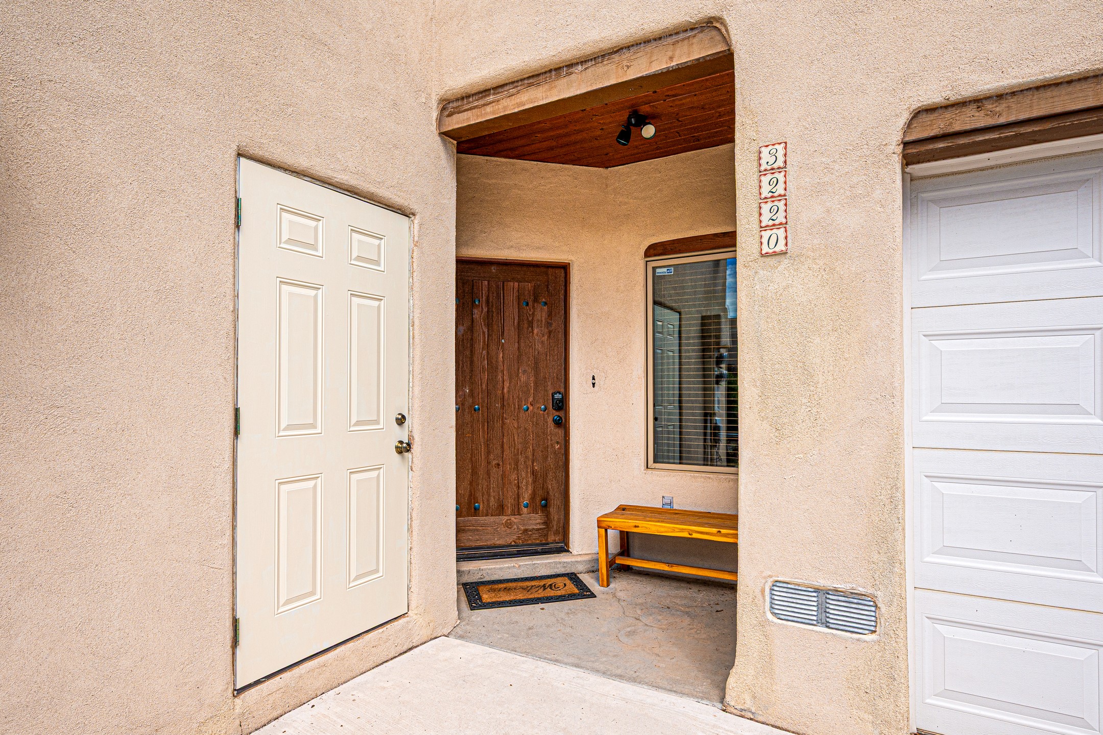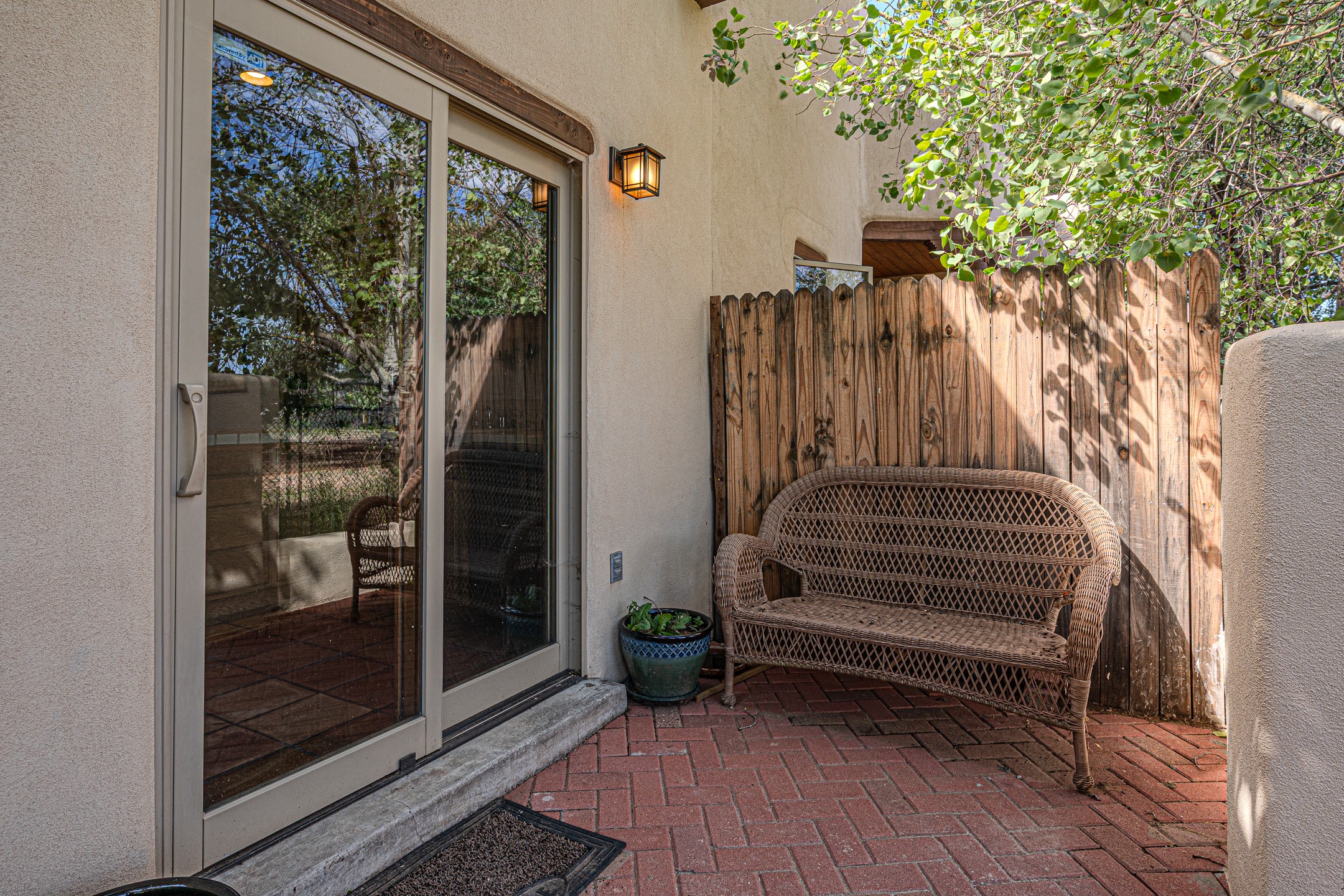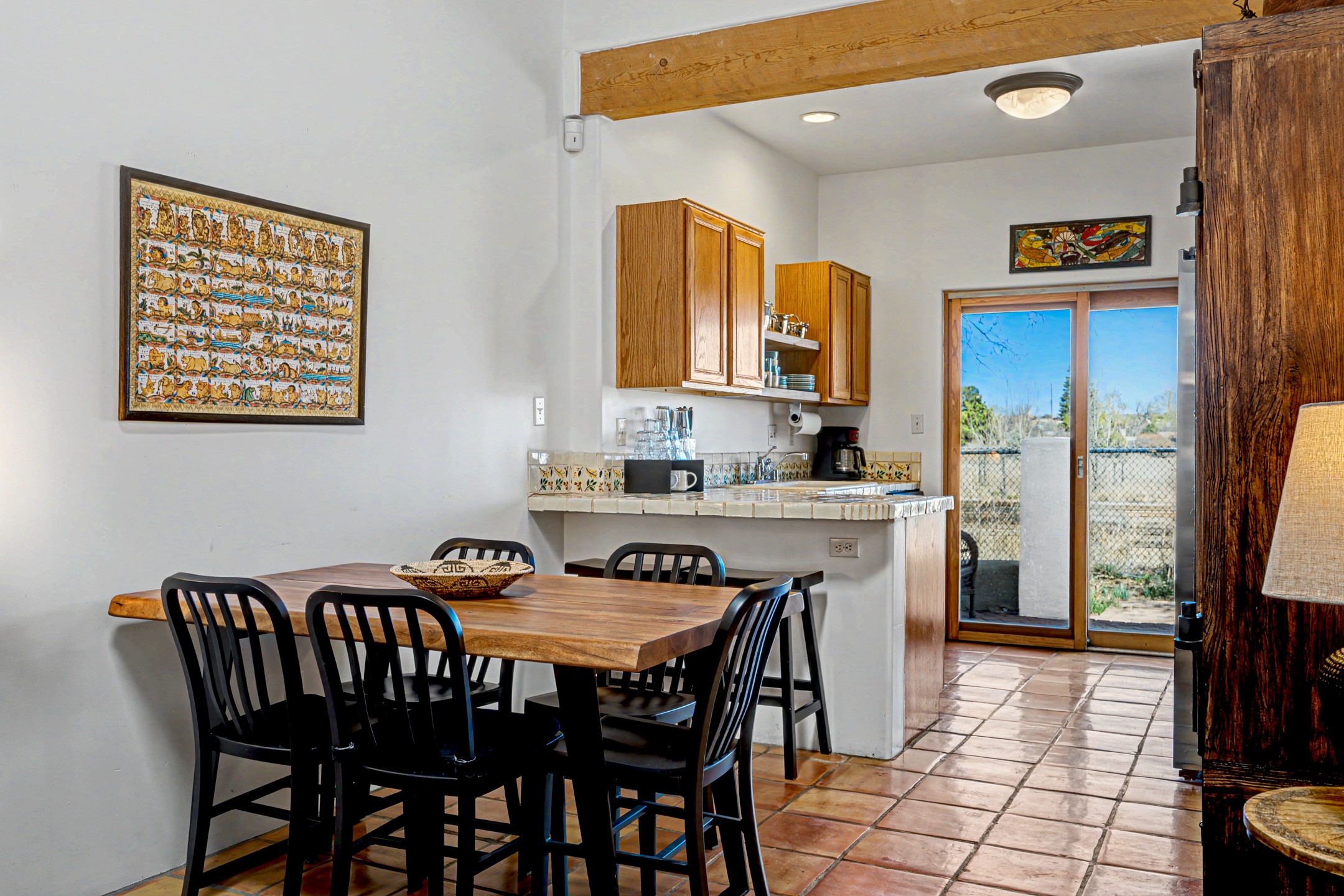 Delightful 2 bedroom, 2 bath condominium in La Paz. Contemporary Pueblo style with Santa Fe detailing featuring high ceilings, exposed vigas, dramatic gas kiva fireplace and gleaming saltillo tile floors. Lovely light filled spaces with great separation between main bedroom suite and guest wing with in floor radiant heating. The updated kitchen leads outside to a walled private patio and garden area lovely for early breakfasts or evening entertainment. In 2023/2024 a new roof, mini split, skylight, washer and dryer, and radon mitigation were installed. New landscaping including a stucco wall, bridge and Acequia retaining walls were also installed. There is direct access to an oversized insulated and finished one car garage and off street parking, plus a guest parking area just around the corner. There is a local community park, plus it is centrally located for dining and shopping, close to bus routes and only minutes from the historic Santa Fe plaza galleries and annual events.